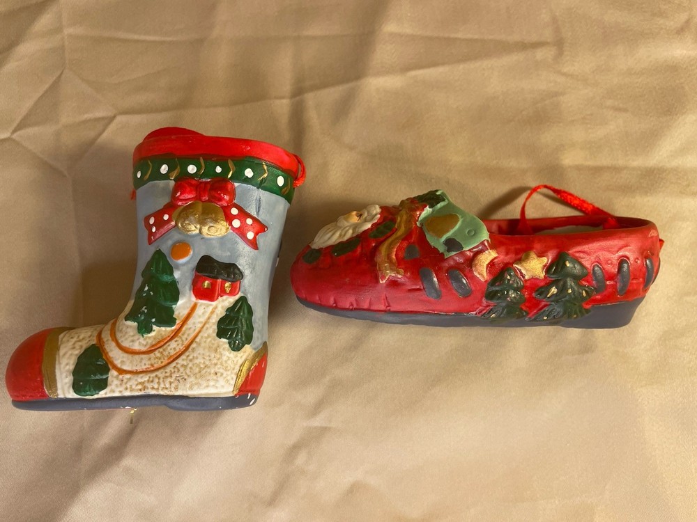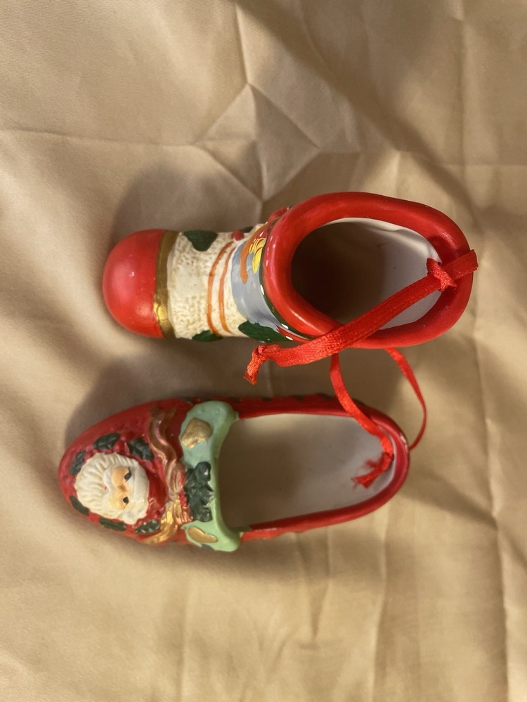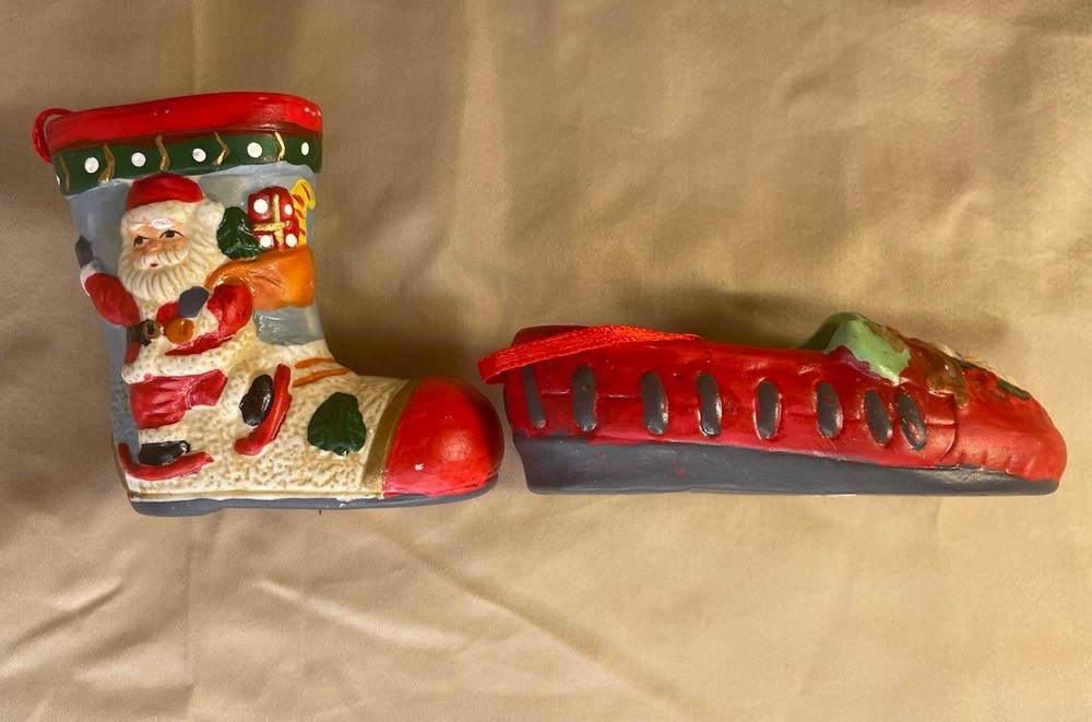 This Vintage Santa Claus Christmas Ornaments Boot and Slipper set includes two ceramic hand-painted ornaments in a classicism style. The ornaments feature an all-over Santa Claus pattern, with a multicolor design and vintage appeal. Each ornament measures 3 inches in height and width, making them a medium-sized addition to any Christmas decor collection. The decorative and limited edition pieces are perfect for adding a touch of nostalgia to your holiday season.