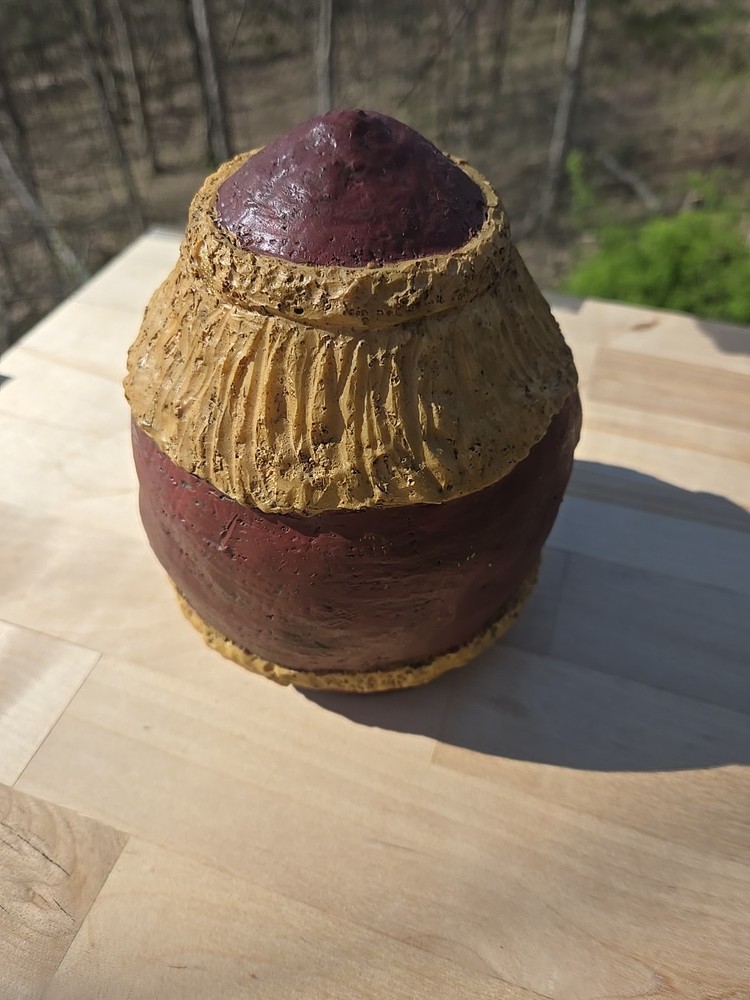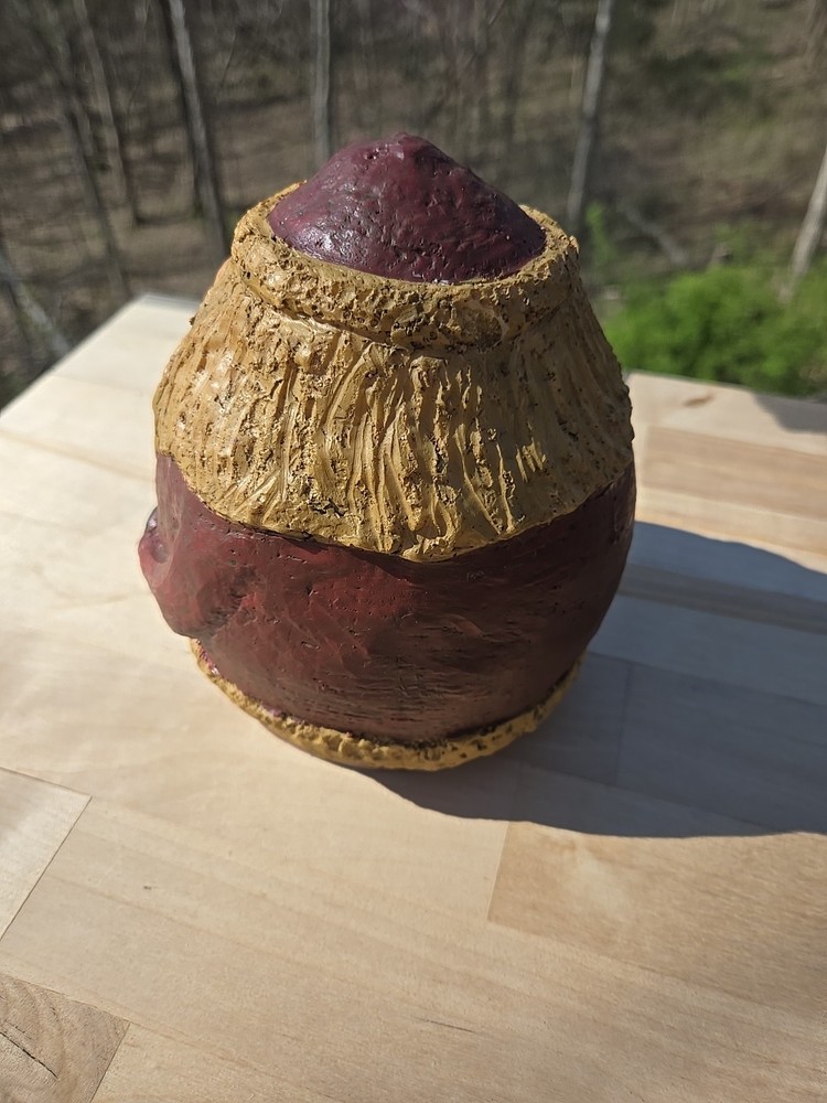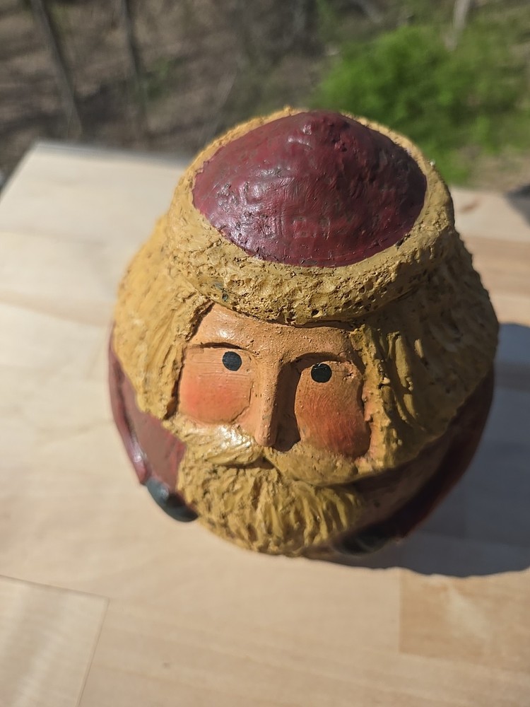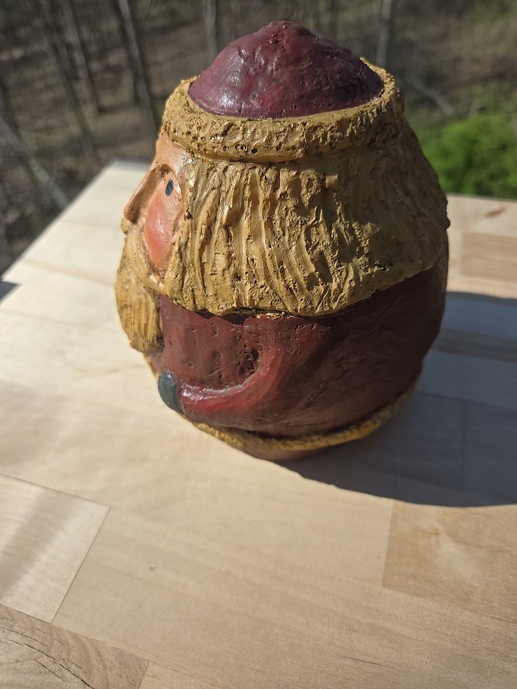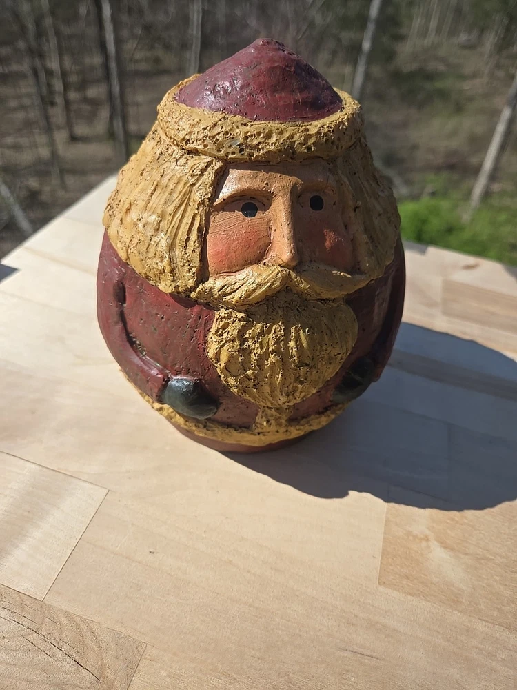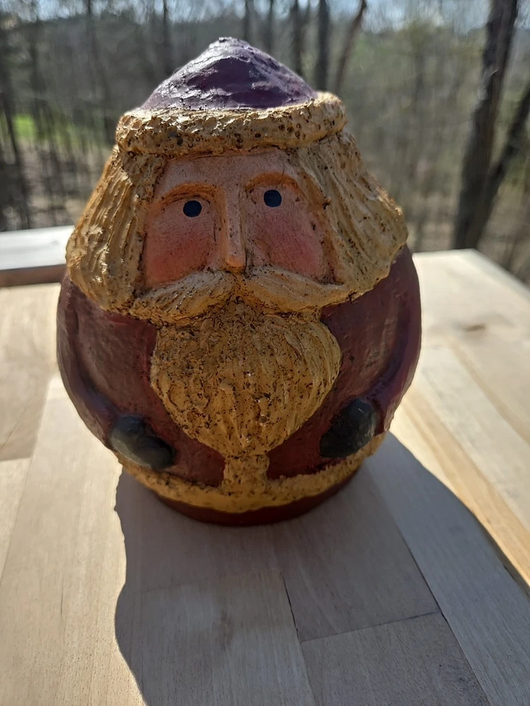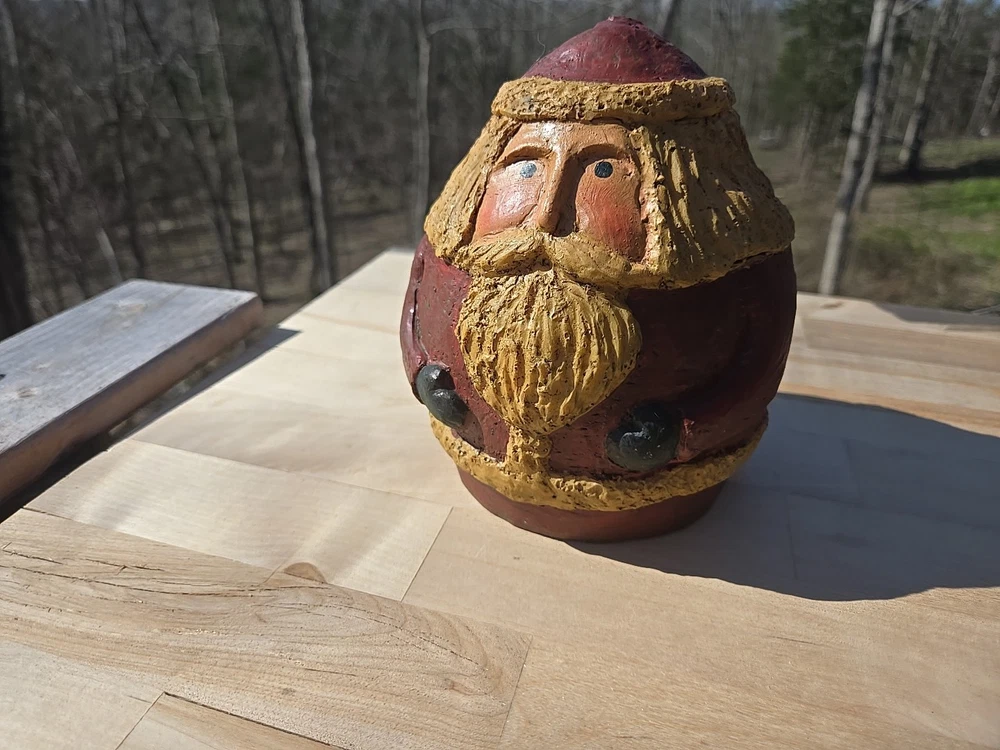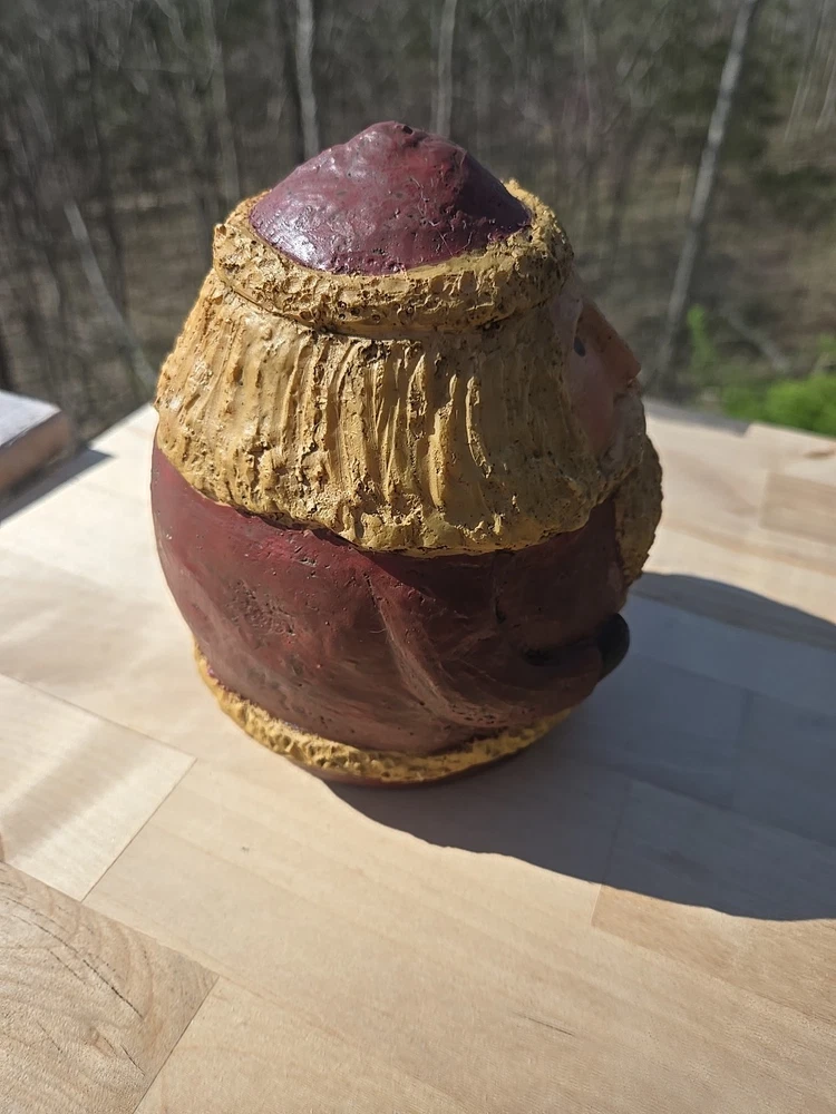 This vintage hand-painted chalkware figurine features a jolly round Santa with a rustic red suit. The medium-sized figurine measures 6x6x6 inches and is perfect for adding some festive art decor to your Christmas collection. The original piece was manufactured in the 1960s and has a unique folk art charm. The figurine is made by Fairfield and is a great addition to any holiday or seasonal collection. The chalkware material adds a unique texture and feel to the piece, while the hand-painted features make it a one-of-a-kind item. Display this rustic Santa figurine on a mantle or shelf to add some holiday cheer to your home.