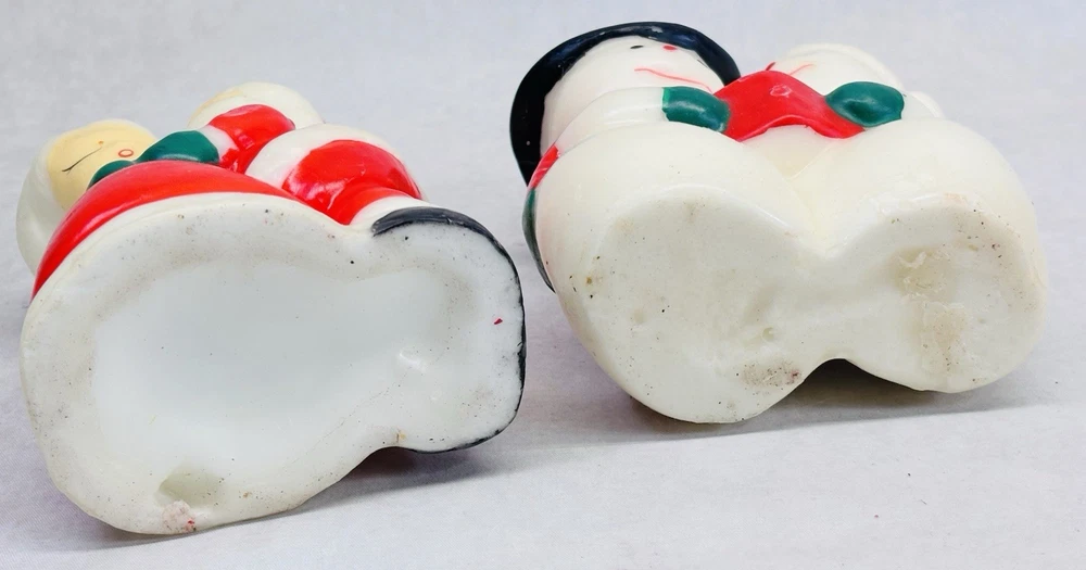 Vintage Santa Mrs Claus Snowman Mrs Snowman Candle Pair Unlit Holiday Decor Vintage molded wax candle pair featuring Santa with Mrs. Claus and Snowman with Mrs. Snowman. Each candle measures approximately 5 inches tall. These are classic holiday figures with hand painted details and a traditional Christmas look. •Vintage candles with exact age unknown •Unlit with original wicks intact •Good overall condition with light surface wear from age and storage •No cracks or breaks observed •Sold as decorative collectibles Please review all photos carefully for condition details, as vintage wax candles may show minor imperfections from age and handling.