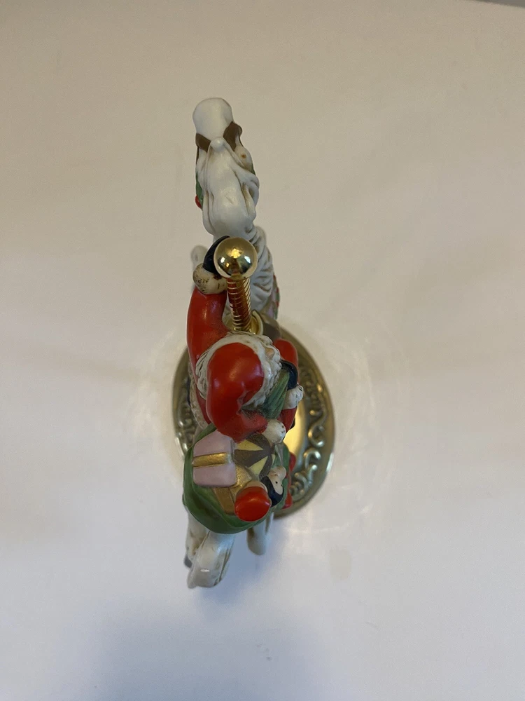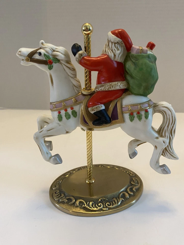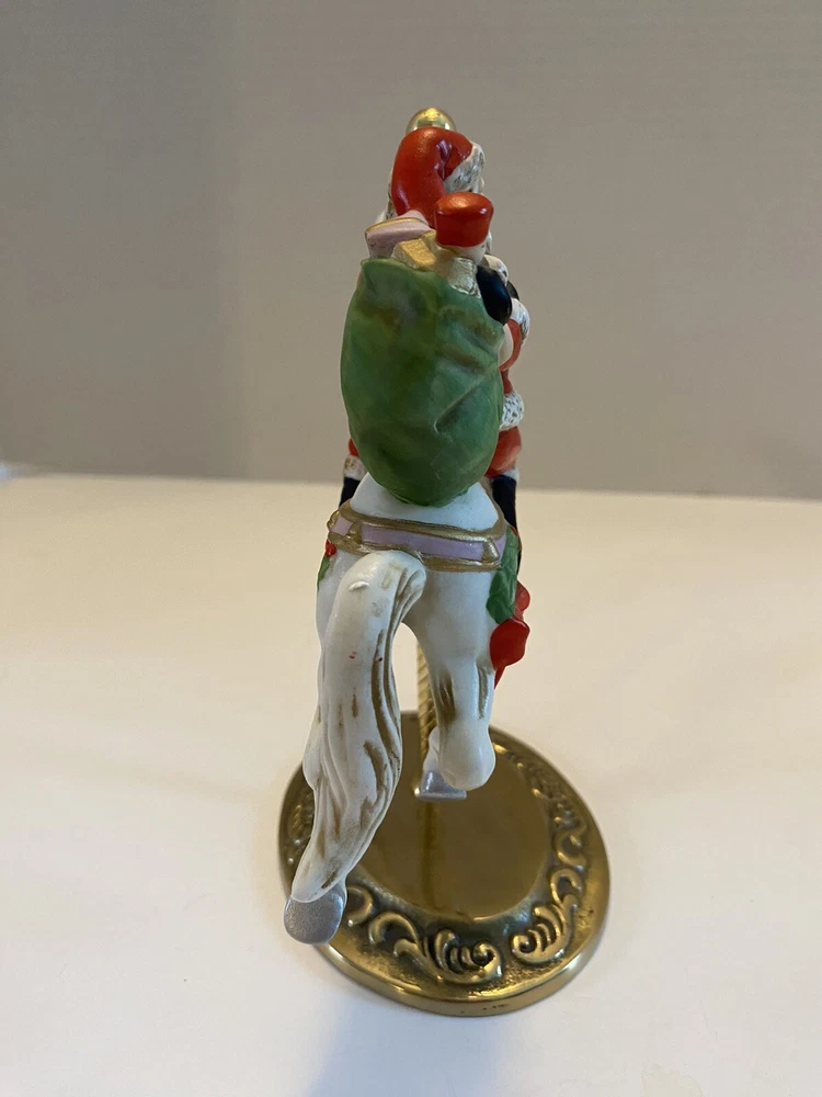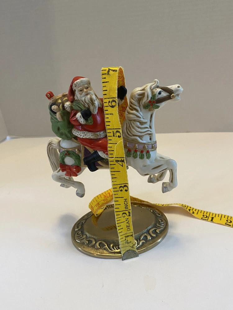 Add some vintage charm to your holiday decor with this lovely Santa riding a carousel horse figurine. The intricately designed figurine features a 3D effect and is hand-painted with vibrant colors that bring it to life. This beautiful Victorian-style piece is perfect for collectors and lovers of all things Christmas. The medium-sized figurine measures 7 inches in length, 7 inches in height, and 3.5 inches in width. It is made of high-quality ceramic and porcelain materials . This original Homco piece from the late 20th century is part of the Carousel collection and features Santa as the main character. No chips or cracks An original Styrofoam.