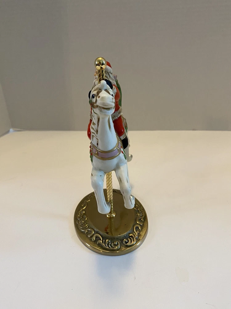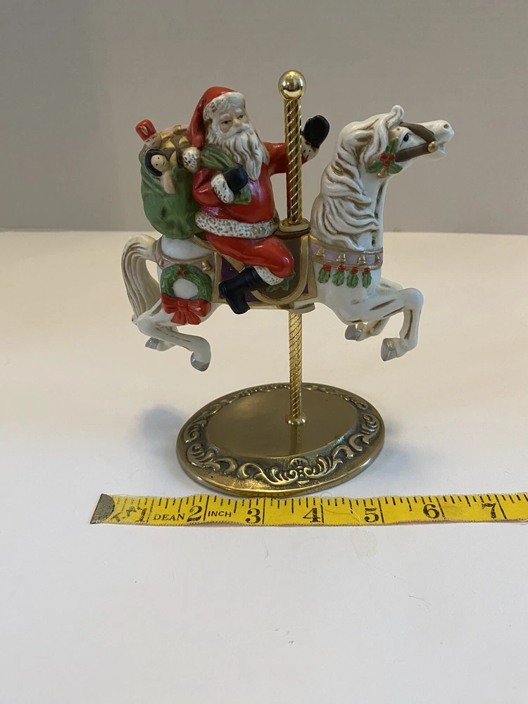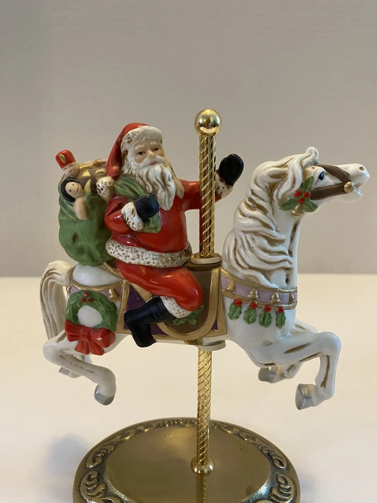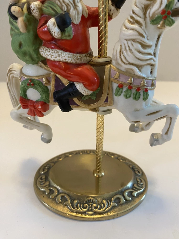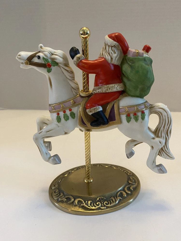 Add some vintage charm to your holiday decor with this lovely Santa riding a carousel horse figurine. The intricately designed figurine features a 3D effect and is hand-painted with vibrant colors that bring it to life. This beautiful Victorian-style piece is perfect for collectors and lovers of all things Christmas. The medium-sized figurine measures 7 inches in length, 7 inches in height, and 3.5 inches in width. It is made of high-quality ceramic and porcelain materials . This original Homco piece from the late 20th century is part of the Carousel collection and features Santa as the main character. No chips or cracks An original Styrofoam.