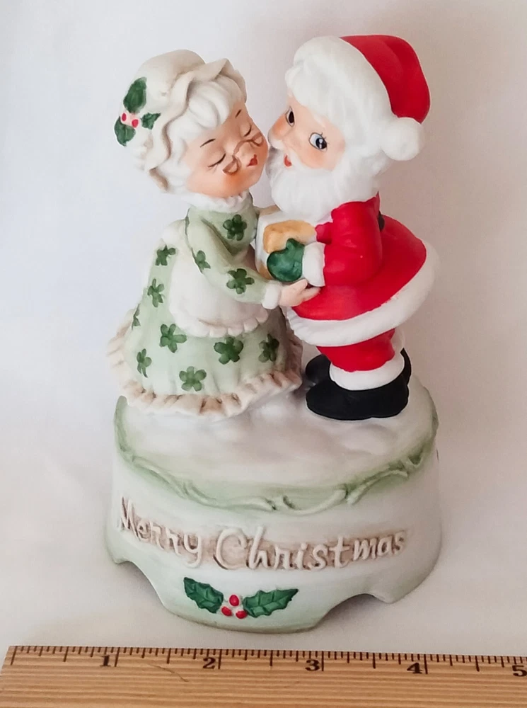 Elevate your festive decor with the charm of yesteryear with this Vintage "Merry Christmas" Santa and Mrs. Claus Dancing Wind Up Music Box. Crafted from high-quality ceramic porcelain, this medium-sized figurine features a delightful dancing scene with a classic matte finish, bringing a touch of nostalgia to your holiday celebrations.The piece is beautifully presented in a red, green, and white color scheme that captures the spirit of Christmas. As a single wind-up music box, it not only serves as a decorative piece but also plays a melodic tune to add an auditory layer to your seasonal decorations. Proudly made in Taiwan, this unbranded collectible is sure to be a conversation starter and a cherished addition to your Christmas tradition.