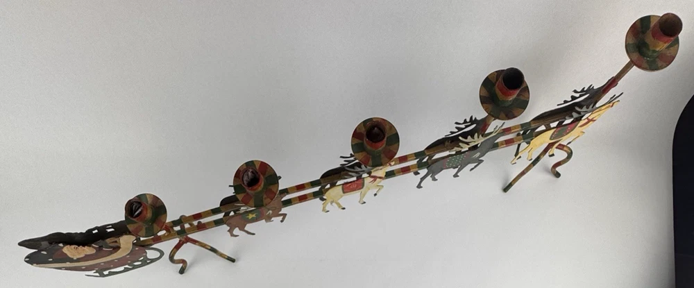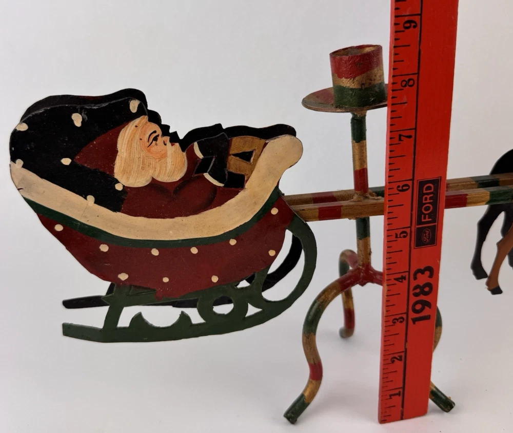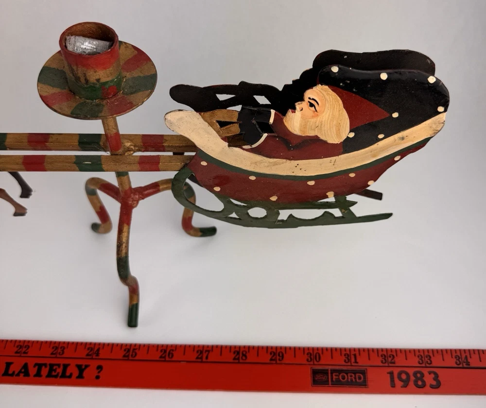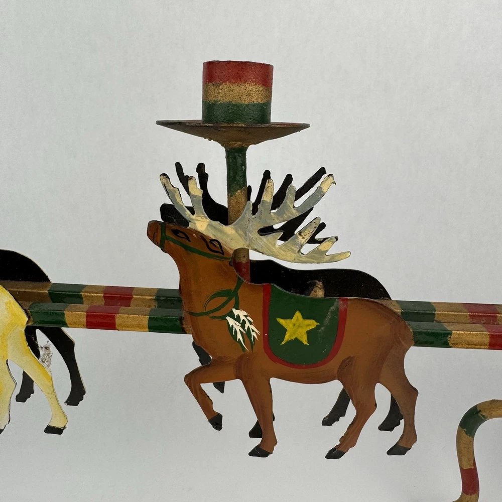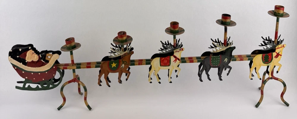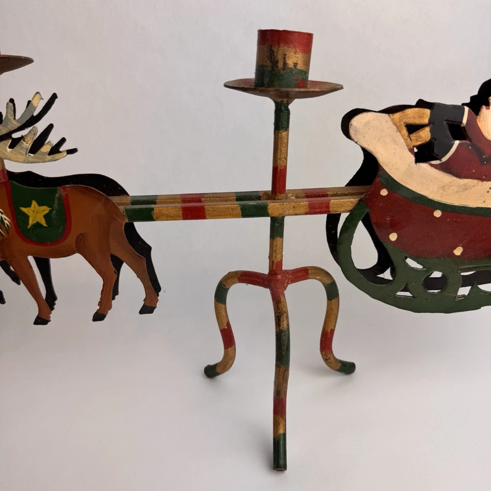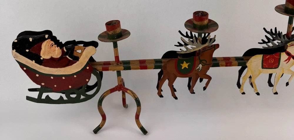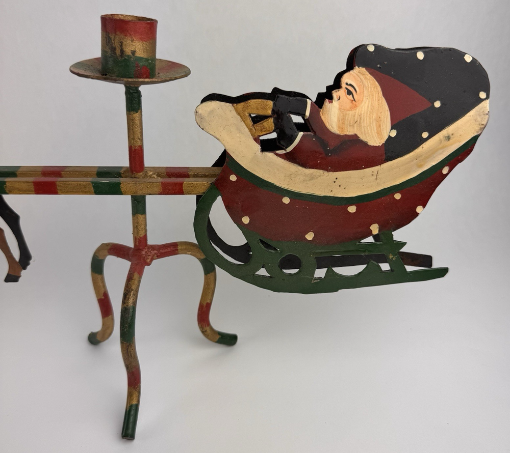 Vintage Santa's Sleigh Candle Holder Christmas Decor Metal Folk Art Measures approx. 32" long. Colorful.