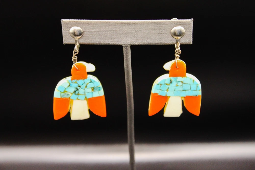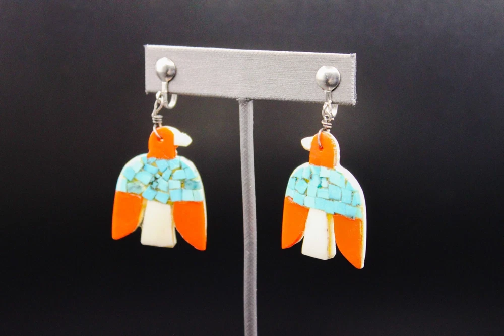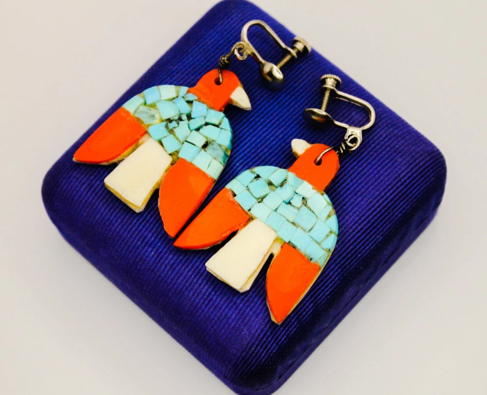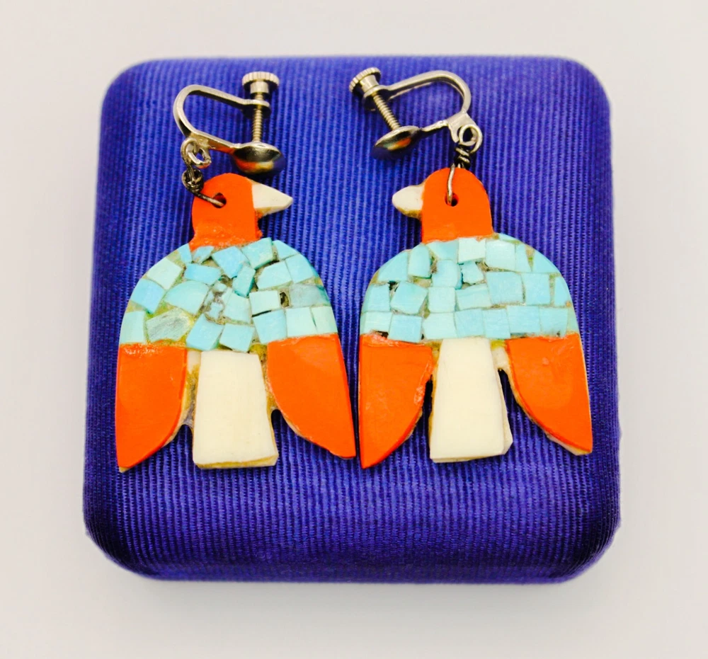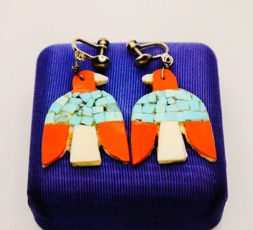 Hello and Welcome! Incredible pair of vintage Santo Domingo Pueblo thunderbird screw back earrings in beautiful, bright orange, turquoise blue, and a creamy white. Add a splash of color to your wardrobe! The buyer could swap out the screw backs for post earrings if they wished. This is an early to mid 20th century pair of Santo Domingo Depression Era Thunderbird earrings. Typical of this time period, the earrings are made with turquoise, various plastic materials, likely taken from things like battery casings, comb teeth, plastic utensils, or toothbrush handles, inlaid on a solid creamy white backing. The screw backs are in silver tone metal. The estimated time period that these were made was most likely during the Depression Era, c. 1930s. Size: 2-1/4 inches Long x a little over 1 inches Wide. The drop length is almost 1-1/2 inches. Condition: Very good vintage condition. Please see photos for details. Please review the item description and photos carefully, prior to purchasing as most of our items are vintage or gently pre-owned. Please note that colors may appear differently on each computer screen. We do utilize the zoom feature in our photography in order for the buyer to see the item in all aspects as clearly as possible. Therefore items may appear larger. We always note item sizes in the listing. We test all precious metals and gemstones. If you are unsure about anything or have questions, please ask them prior to purchasing. We ship quickly and carefully. Satisfaction is guaranteed. Thank you for visiting!