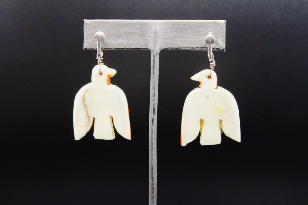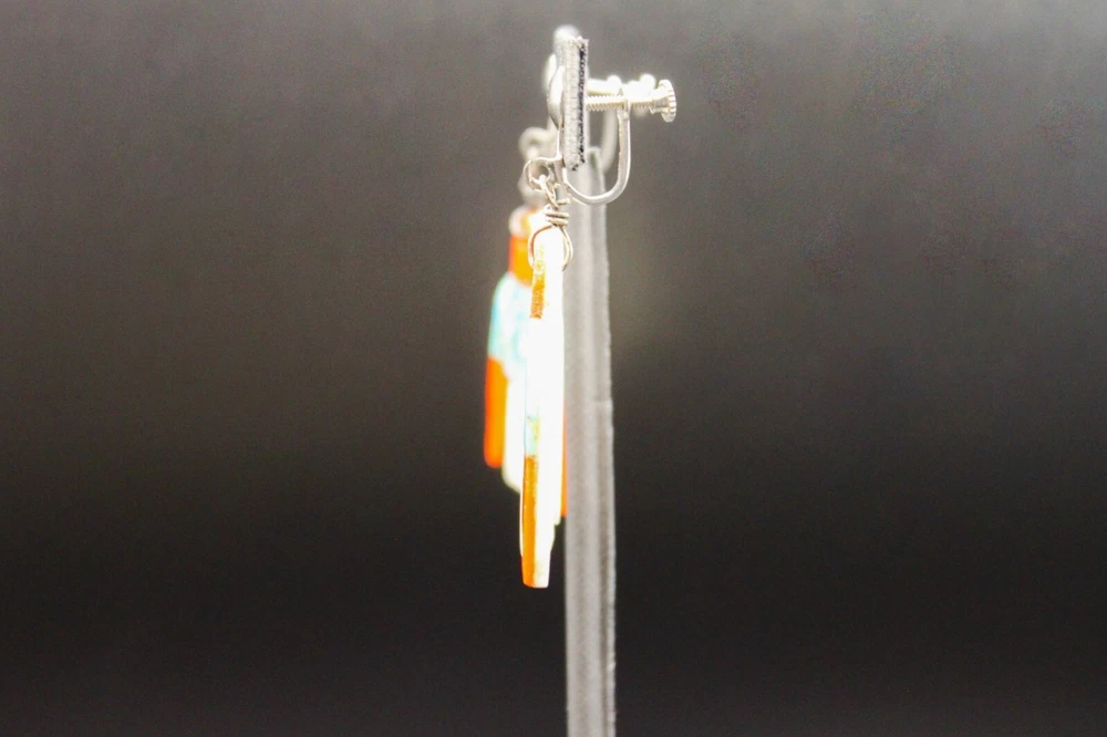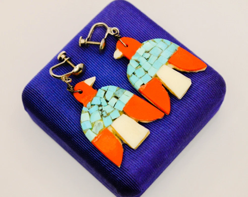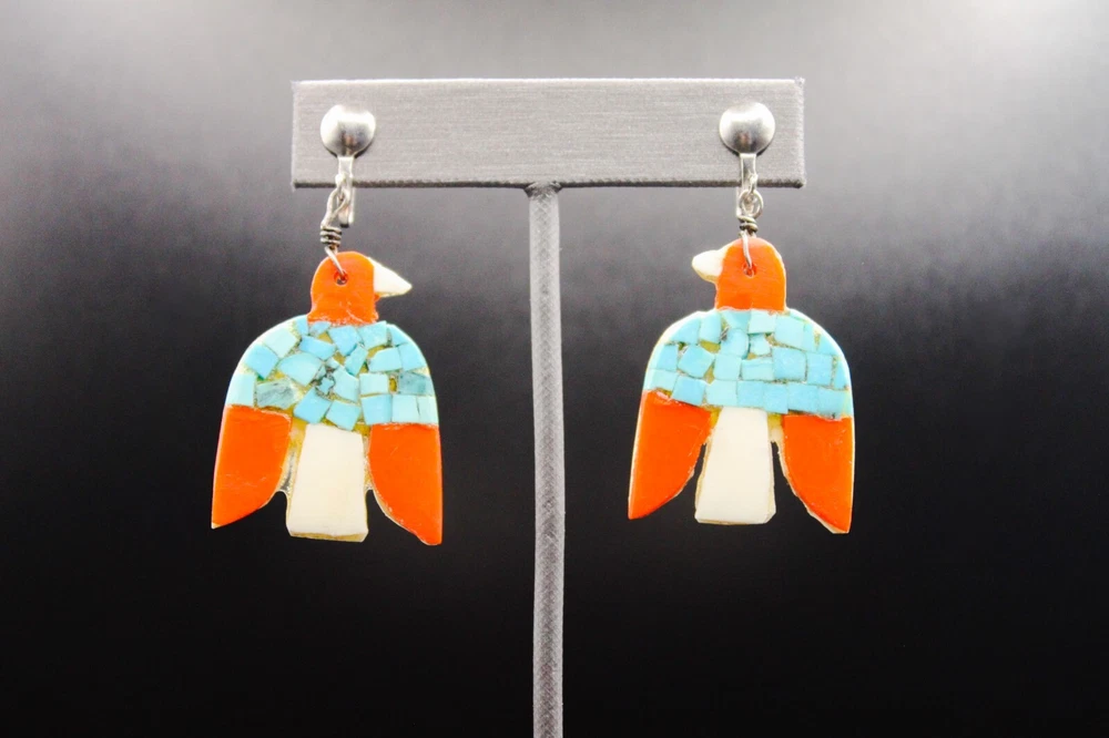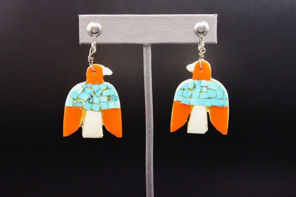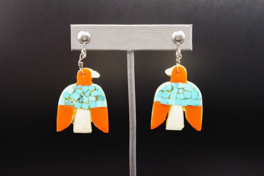 Hello and Welcome! Incredible pair of vintage Santo Domingo Pueblo thunderbird screw back earrings in beautiful, bright orange, turquoise blue, and a creamy white. Add a splash of color to your wardrobe! The buyer could swap out the screw backs for post earrings if they wished. This is an early to mid 20th century pair of Santo Domingo Depression Era Thunderbird earrings. Typical of this time period, the earrings are made with turquoise, various plastic materials, likely taken from things like battery casings, comb teeth, plastic utensils, or toothbrush handles, inlaid on a solid creamy white backing. The screw backs are in silver tone metal. The estimated time period that these were made was most likely during the Depression Era, c. 1930s. Size: 2-1/4 inches Long x a little over 1 inches Wide. The drop length is almost 1-1/2 inches. Condition: Very good vintage condition. Please see photos for details. Please review the item description and photos carefully, prior to purchasing as most of our items are vintage or gently pre-owned. Please note that colors may appear differently on each computer screen. We do utilize the zoom feature in our photography in order for the buyer to see the item in all aspects as clearly as possible. Therefore items may appear larger. We always note item sizes in the listing. We test all precious metals and gemstones. If you are unsure about anything or have questions, please ask them prior to purchasing. We ship quickly and carefully. Satisfaction is guaranteed. Thank you for visiting!