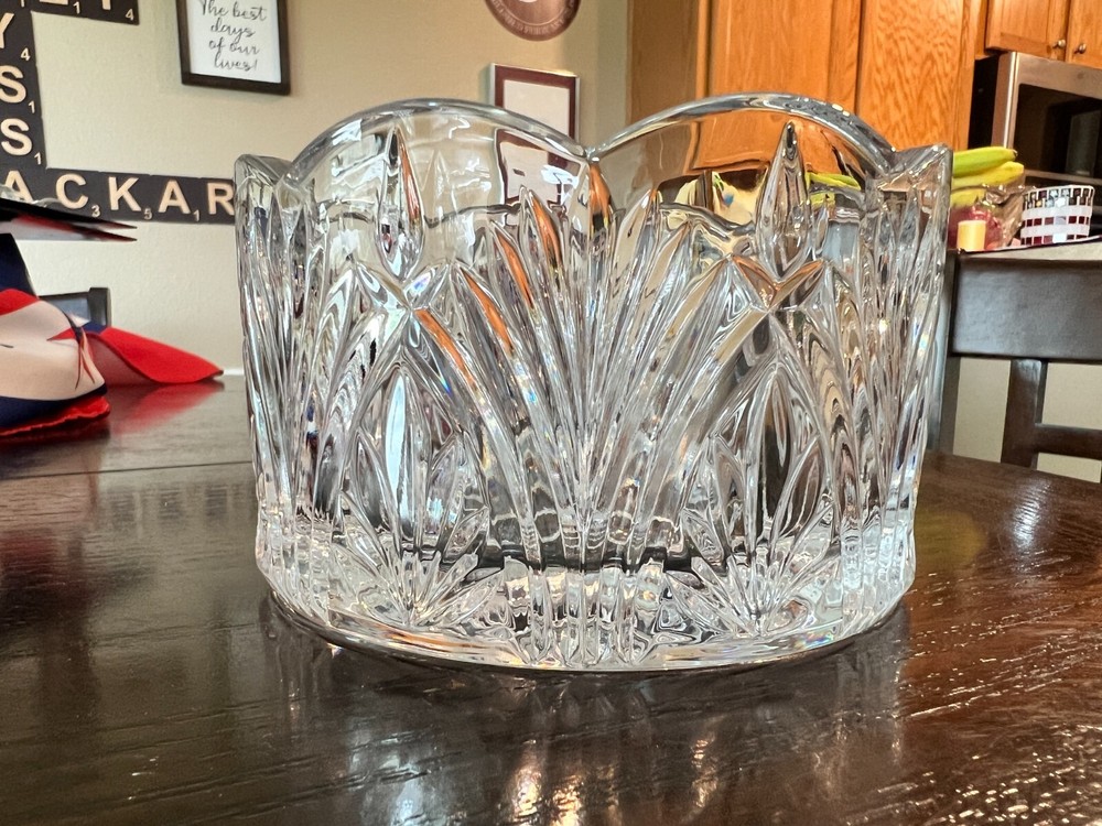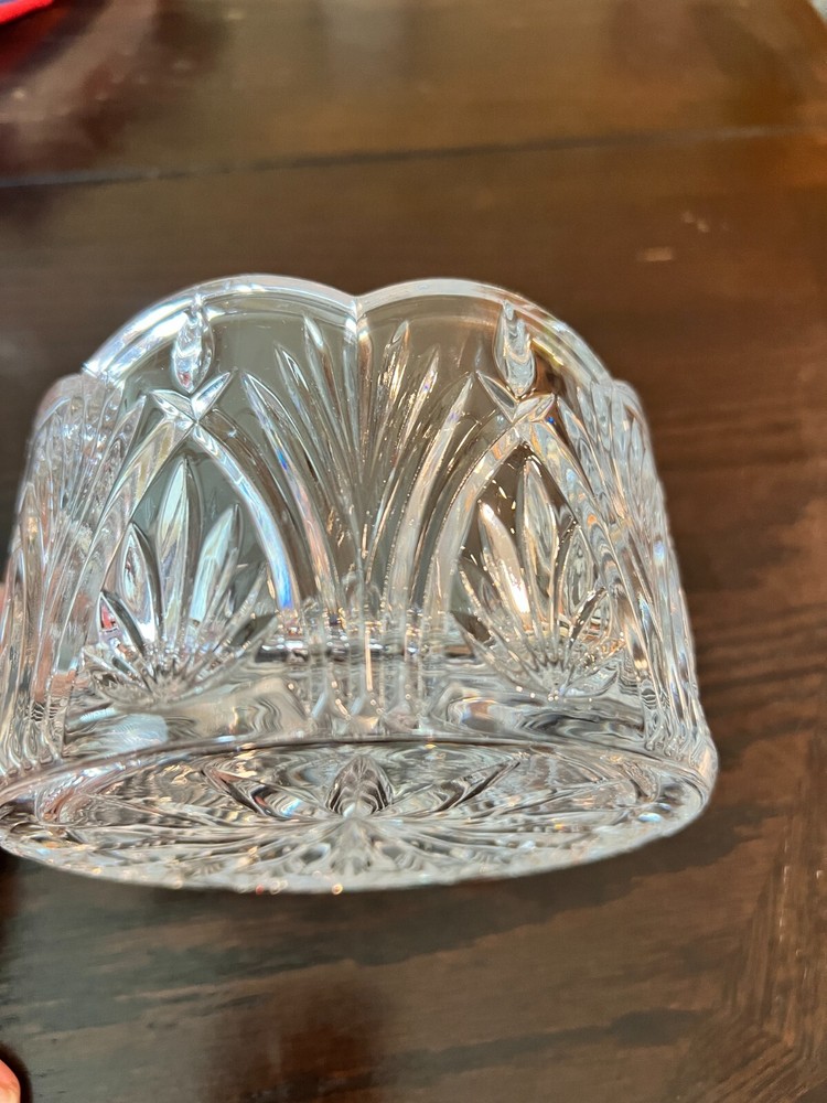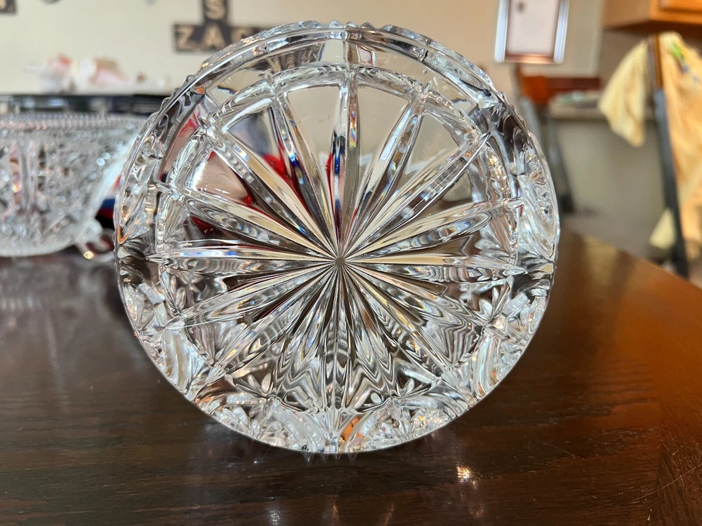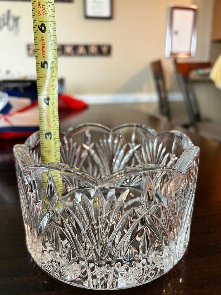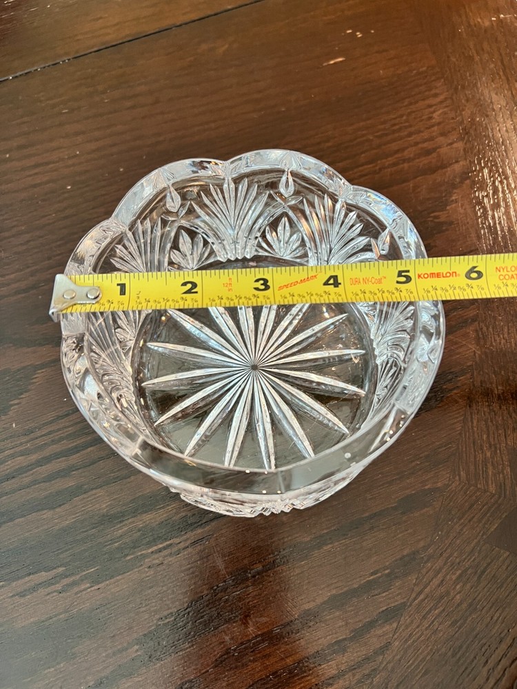 Shape: Round Era: Mid 20th Century (1941-1969) Pattern: Scalloped Rim, Starburst & Leaf Pattern Occasion: All Occasions Color: Clear Item Width: 5 in Type: Bowl Bowl Diameter: 5 in Number of Place Settings: 1 Antique: Yes Style: Antique Item Height: 3.5 in Item Weight: 3 lbs Brand: Unbranded Item Depth: 3 in Material: Glass Original/Reproduction: Original