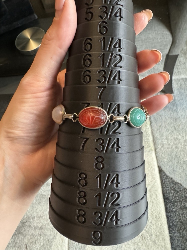 Vintage Scarab Link Bracelet Natural Various Stones Carved Size 7.25. Looks like it may have been gold plated but nearly all has worn off. Clasp is stamped sterling. Metal under the gold plating unknown but it is not magnetic and is silver in tone- could be sterling silver but not tested. Feel free to reach out with any questions.