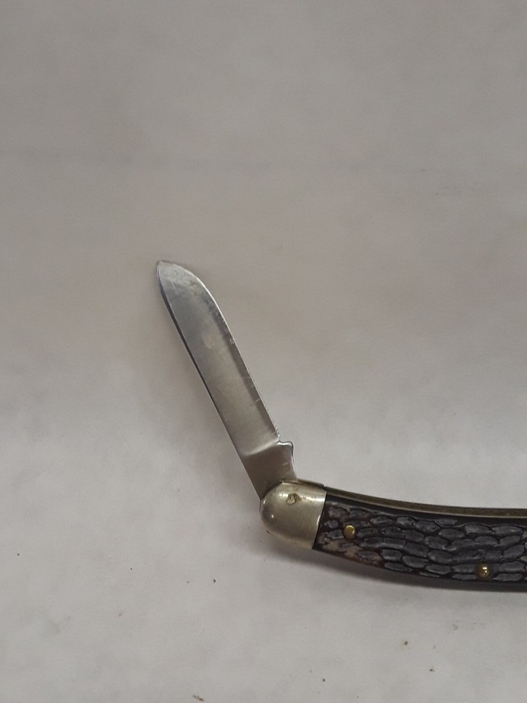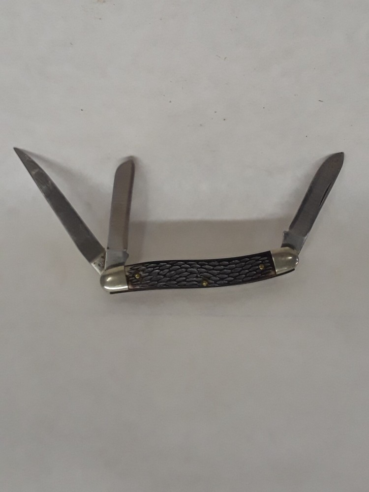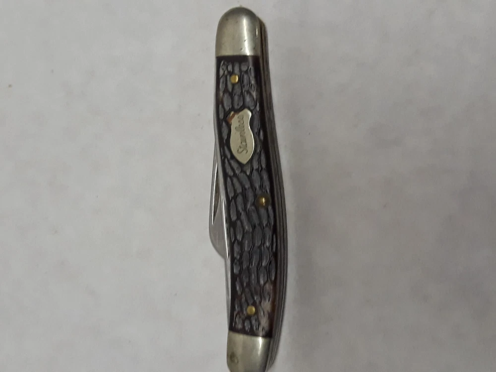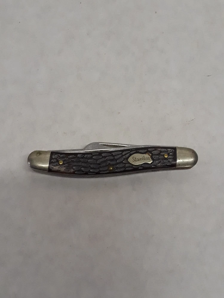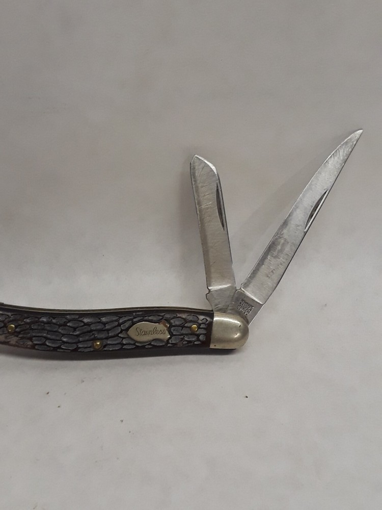 This vintage Schrade Walden NY USA Stockman Knife #825 features a clip point blade with a razor blade stainless etch. It has a blade range of 2.76 - 4 inches and a handle made of Delrin in a brown color. The knife is a pocketknife from the 1970s, with three blades that can be opened manually. It is an original Schrade model with an ambidextrous design, suitable for collectors of modern folding knives.
