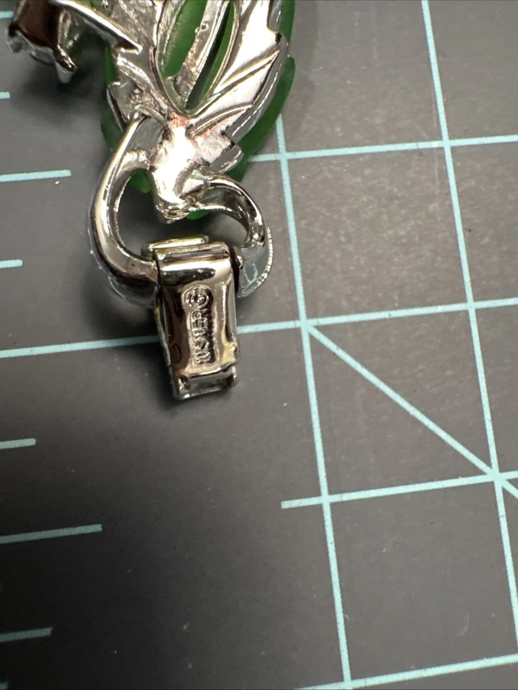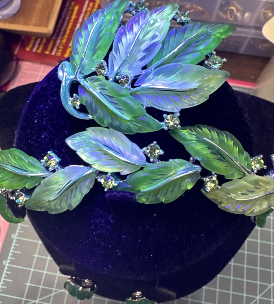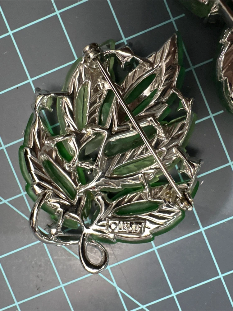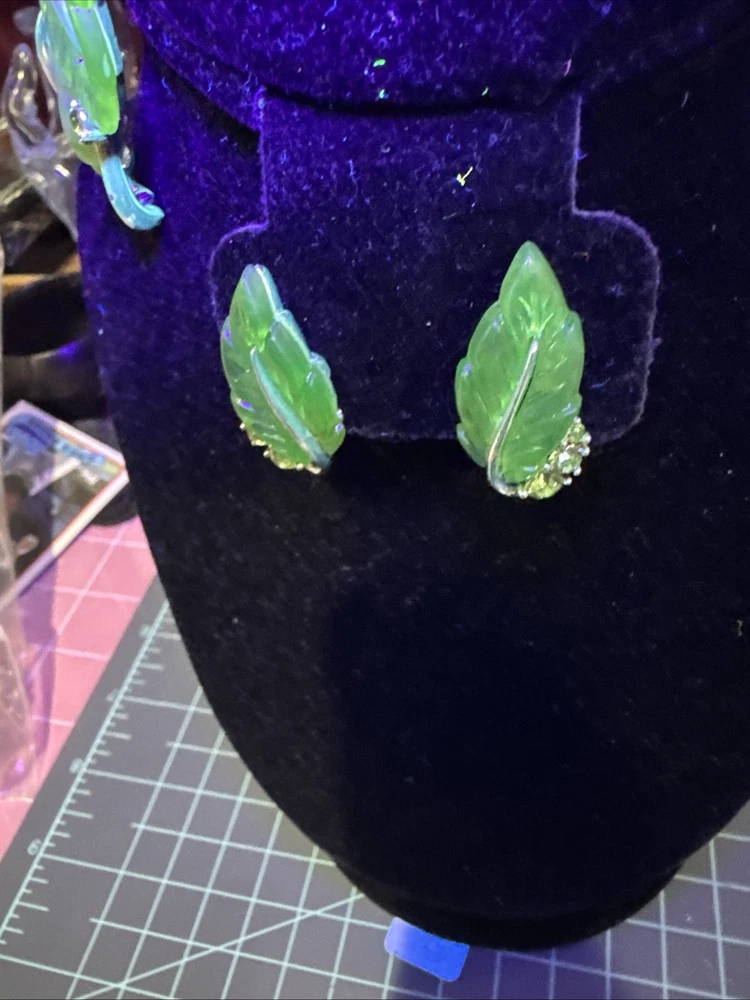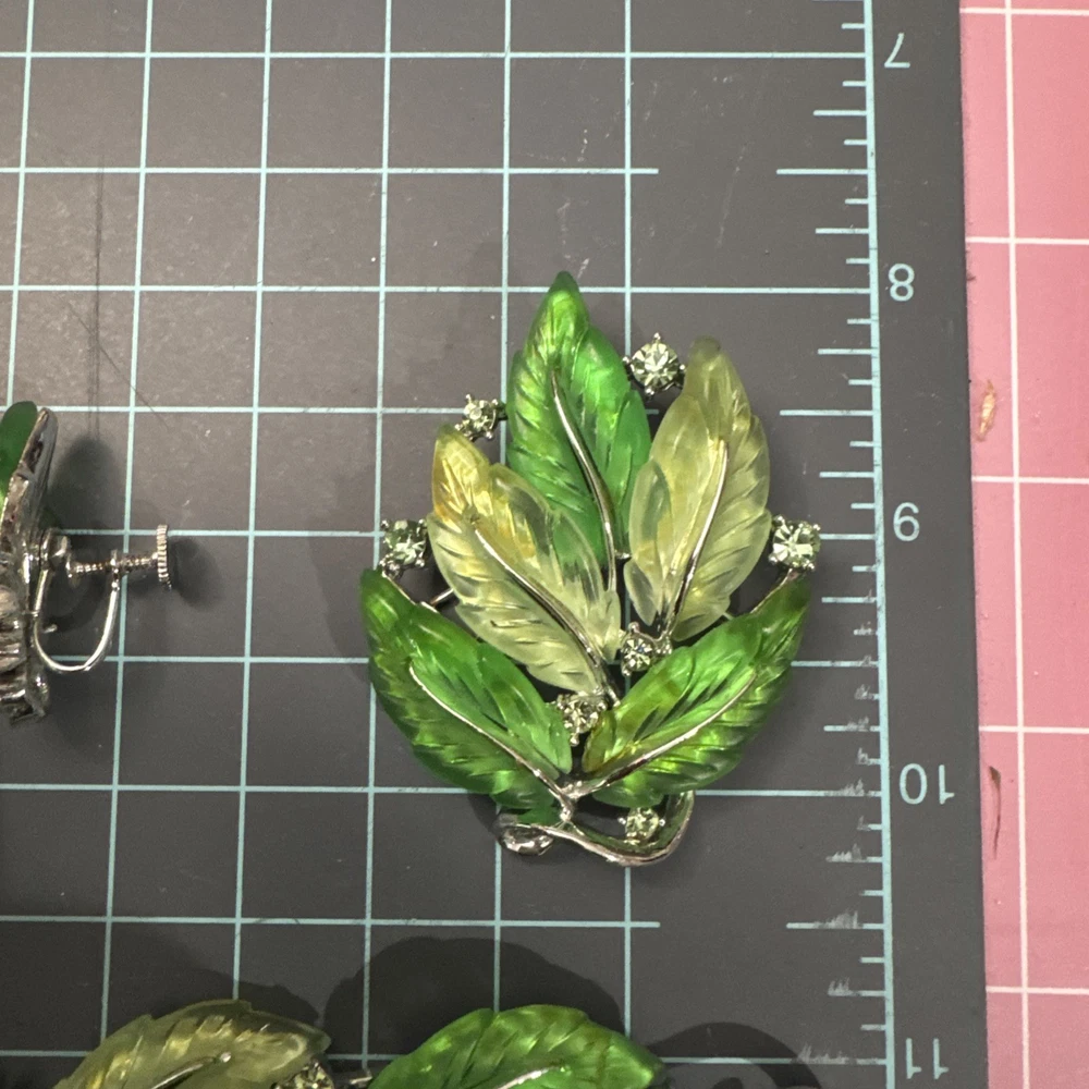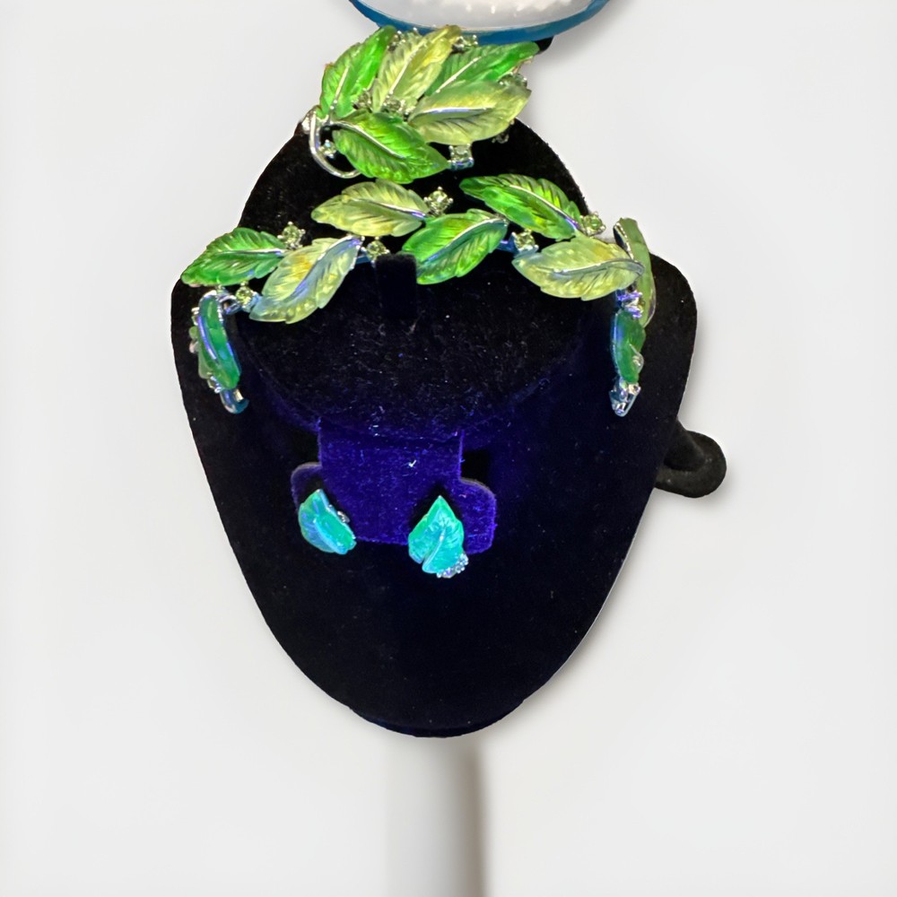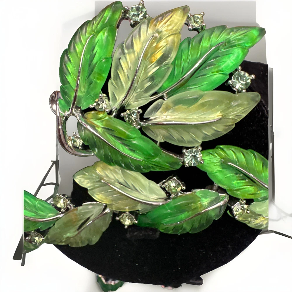 The Vintage Lisner Green Leaf Brooch Bracelet & Earrings Set features a beautiful green rhinestone design, perfect for special occasions such as weddings, anniversaries, and birthdays. The set includes a brooch, bracelet, and earrings, all signed by the brand Lisner. The green crystals and glass stones add a touch of beauty and elegance, making it a timeless piece of jewelry that can be worn on various occasions. The adjustable features ensure a comfortable fit, and the set is a perfect gift for Mother's Day, Father's Day, or Christmas.