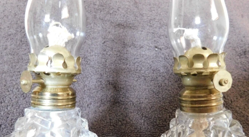 Vintage Set of 2 Exquisite Kerosene Oil Mantel Lamps All in great shape, very clean,no chips or cracks,believe to be from the 1930's. Cut glass could be crystal, wicks are new looks like they were never used. Mantel Lamps,They are very thin and bold looking. Bottoms are all solid. Great Collector's item. Great Art Decor., Found in UpState New York. Pieces are about 12 inches Tall; Thank you for Looking! Most of my items are antique or vintage ,all are found in UpState , New York, all are found in homes of senior's that ae downsizing or just moving on and can not take all the treasures they have collected over the years. Happy Shopping!