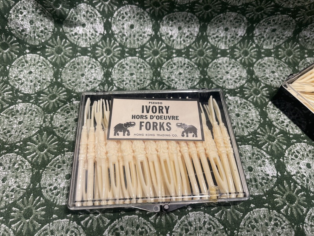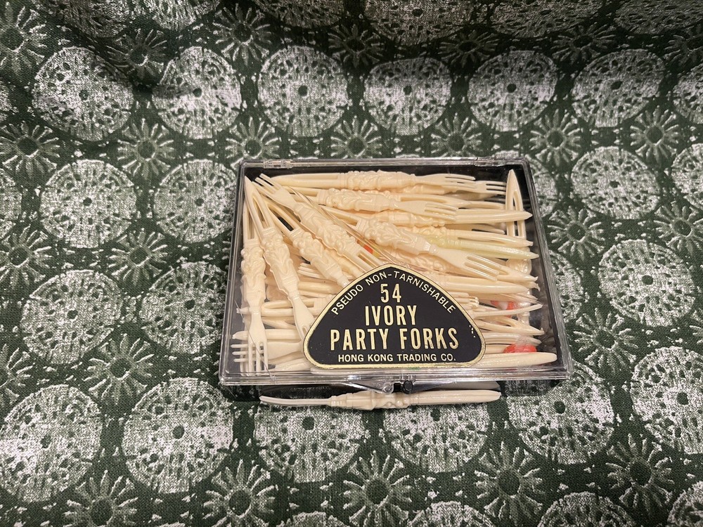 Add a touch of vintage charm to your next party with this lot of three Pseudo non-tarnishable ivory forks. Made in Hong Kong, these plastic forks are perfect for serving appetizers and other finger foods. The forks feature a classic design that is sure to impress your guests and add a sophisticated touch to your table decor. Whether you're hosting a formal dinner or a casual get-together, these forks are a must-have for any occasion. The forks are in excellent condition and are free from any signs of wear or damage. They are perfect for collectors or anyone who loves vintage party supplies. Don't miss out on the chance to add these beautiful forks to your collection and make your next party extra special.