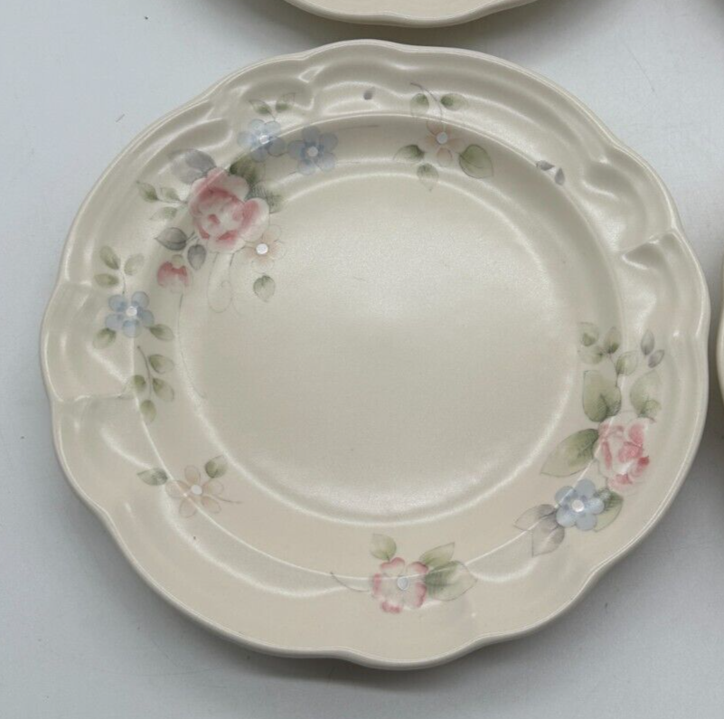 Vintage Set of 4 Pfaltzgraff Tea Rose Salad Bread Plates in a Floral Pink pattern. Made of stoneware, this set includes Salad Plates or Bread Plates. Ideal for adding a touch of elegance to your table setting, perfect for serving bread or salad with a charming floral design.