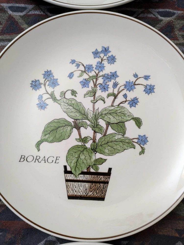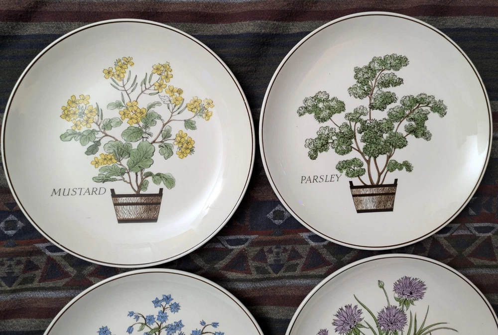 Vintage Set of 4 Herb Plates 8.5 Inch 1950s/1960s. Plates show minimal wear, some scratching from use no nicks or cracks. Each plate measures 8.25 inches across and features the name of the herb along with a colorful depiction. Plates are unmarked. Each has a small divot in the back. Each plate is a different herb. -Basil -Sage -Lovage -Dill -Chives -Borage -Paraley -Mustard