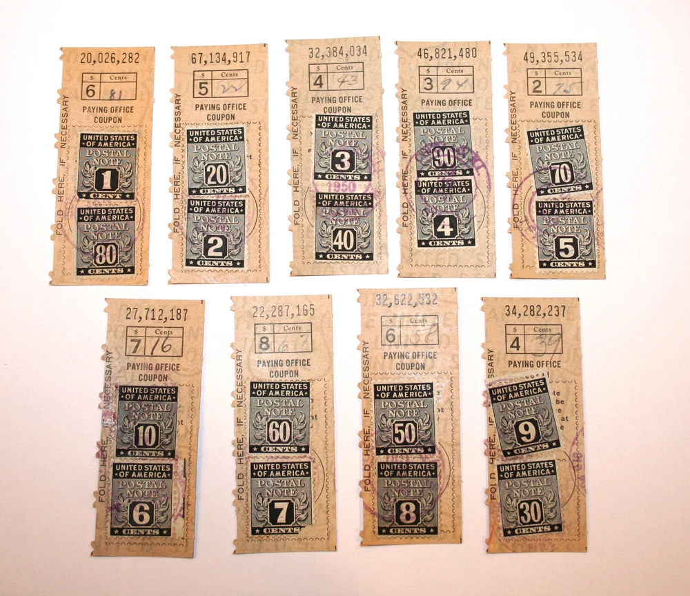Set of vintage PN1 - PN18 Postal Note stamps. Includes one of each, attached to coupons. Please review photos for condition. Feel free to contact me if you have any questions and I will respond to the best of my knowledge. Thank you.