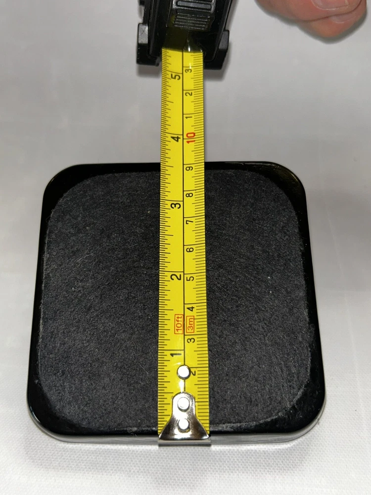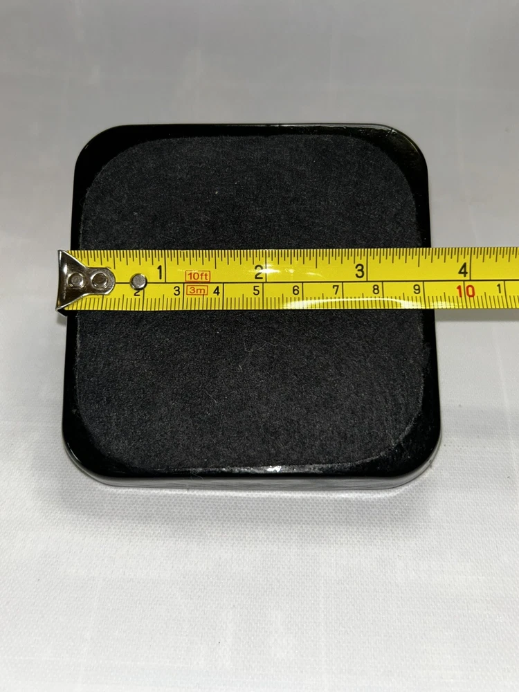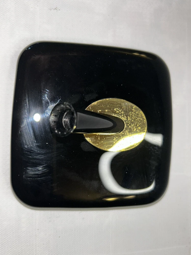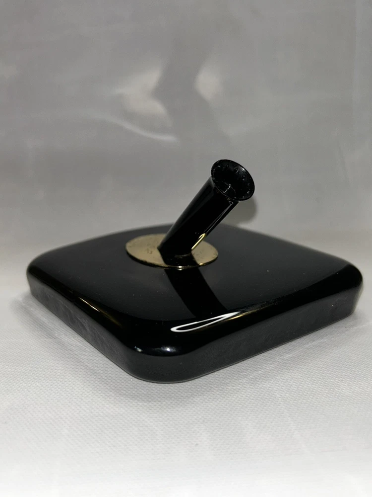 This vintage Sheaffer's fountain pen holder base is a must-have for any pen collector. The black 4”x4" base is made of glass or ceramic, adding a touch of elegance to your writing experience. The pen holder is from the United States and has not been modified or handmade. This item is perfect for those who appreciate vintage pieces and is a great addition to any collection. The material of the pen holder is black, which gives it a unique and timeless look. It is perfect for use or display and is sure to impress any pen enthusiast. Some imperfections in the brass around the pen holder.