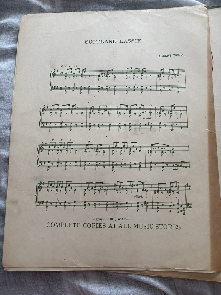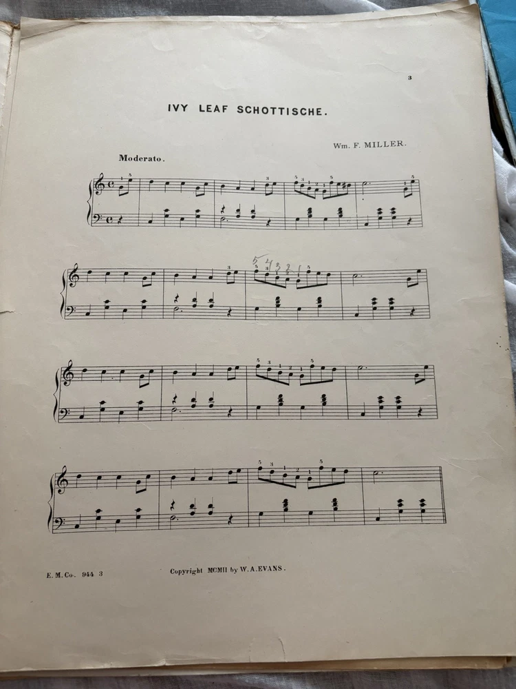 The product is vintage sheet music for the Ivy Leaf Schottische by WF Miller Evans, dating back to 1902. The sheet music falls under the genre of Musicals and provides musicians with the opportunity to play this specific piece of music from the past. With its historical significance and unique charm, this product appeals to collectors and music enthusiasts looking to revisit or experience classic musical compositions. ALSO HAS SCOTTLAND LASSIE BY ALBERT WOOD
