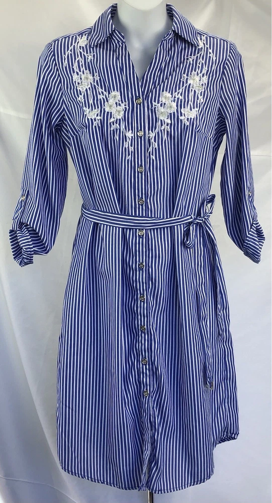 MLLE Gabrielle Shirt Dress S Blue/Wht Stripe knee length Belt Roll tab Sleeve. Chest 36" Length 37" Excellent Fashion Gem