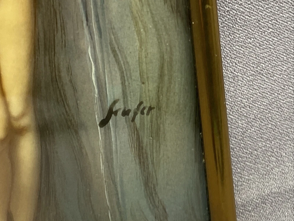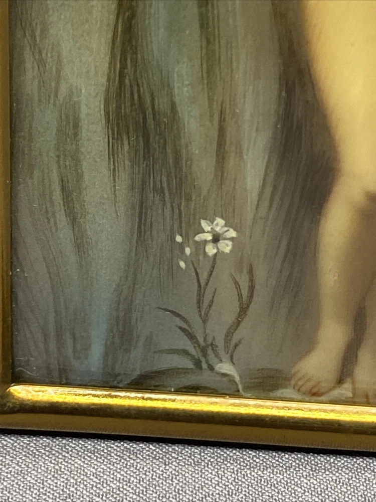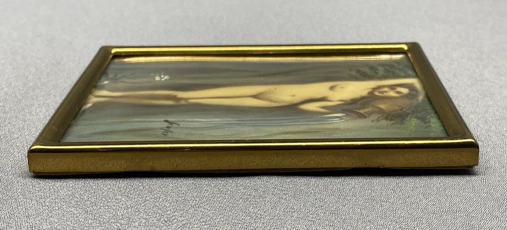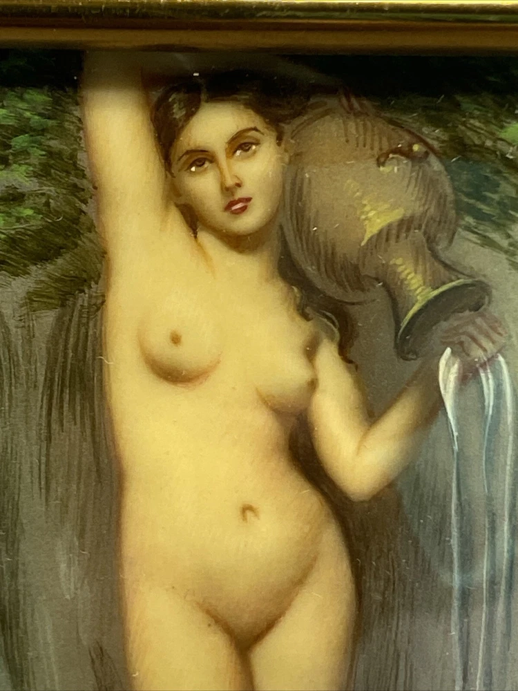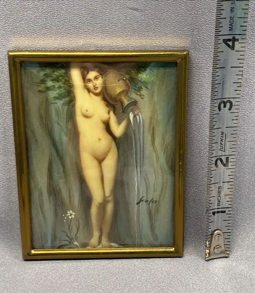 For sale is this beautiful, signed vintage nude portrait of a women pouring water. It measures approximately 3 5/8" tall & 3" wide. Back of frame has wear. See photos.