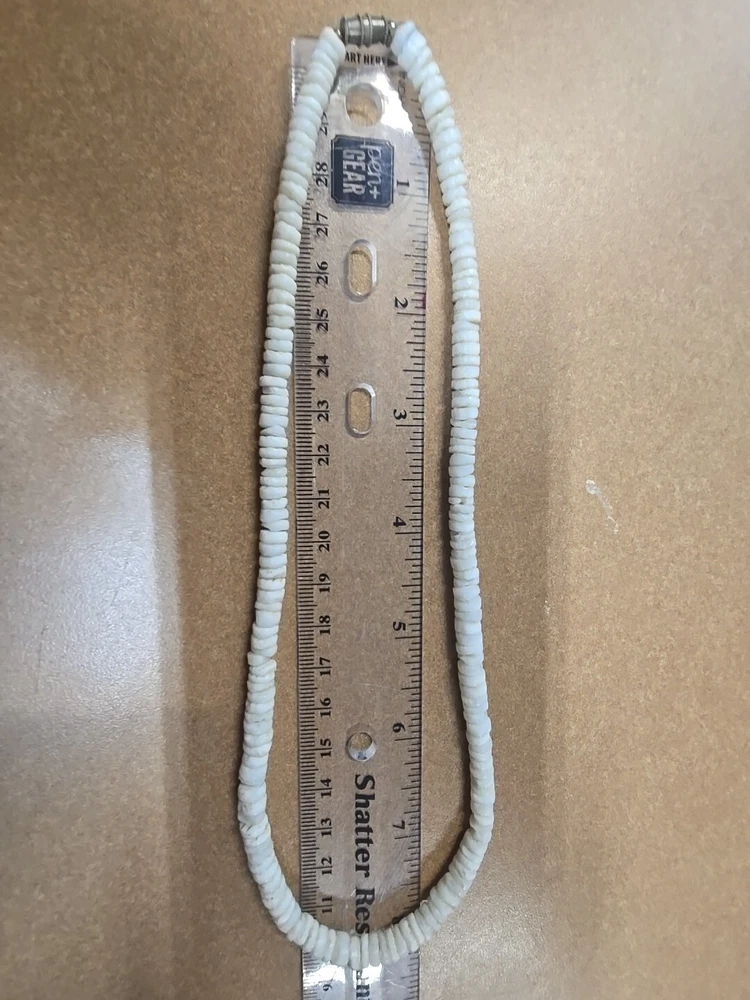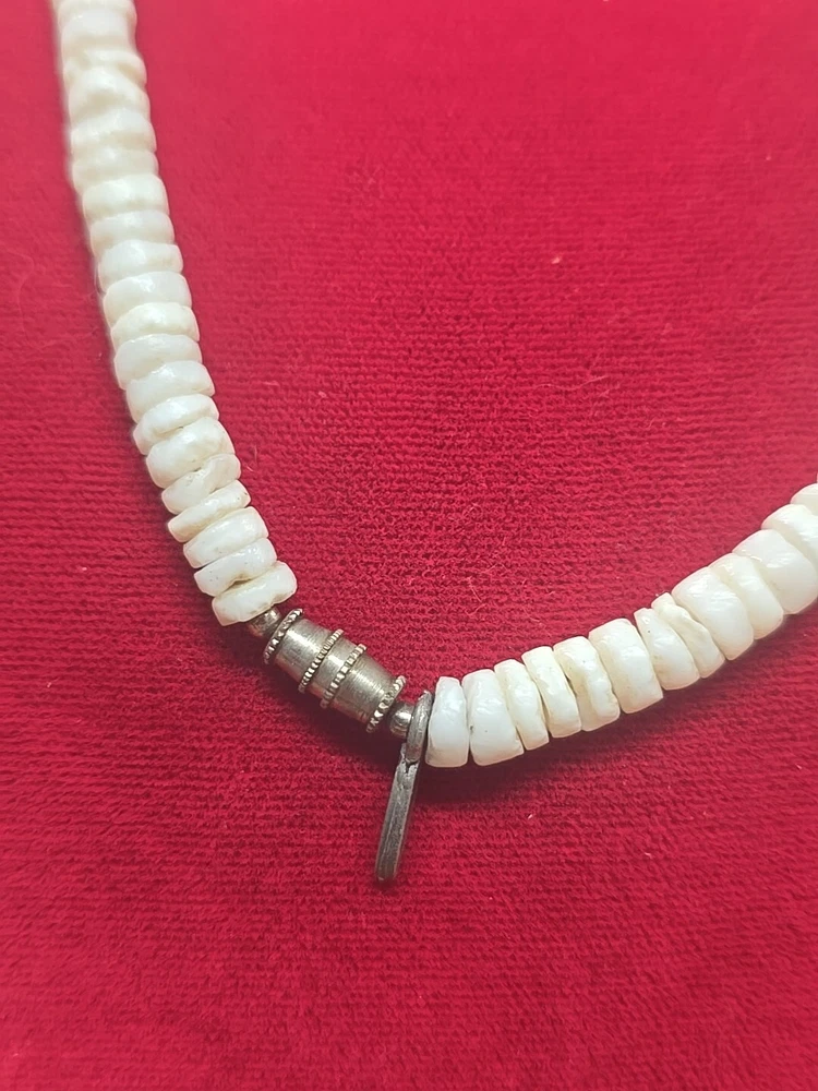 This vintage Sotnick necklace is a unique piece of jewelry that features a round pendant with a natural white shell. The necklace is 16 inches long and has a barrel clasp closure. It is signed by the artist and has a beaded style that is perfect for any fashion occasion. The pendant hangs from a cord chain type and has a 6mm shell length. This necklace is a great addition to any collection and is perfect for unisex adults.