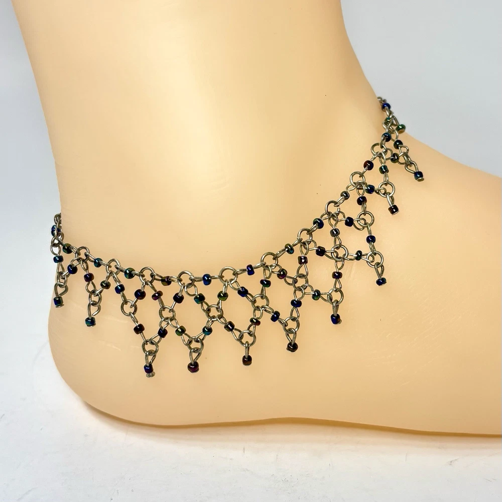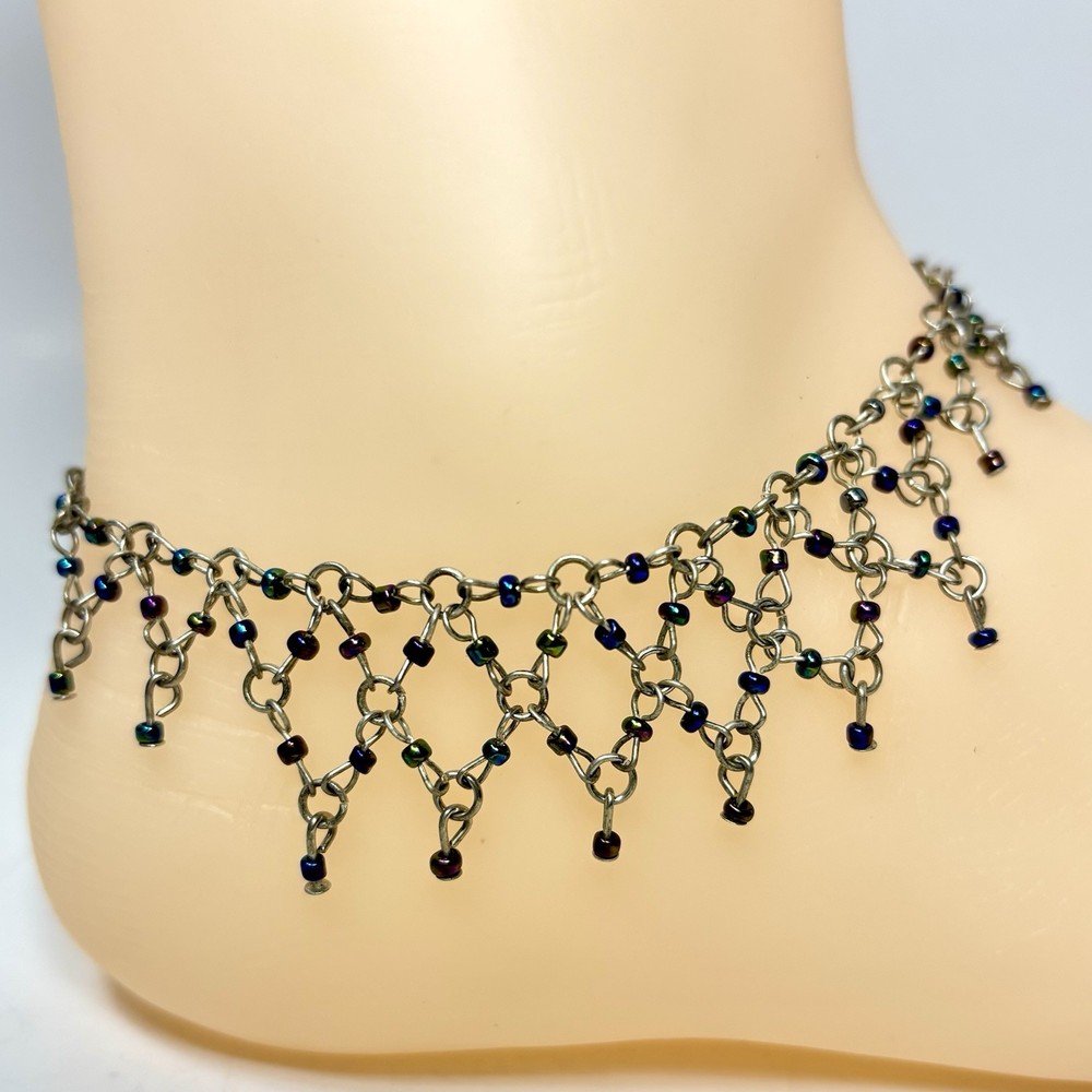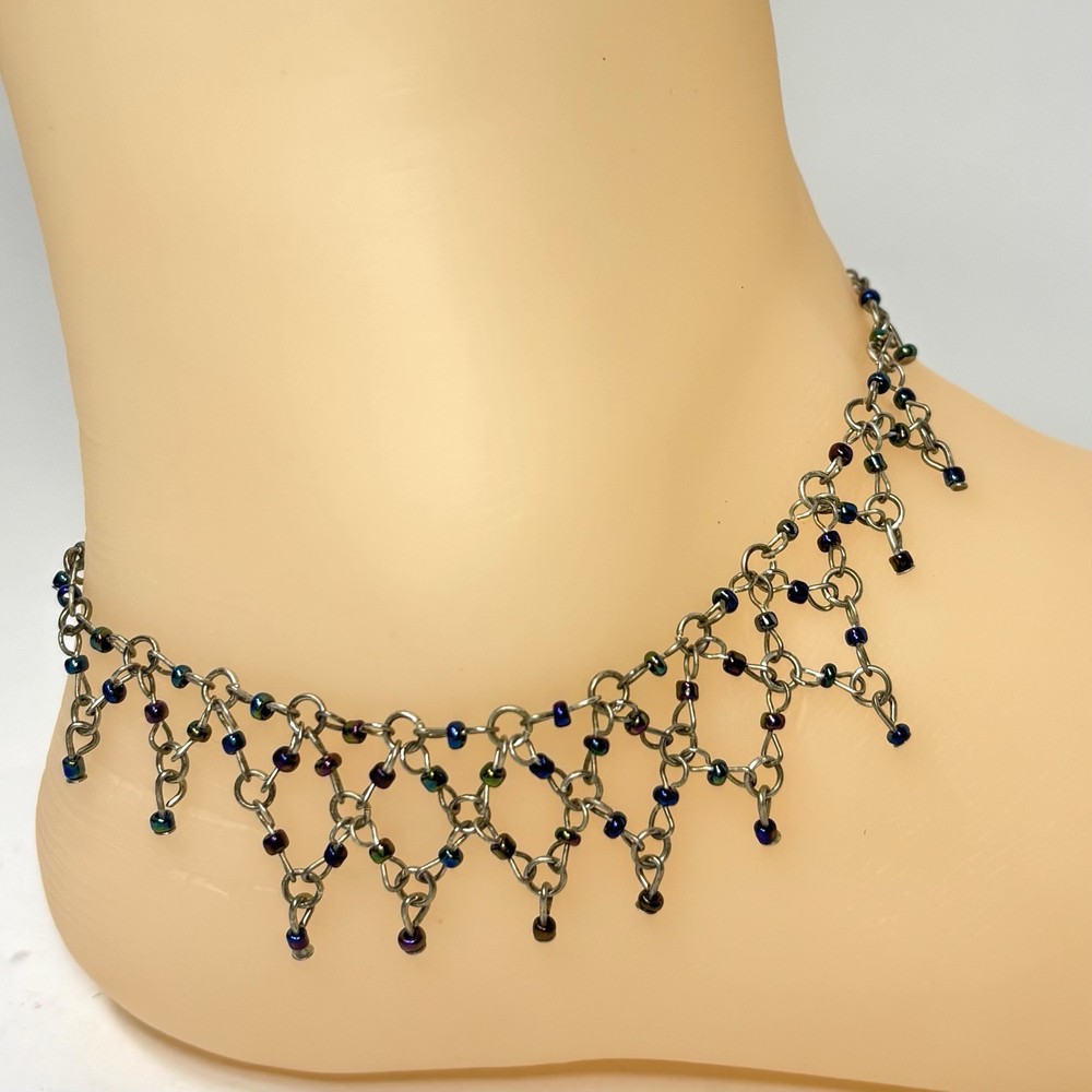 This anklet is stunning! The diamond weave design is delicate yet eye-catching, and the iridescent beads shimmer beautifully in the light. The silver tone is still vibrant, and the clasp secures well. Perfect for adding a touch of vintage charm to any outfit. Very happy with this purchase!
