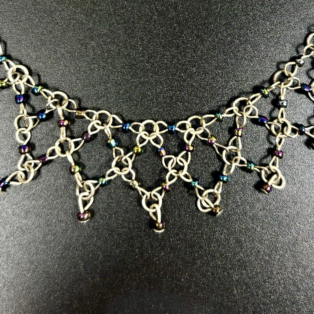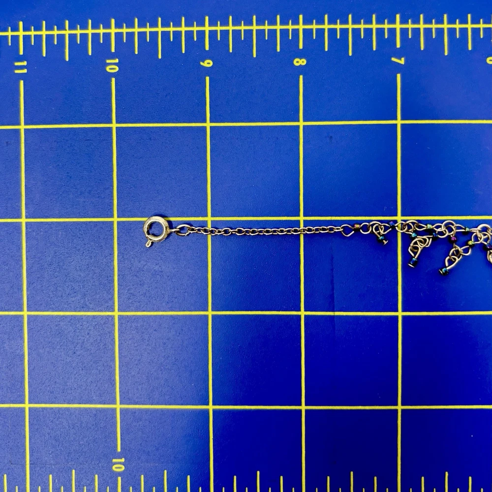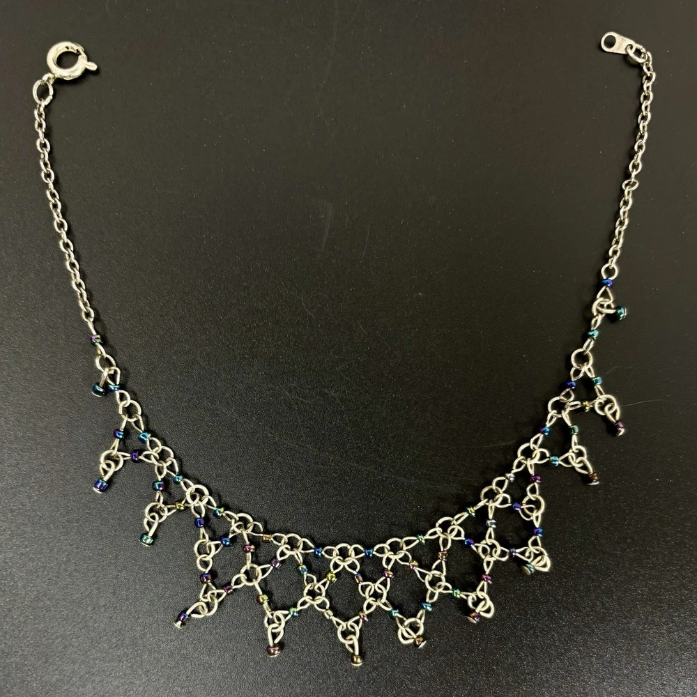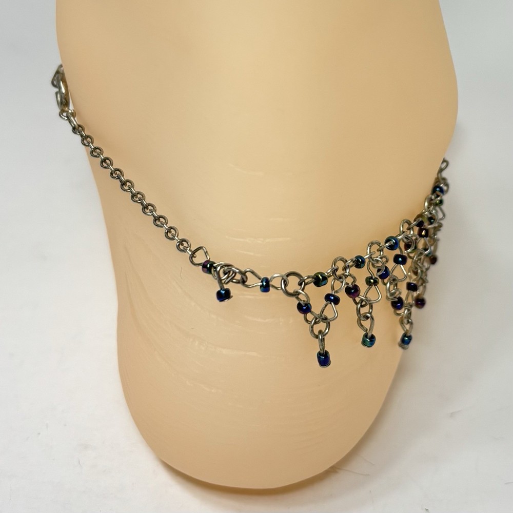This anklet is stunning! The diamond weave design is delicate yet eye-catching, and the iridescent beads shimmer beautifully in the light. The silver tone is still vibrant, and the clasp secures well. Perfect for adding a touch of vintage charm to any outfit. Very happy with this purchase!