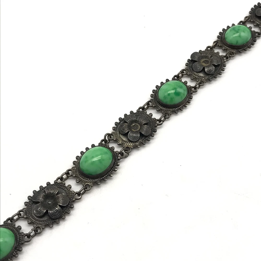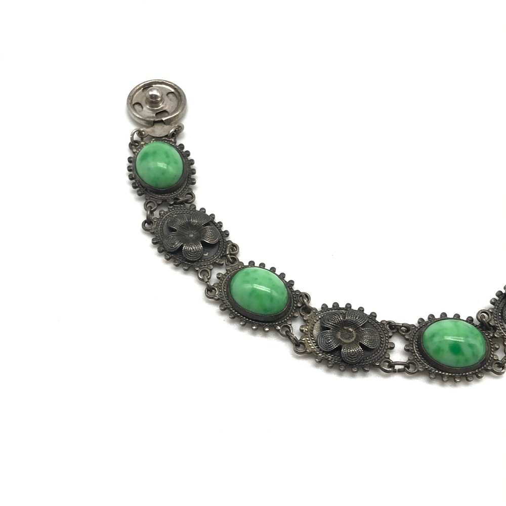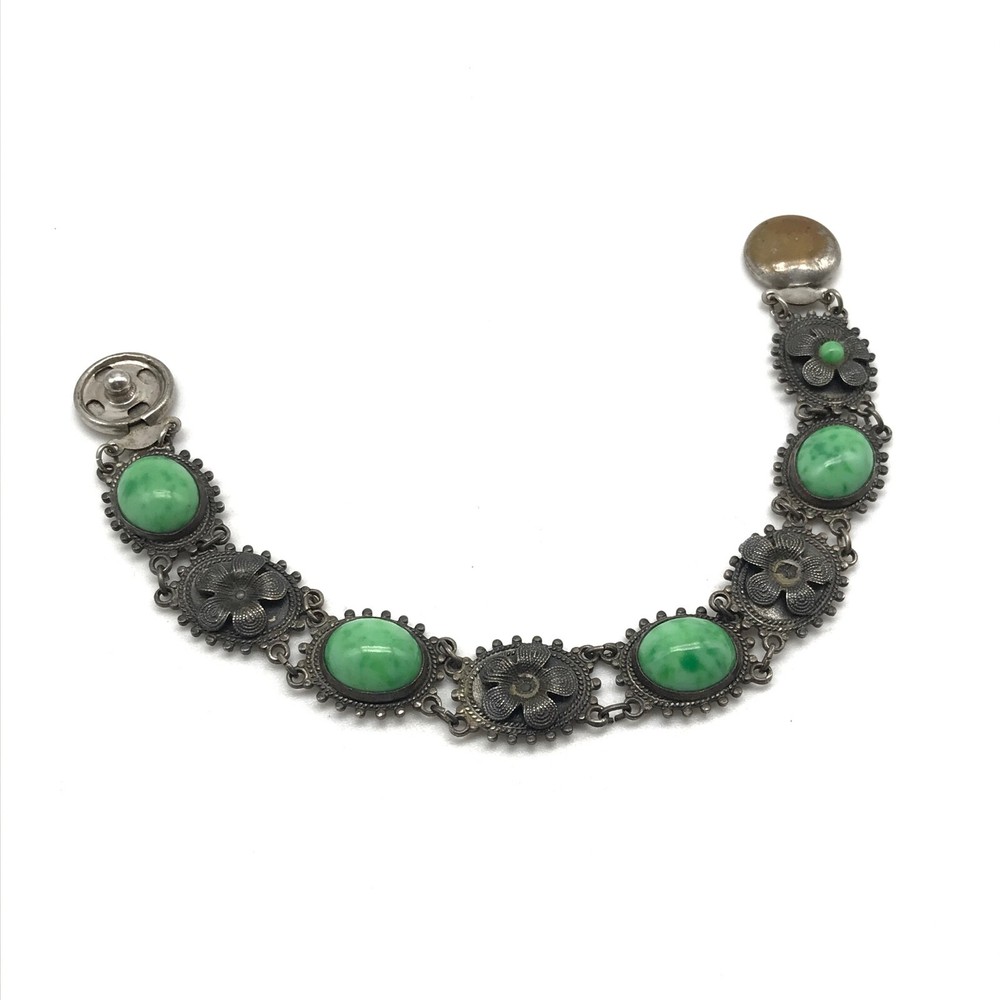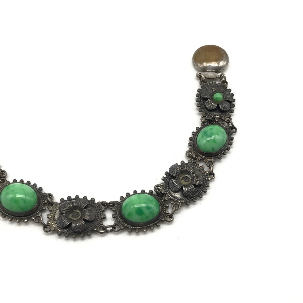 Vintage Antique? Silver Tone Green Stone Flower Link Bracelet 7" Item details: Length: 7" Makes a perfect gift to yourself or a loved one. - Please note, most of my store's items are vintage or pre-owned. Most items are in very good/good fine estate condition, but please also view all pictures. Well cared for. Please feel free to ask any other questions you may have. - Jewelry is packaged safe and securely with a gift box or pouch. - Thank you so much for shopping with me! P lease check out my store, I list new jewelry everyday!