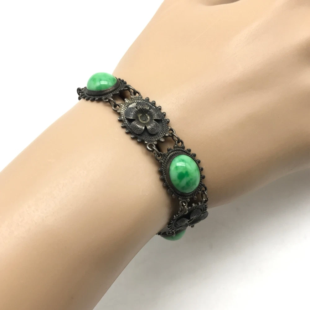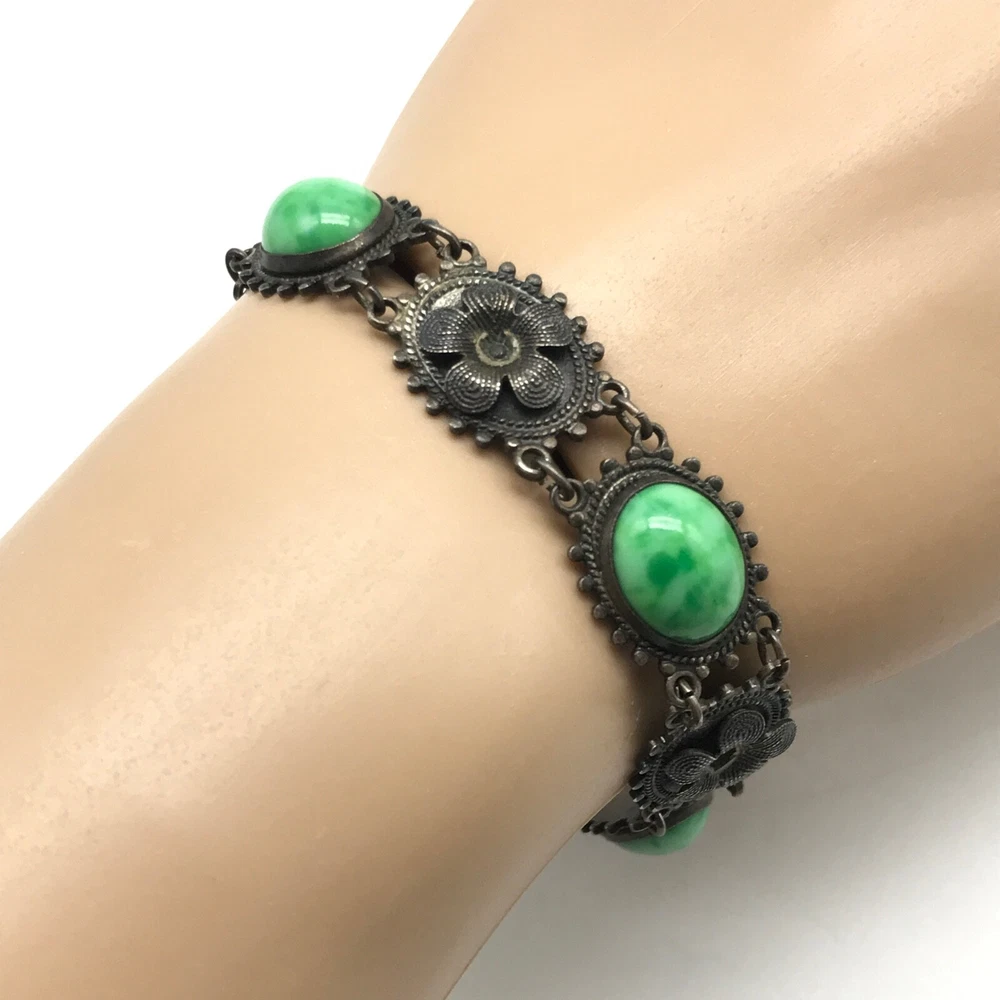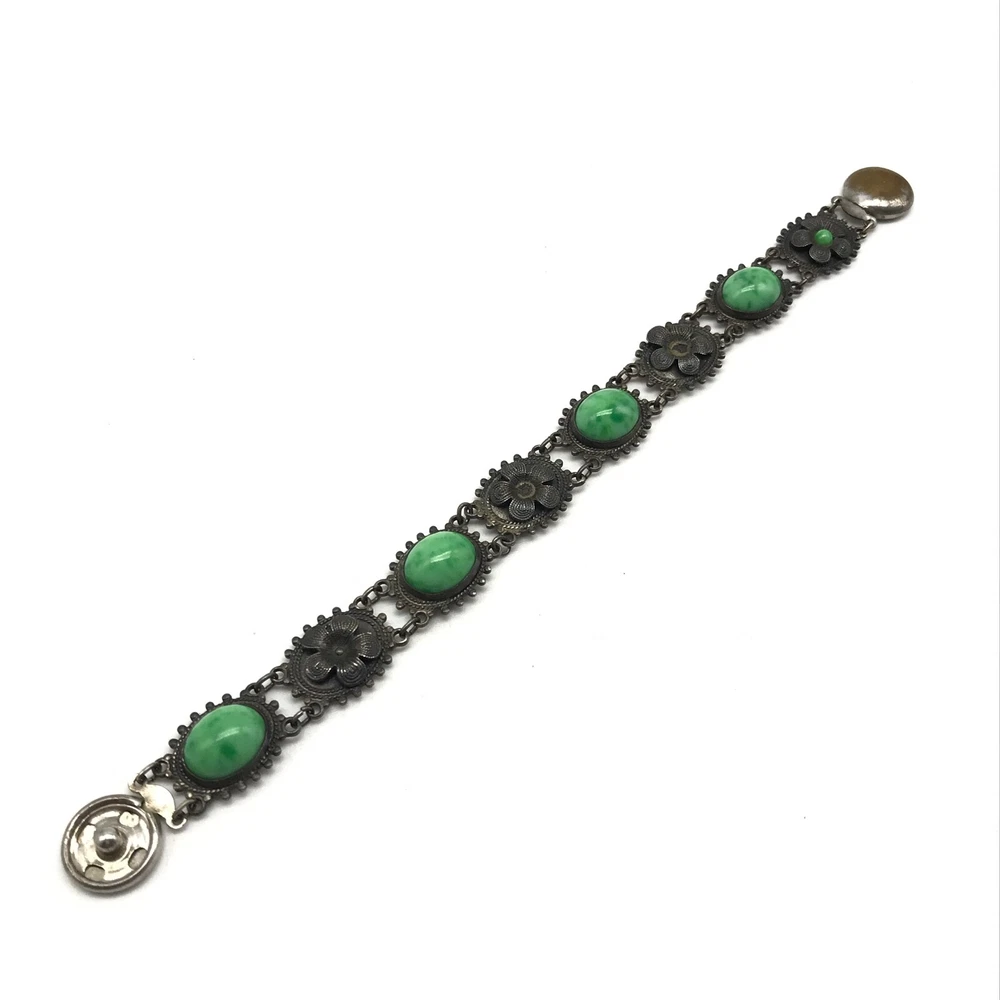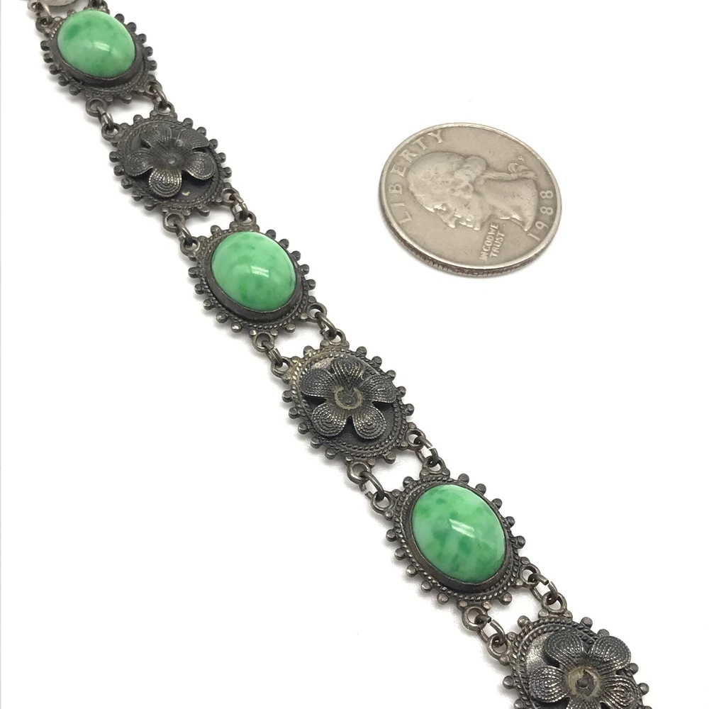 Vintage Antique? Silver Tone Green Stone Flower Link Bracelet 7" Item details: Length: 7" Makes a perfect gift to yourself or a loved one. - Please note, most of my store's items are vintage or pre-owned. Most items are in very good/good fine estate condition, but please also view all pictures. Well cared for. Please feel free to ask any other questions you may have. - Jewelry is packaged safe and securely with a gift box or pouch. - Thank you so much for shopping with me! P lease check out my store, I list new jewelry everyday!