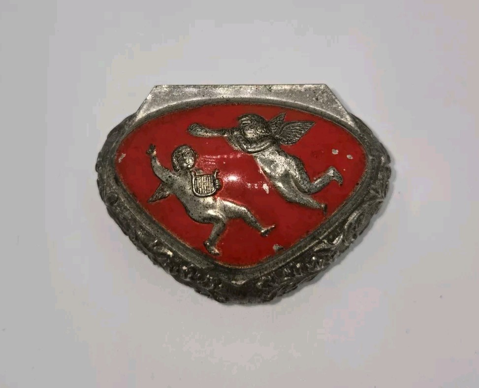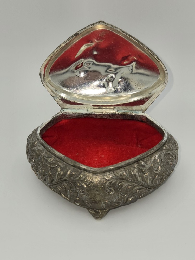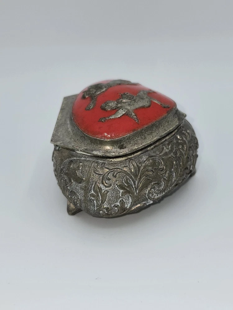 This vintage jewelry box is small in size and features a charming cherub design. Made of silver plated material with a vibrant red color, it is perfect for storing small trinkets and jewelry items. The intricate detailing and elegant design make it a beautiful addition to any collection or decorative display.