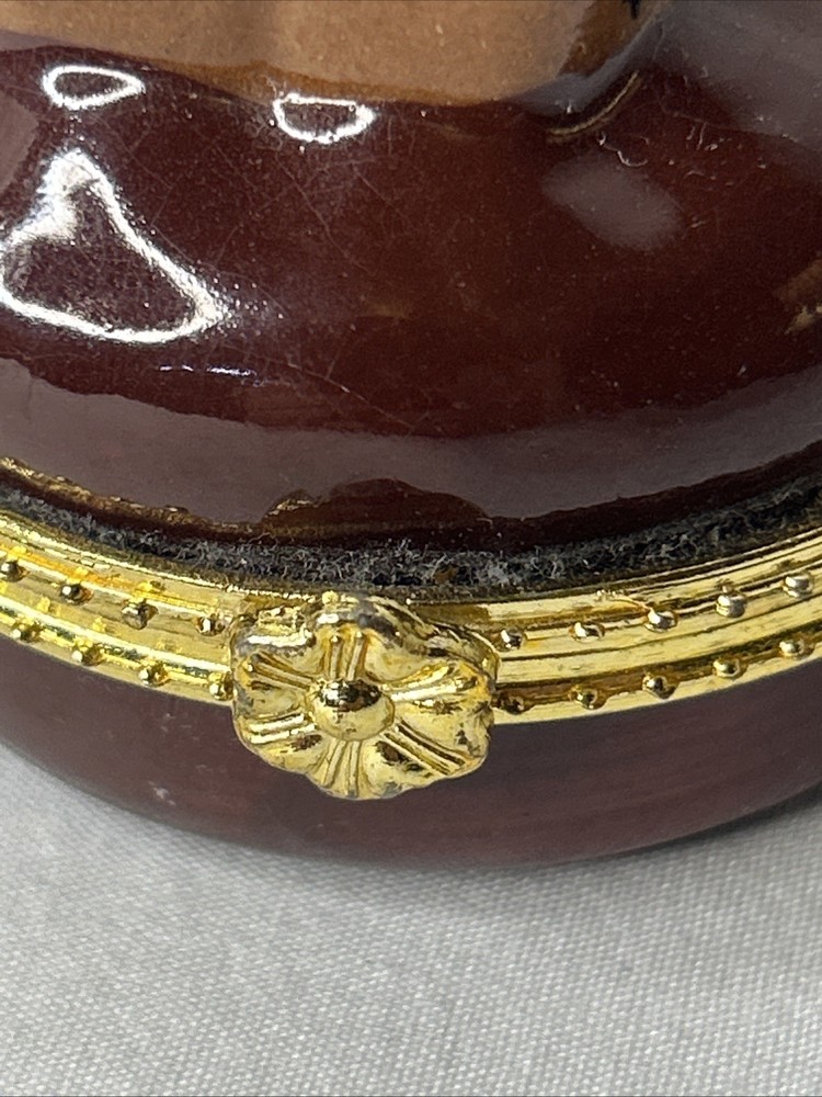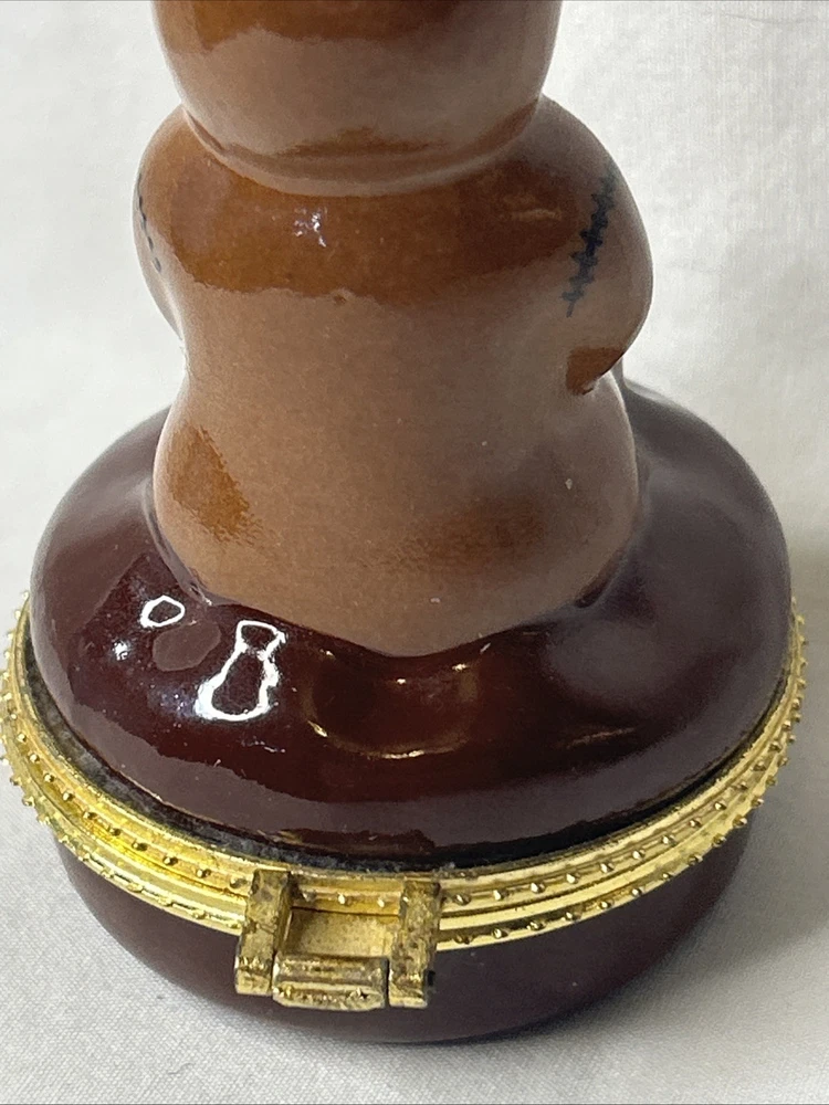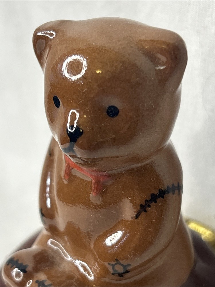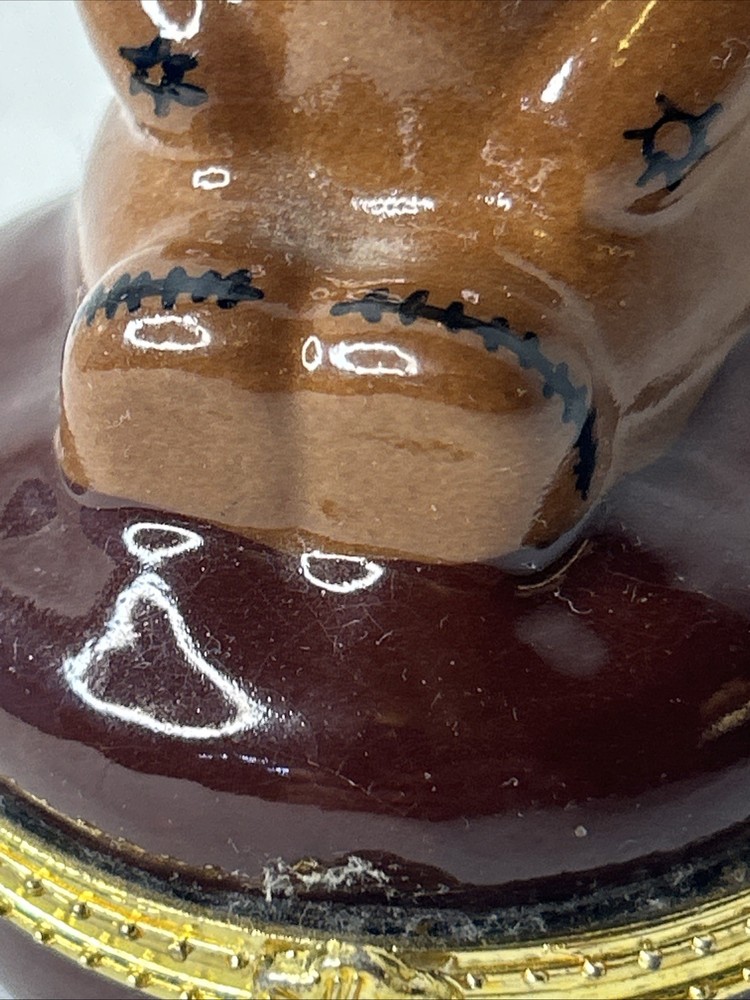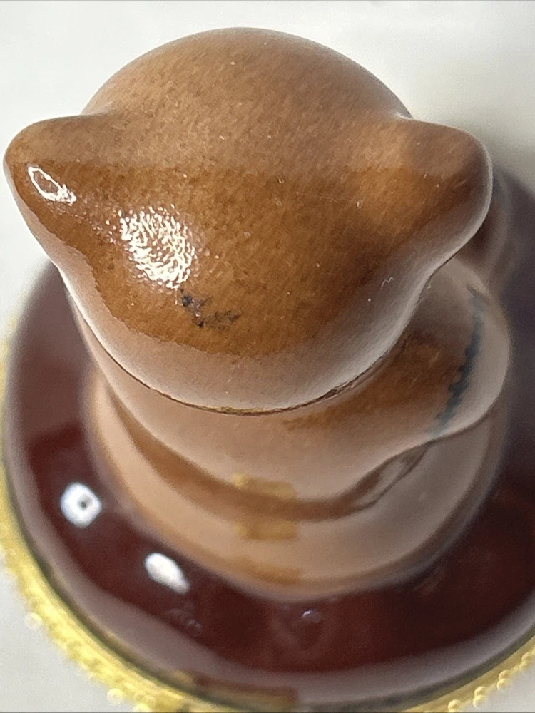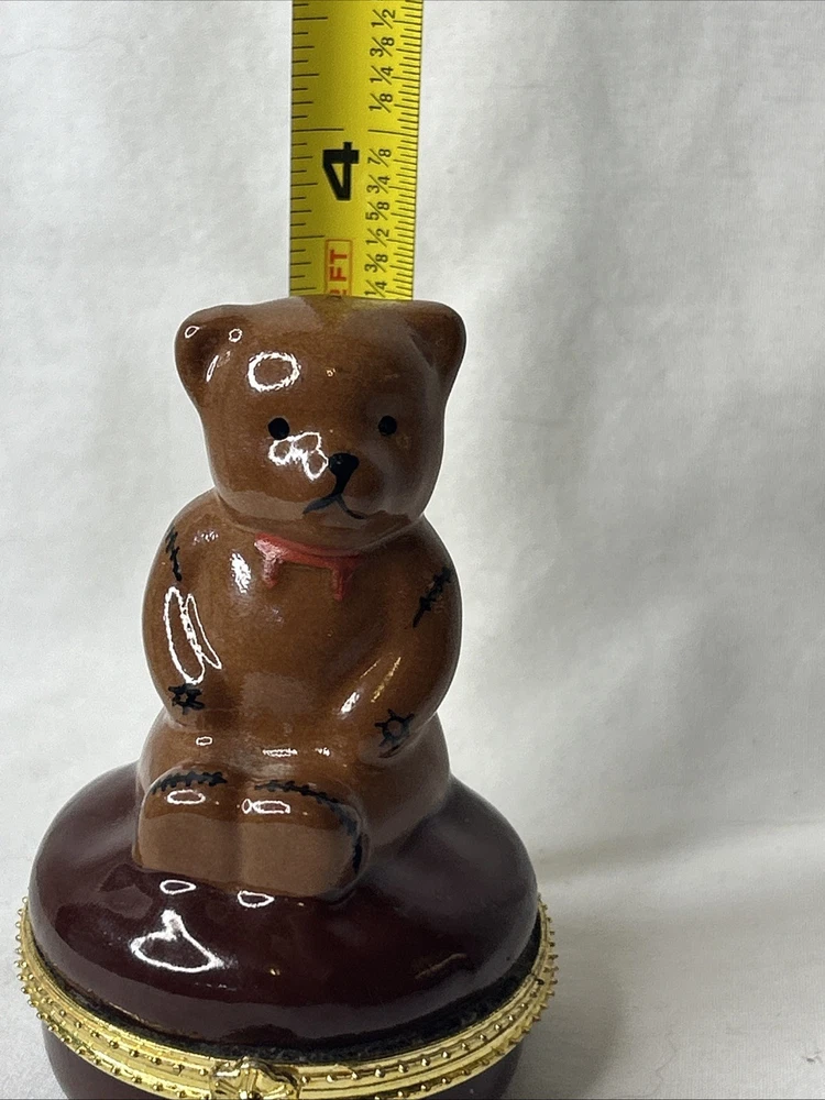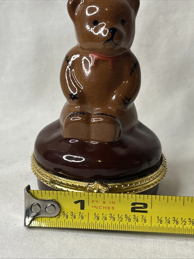 vintage Silvestri Teddy Bear Trinket Box, made of brown porcelain. It features a hinged lid for storing small items like jewelry. The design includes a teddy bear with painted stitched seams and a painted red bow tie. It measures approximately 3.5 inches tall and 2.5 inches wide. It is a collectible item, often sought after by enthusiasts. No box Please see pictures for description and condition of this vintage item.