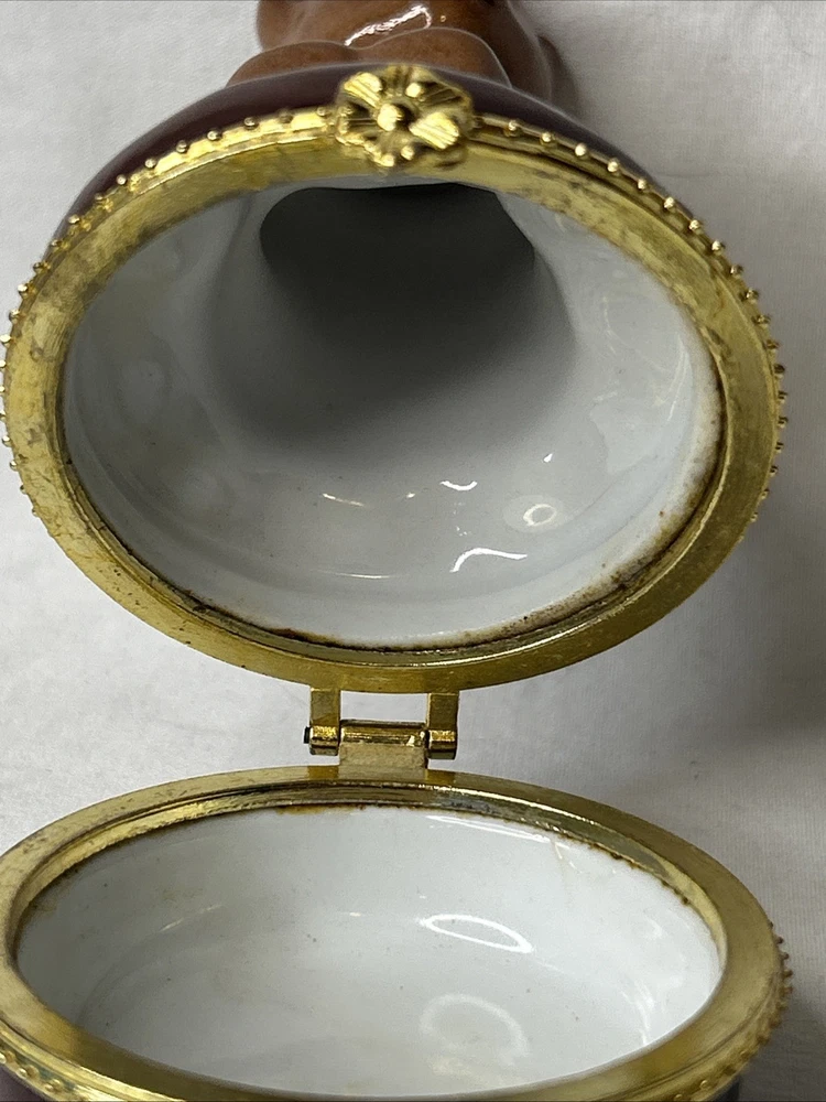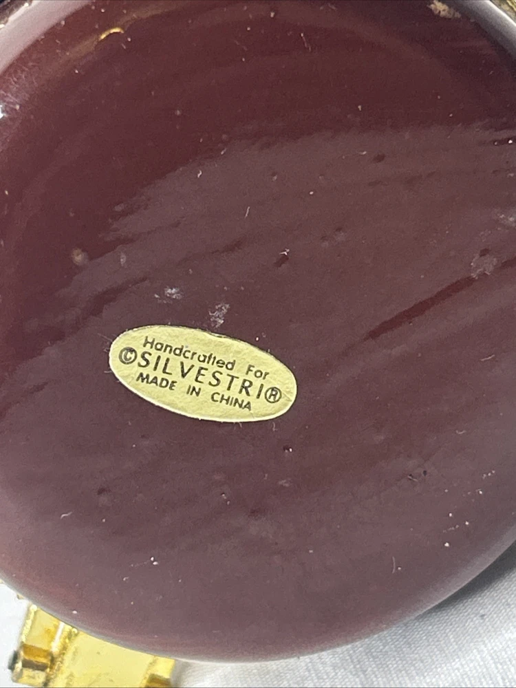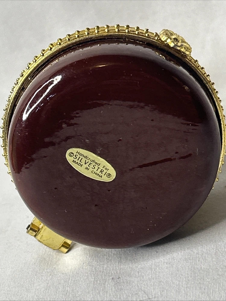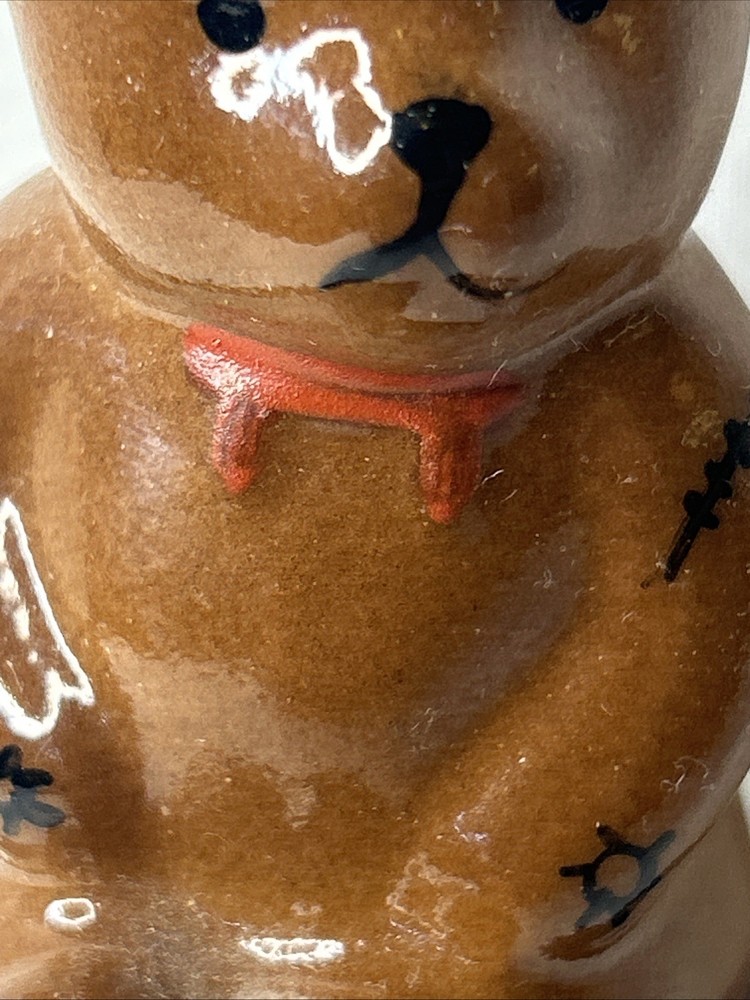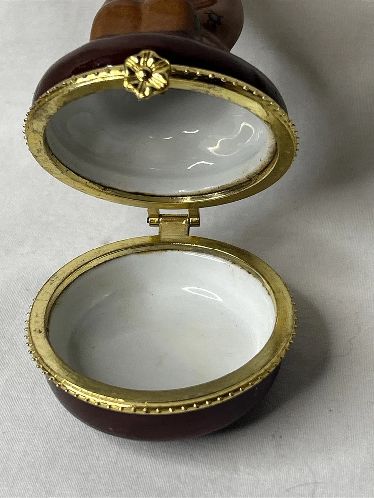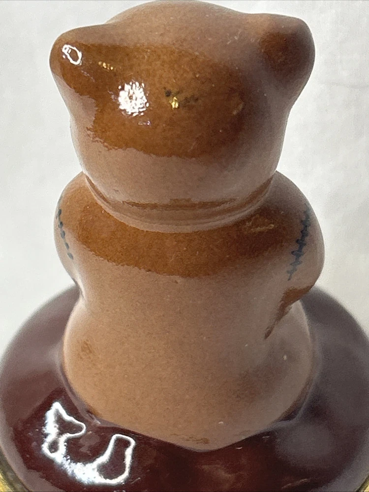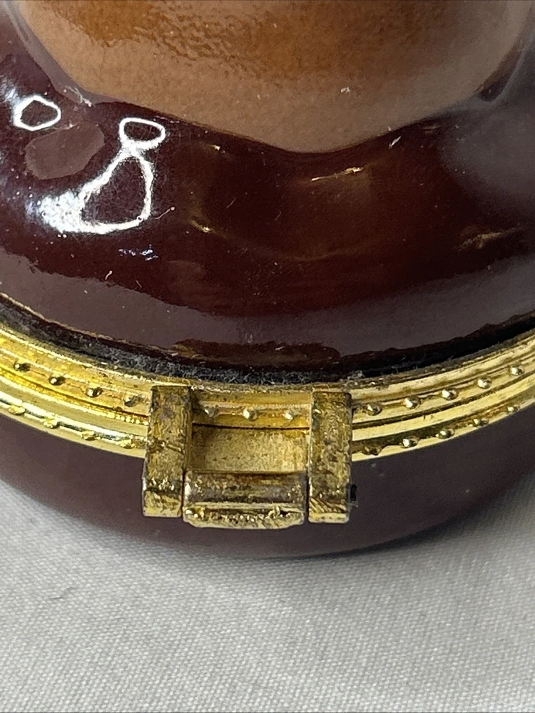 vintage Silvestri Teddy Bear Trinket Box, made of brown porcelain. It features a hinged lid for storing small items like jewelry. The design includes a teddy bear with painted stitched seams and a painted red bow tie. It measures approximately 3.5 inches tall and 2.5 inches wide. It is a collectible item, often sought after by enthusiasts. No box Please see pictures for description and condition of this vintage item.