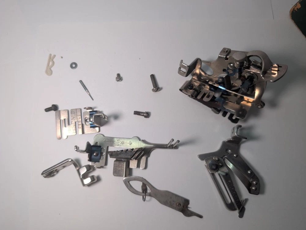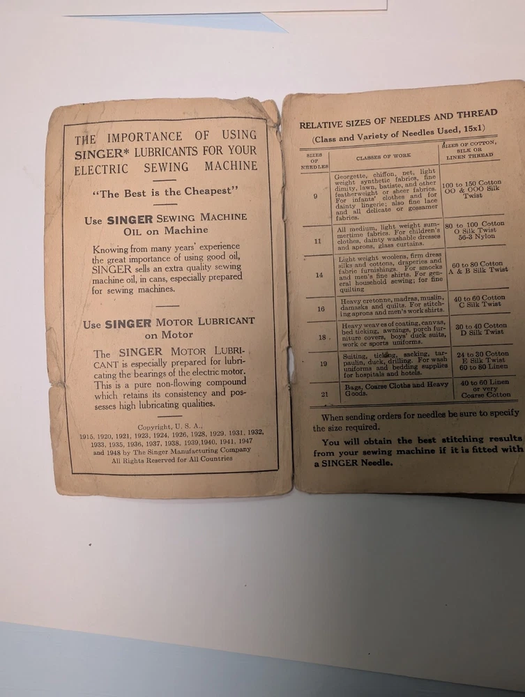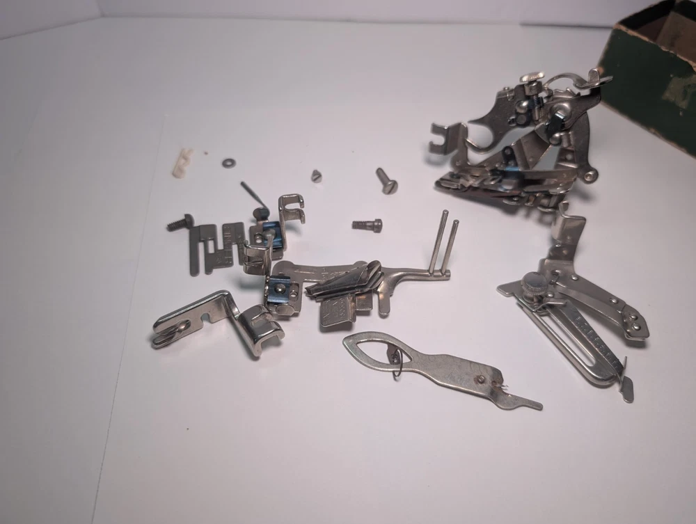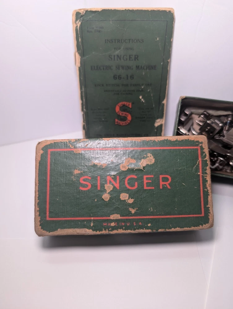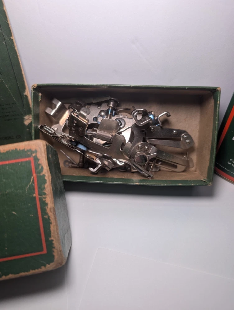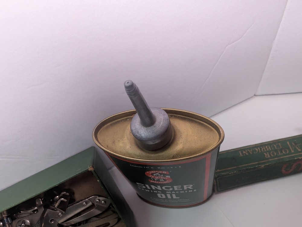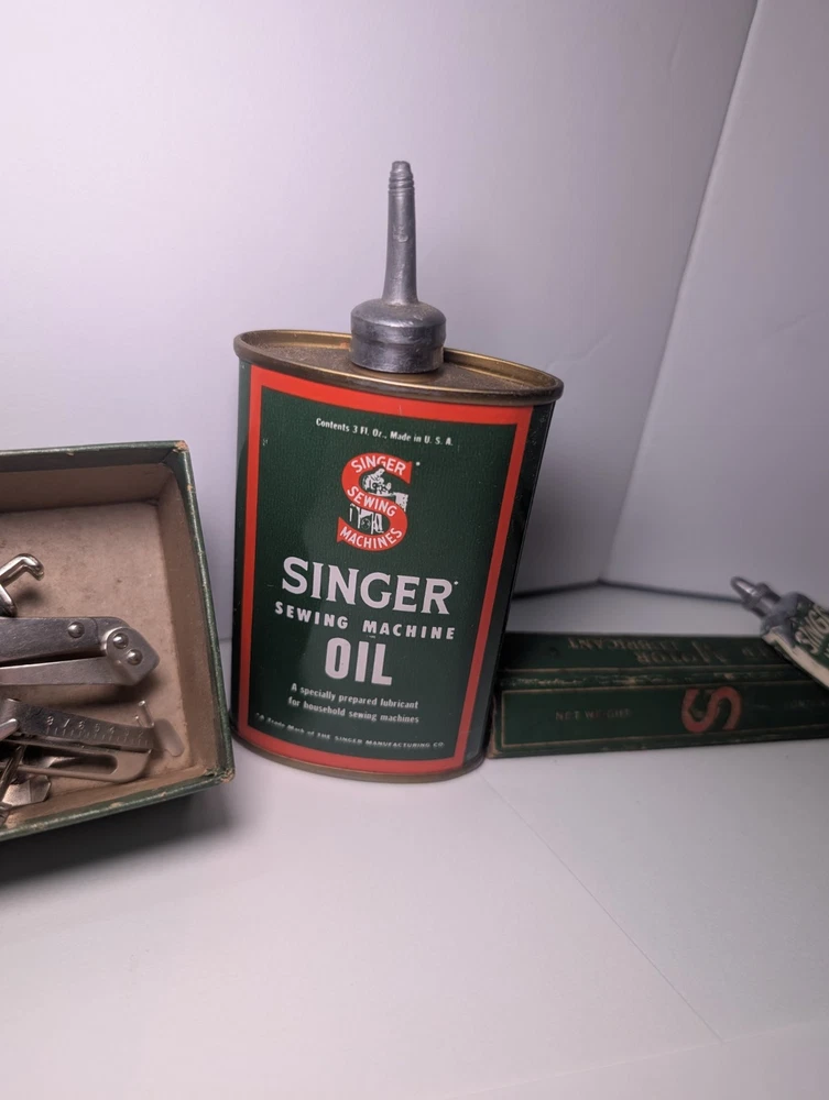 This lot includes a vintage Singer sewing machine attachment set in the original box, a sewing machine oil can, motor lubricant and book cover only. These items are made in the United States and are part of sewing machine accessories and machine parts & attachments. **See pictures for details** If you have any questions feel free to message me on eBay. 😊