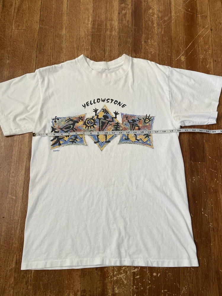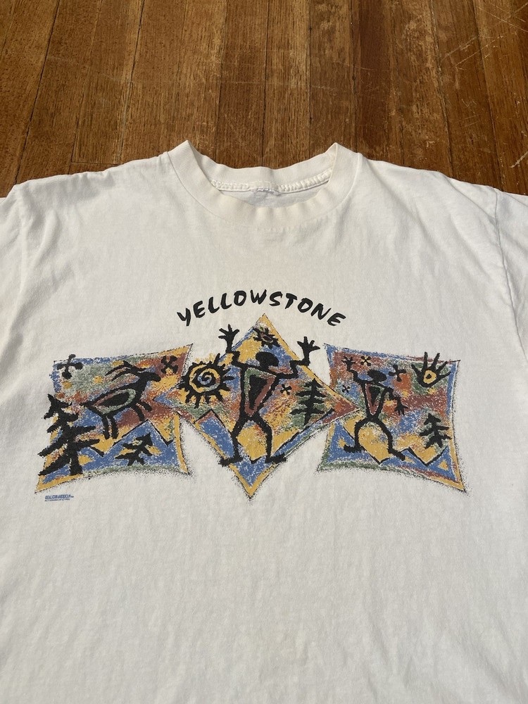 This Vintage Single Stitch Yellowstone National Park Center Logo White T-Shirt in size Large is a classic piece from the 90s that is perfect for any nature lover or outdoor enthusiast. Made of comfortable cotton material with a solid pattern and short sleeves, this t-shirt features a crew neckline and is machine washable for easy maintenance. The inclusion of the Yellowstone National Park logo adds a unique accent, making it a must-have addition to any collection of 90s-themed clothing. Perfect for wearing all seasons long, this t-shirt is a timeless and stylish choice for any wardrobe.