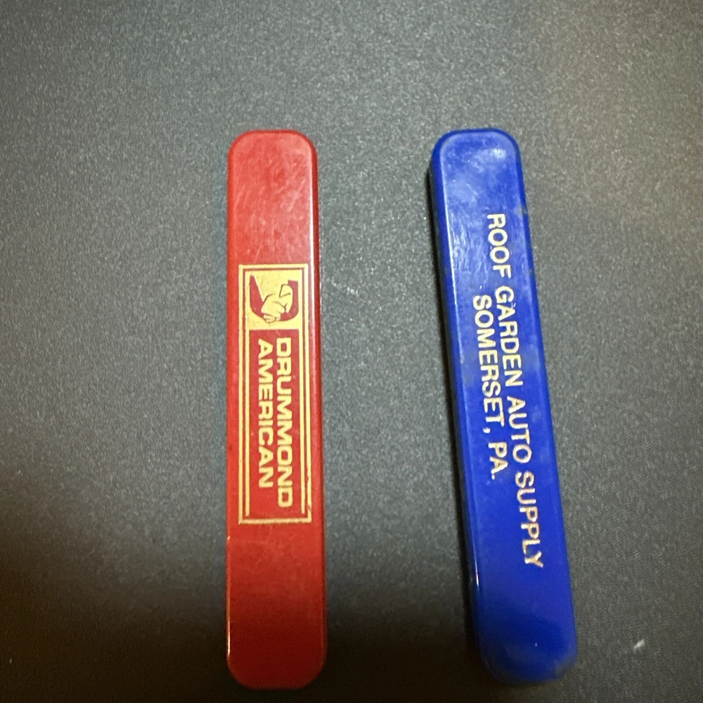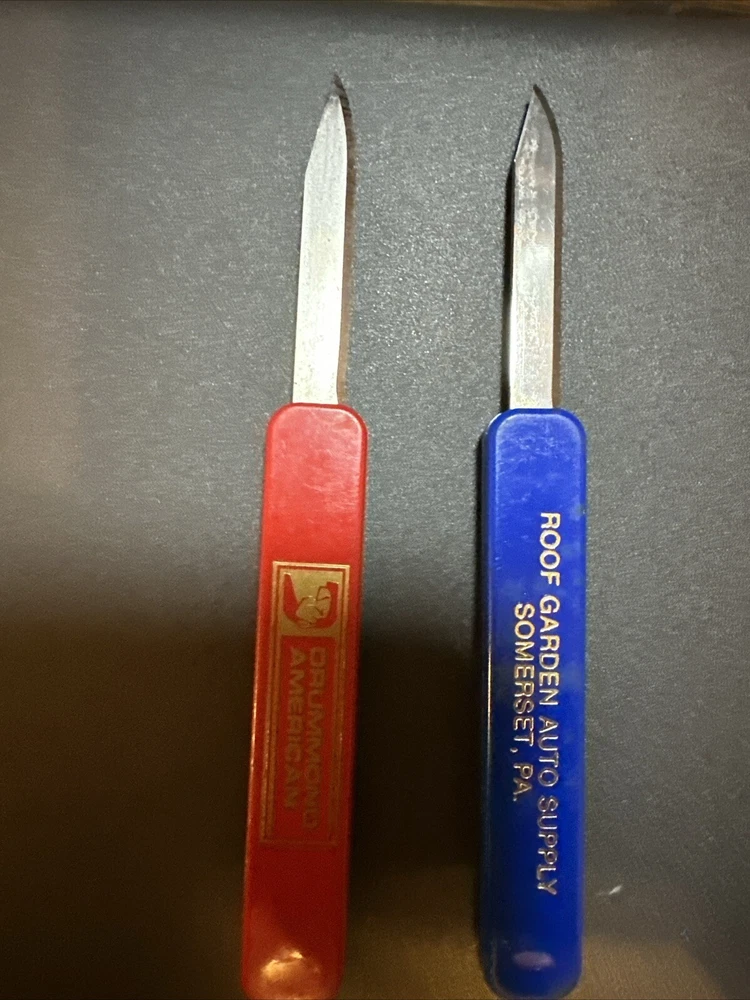 This vintage set of slide out advertising knives is a must-have for any collector. The knives feature a manual opening mechanism and have a plain edge blade. One knife is colored red and the other is blue, both are original and were manufactured in the United States. The knives are of the pocketknife type and have one blade each. They are a classic model and are perfect for any collector.