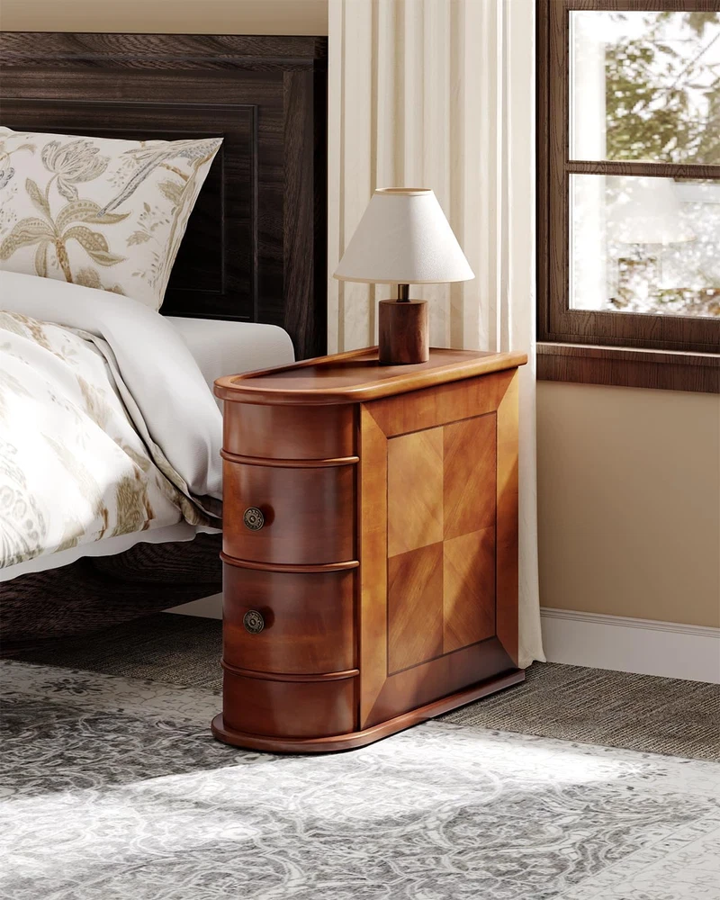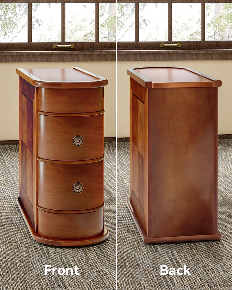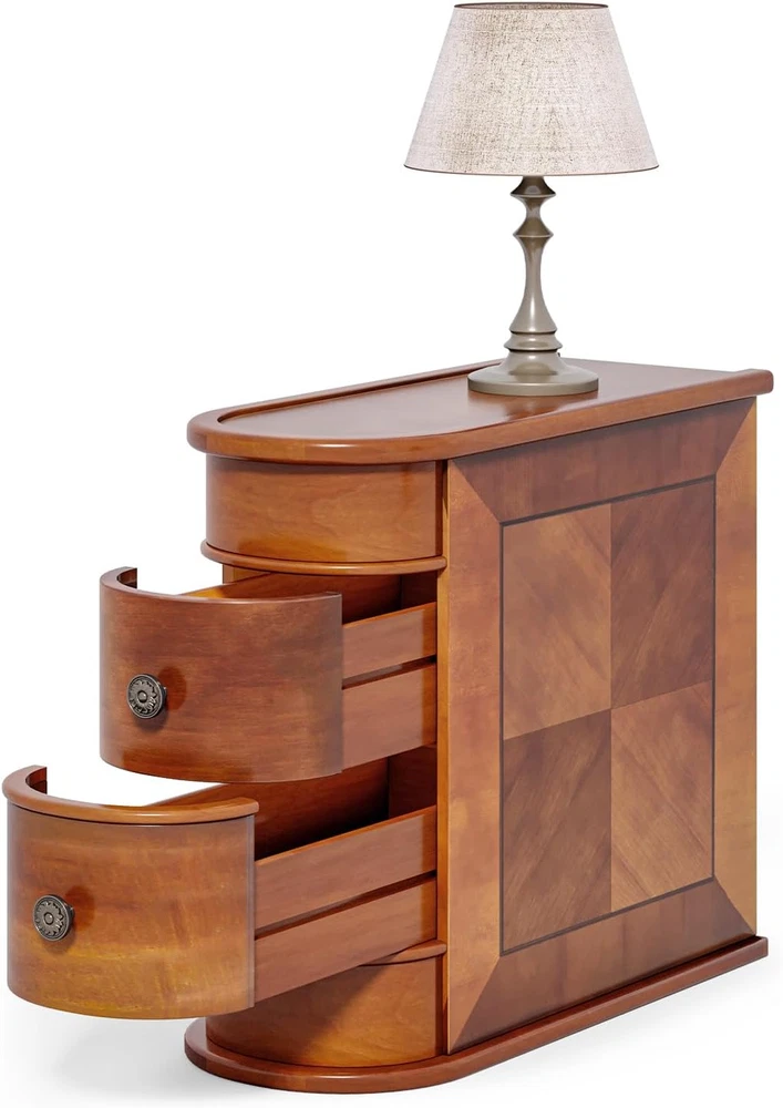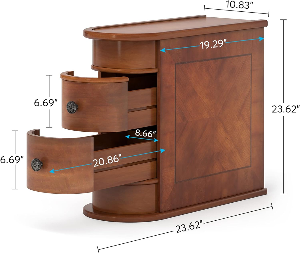 No assembly required: Unlike other narrow side tables, our side end table comes fully assembled, saving you time and hassle. Dimensions: 23.6"L x 23.6"H x 10.8"W. Ample space: With 2 sliding drawers, our sofa side table offers plenty of storage for a variety of items, such as TV remotes, snacks, drinks, toys, game consoles, books, magazines, keys, candles, and jewelry. The top surface is perfect for a warm lamp, a vase of flowers, photos, and more, allowing you to enjoy a cozy evening. Multi-functional: Our slim end table is versatile and space-saving. It can be placed next to a sofa or loveseat as a couch side table or sofa end table, used as a nightstand or kids' night table in a bedroom, or as an accent table in small spaces. It's also great for the office to store files and other items. Sturdy and durable: Made of premium Oak Higher E1 MDF board, our simple bedside table is waterproof, eco-friendly, and recyclable. It has an increased contact area with the floor for added stability and features a full solid wood design without any metal frame, making it high quality and high-end in appearance. It offers a comfortable and durable home life. Classic and vintage style: Our side table has an attractive Early America-style design in brown that complements any decor. The smooth surface is easy to clean, while the clear texture adds elegance and refinement. The unique arc design makes it comfortable and gentle to the touch, reducing the risk of accidents and making it safe for children. Product Description This sofa-side table effortlessly straddles classic and modern design sensibilities. Flaunting a sleek silhouette, the end table is further distinguished by a clear, textured surface and drawers that elegantly curve at the edges. Specifications Color Brown Material E1 MDF Board Item Overall Size 23.6"D x 10.8"W x 23.6"H Item Weight 33 lbs The Load Capacity An adult can sit. (About 150 lbs) Design 2 Sliding Drawers + Arc Side Assembly Details No Assembled Required ! No Assembly End Table with 2 Drawers Every sofa's trusted companion, end tables not only add aesthetic appeal but also offer practical utility. All-wooden Design End Table Fully Assembled - No need to look around, you have an end side table with 2 drawers that come up assembled. Large Capacity - 2 drawers help with organization, enough to put your home pieces of stuff, storage units are cleaner, offering better protection for your belongings against moisture risks. More Details You Should Know. Vintage Style - There is no modern furniture design that can surpass vintage furniture because of how timeless, class, and traditional they are. More No Assembly Required End Tables End Table With 2 Drawers No assembly required, closed back End Table W/ Charging Station No assembly required, closed back, with outlets End Table With 3 Drawers No assembly required, closed back Style Vintage style Style Vintage style Style Vintage style