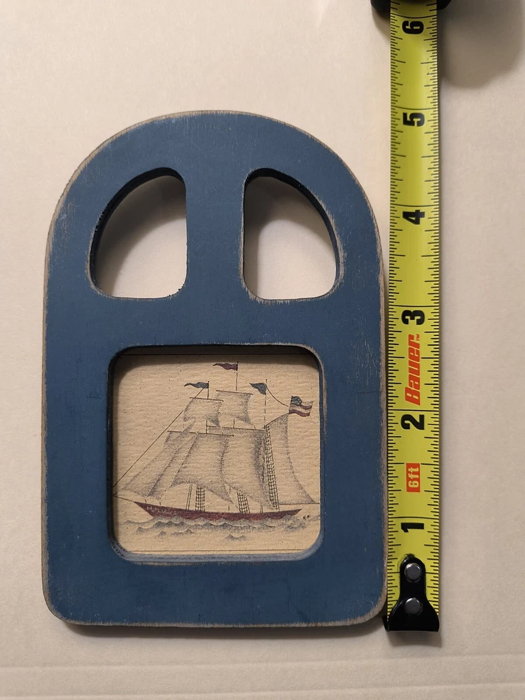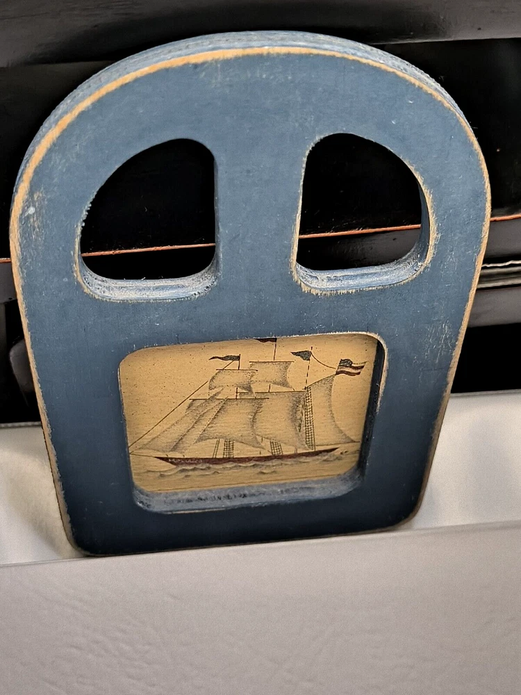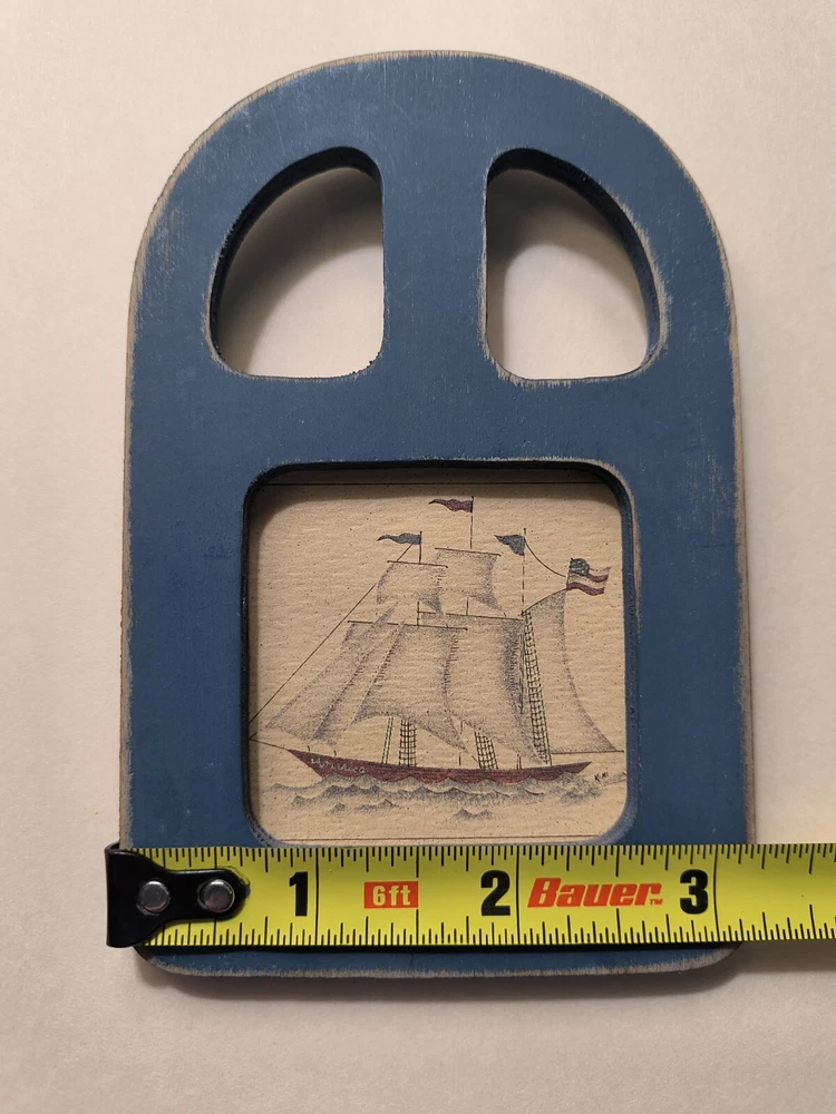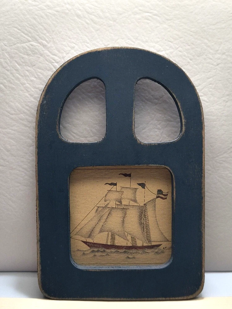 Small Decorative Wooden Wall Hanging With A Detailed American Sailing Ship Print In The Center. Country blue with sanded edges. This is a very nice, unique addition to any nautical decorated room. Please see photos for details of measurements and style. Thank you!