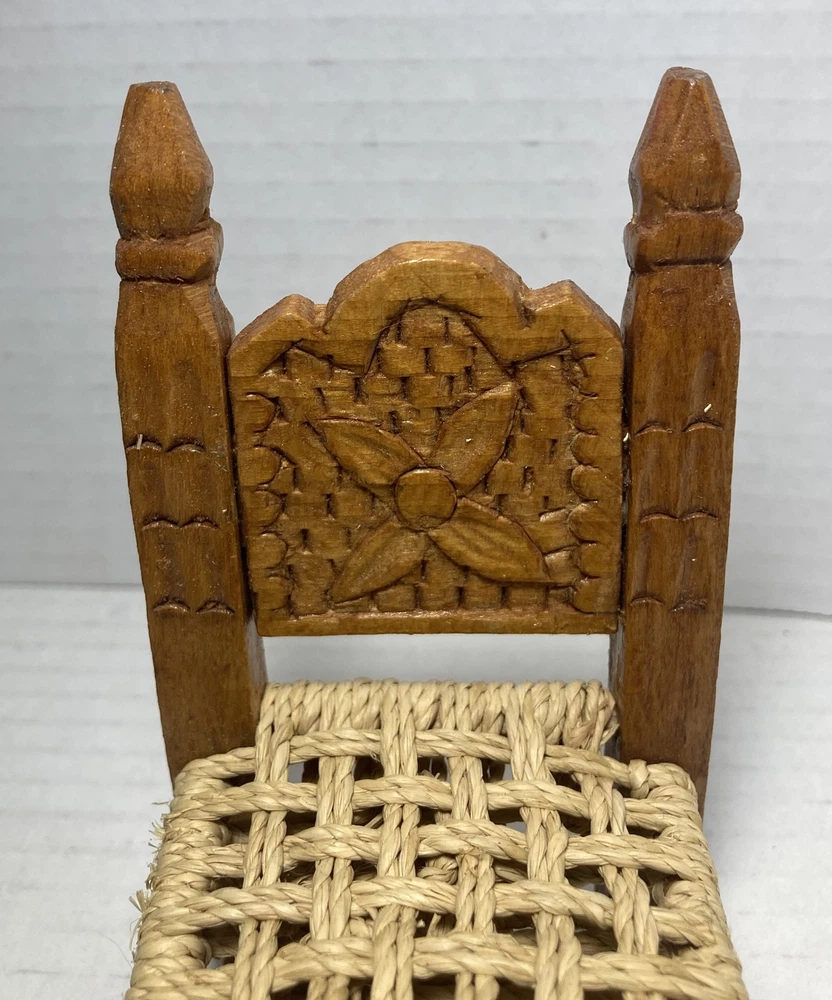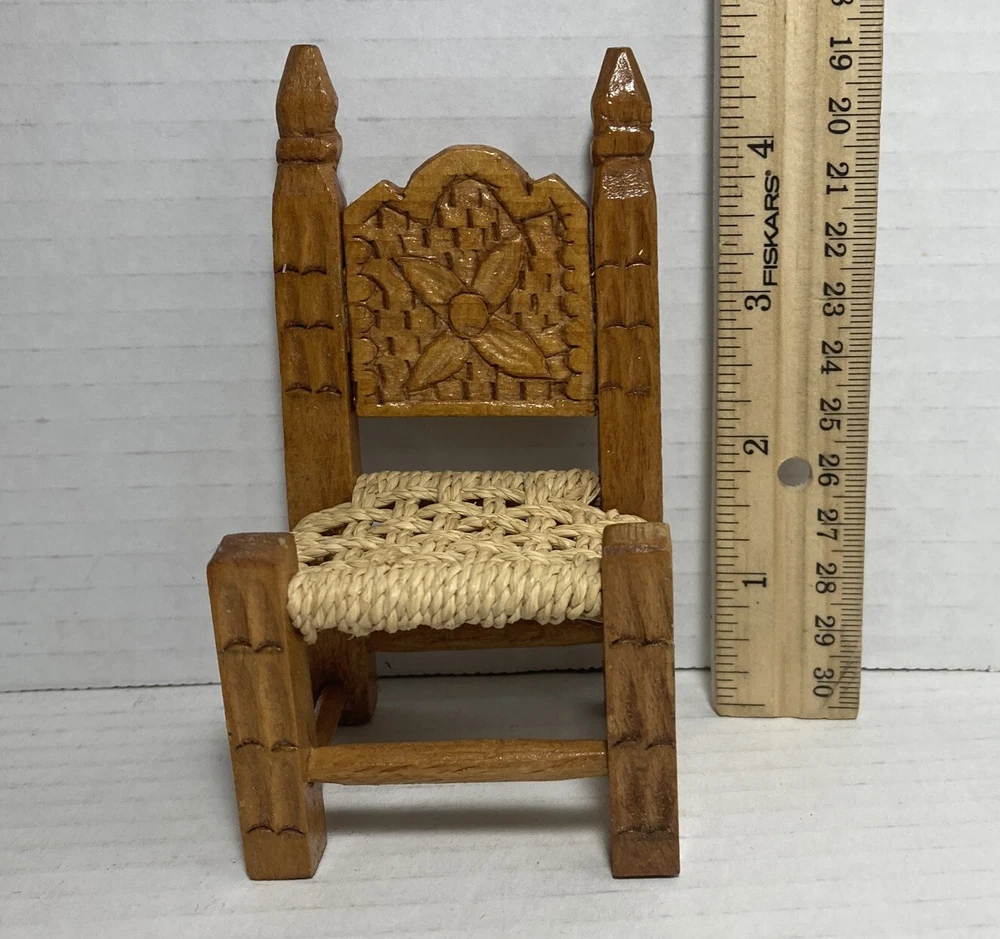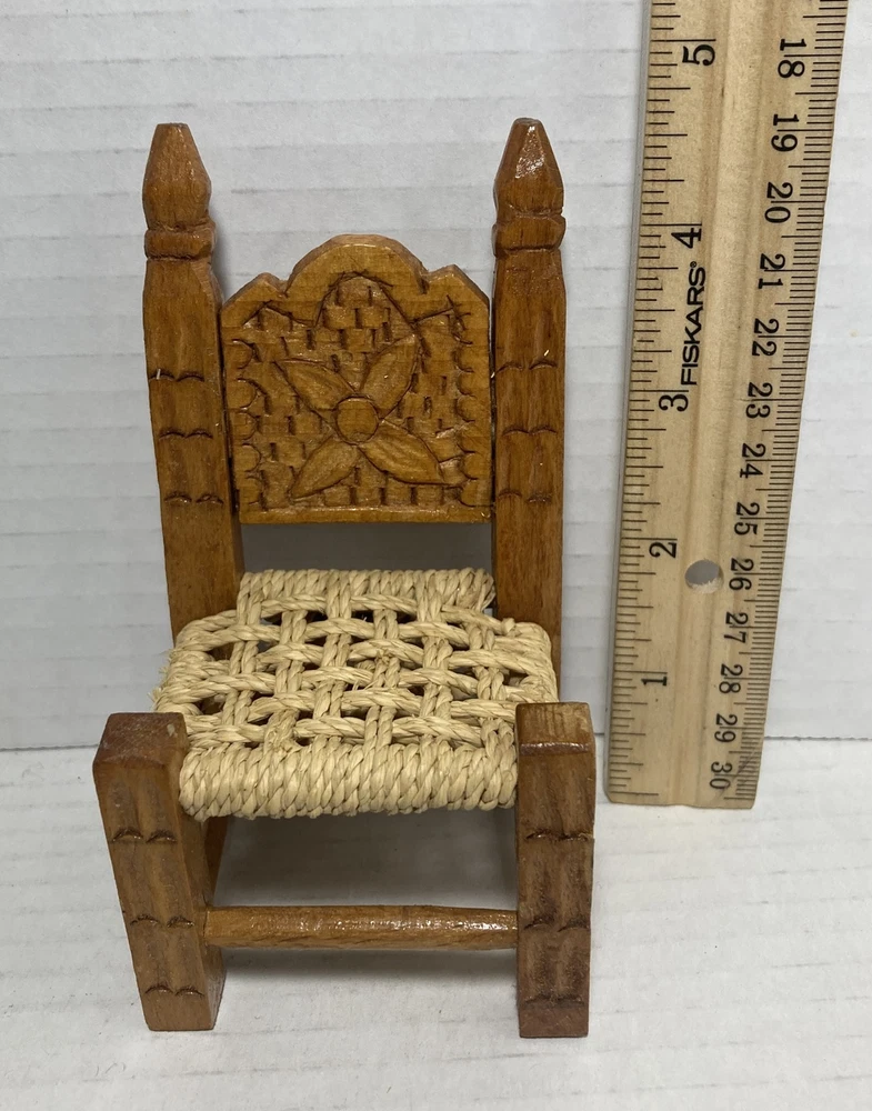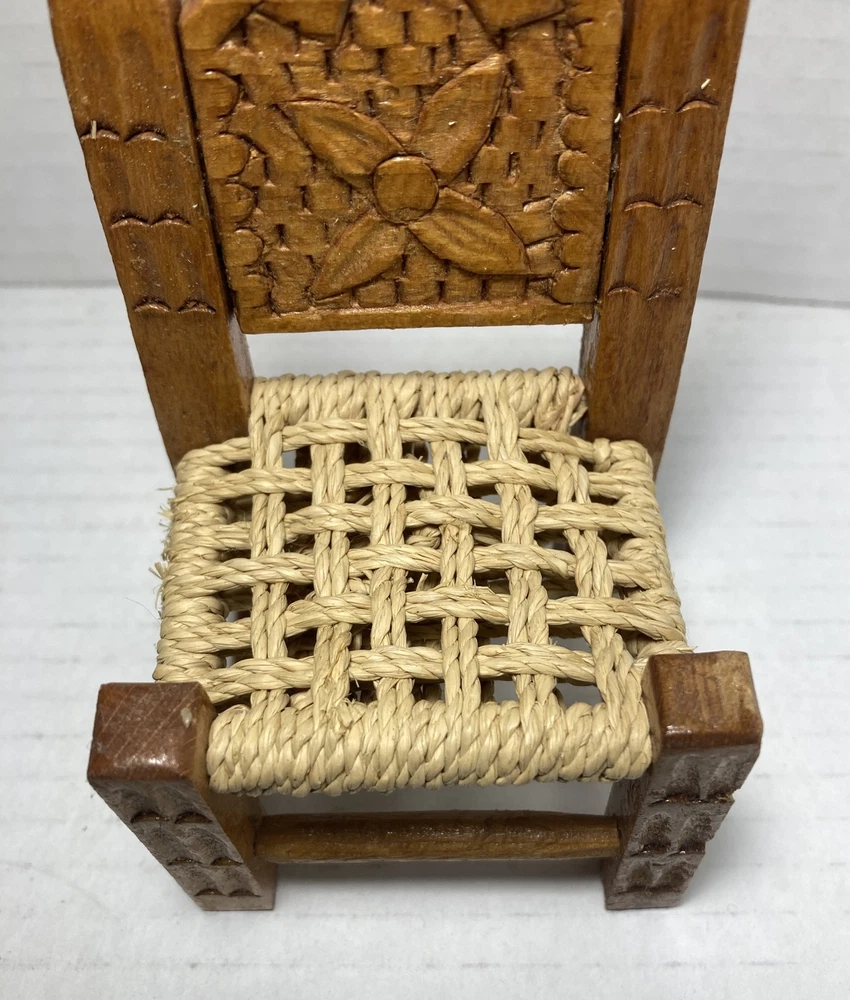 This vintage small doll chair is a unique piece of furniture that is perfect for doll collectors. It is hand made and carved out of wood, with a jute seat that adds to its antique style. The chair is of brown colour, 4 3/4 inches in height and is an original piece, not a reproduction. The chair's style and material make it a great addition for any dollhouse or furniture collection. This is a vintage piece that is in overall good shape. It has some minor wear on the jute string seat. This chair is a must-have for antique enthusiasts and collectors who appreciate handcrafted items. The item will ship out safely and securely the same or next business day.