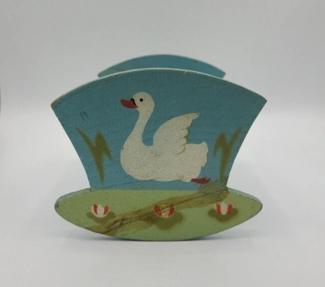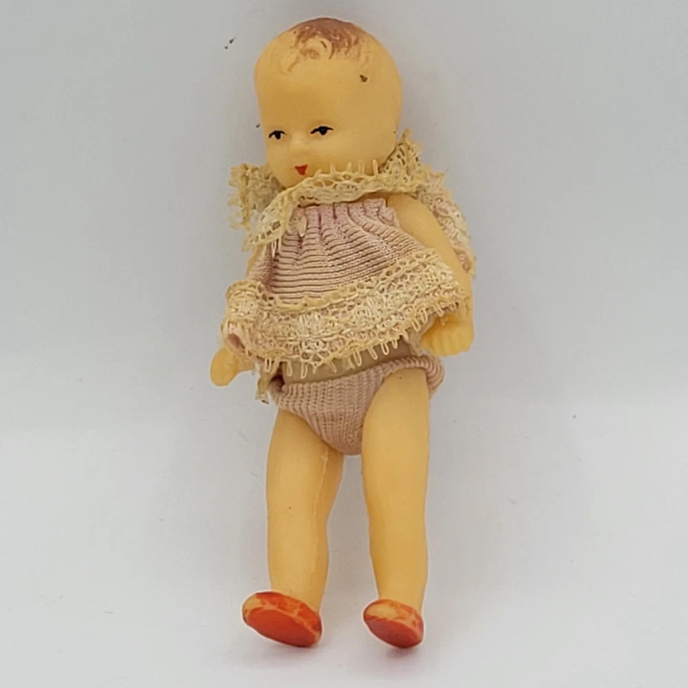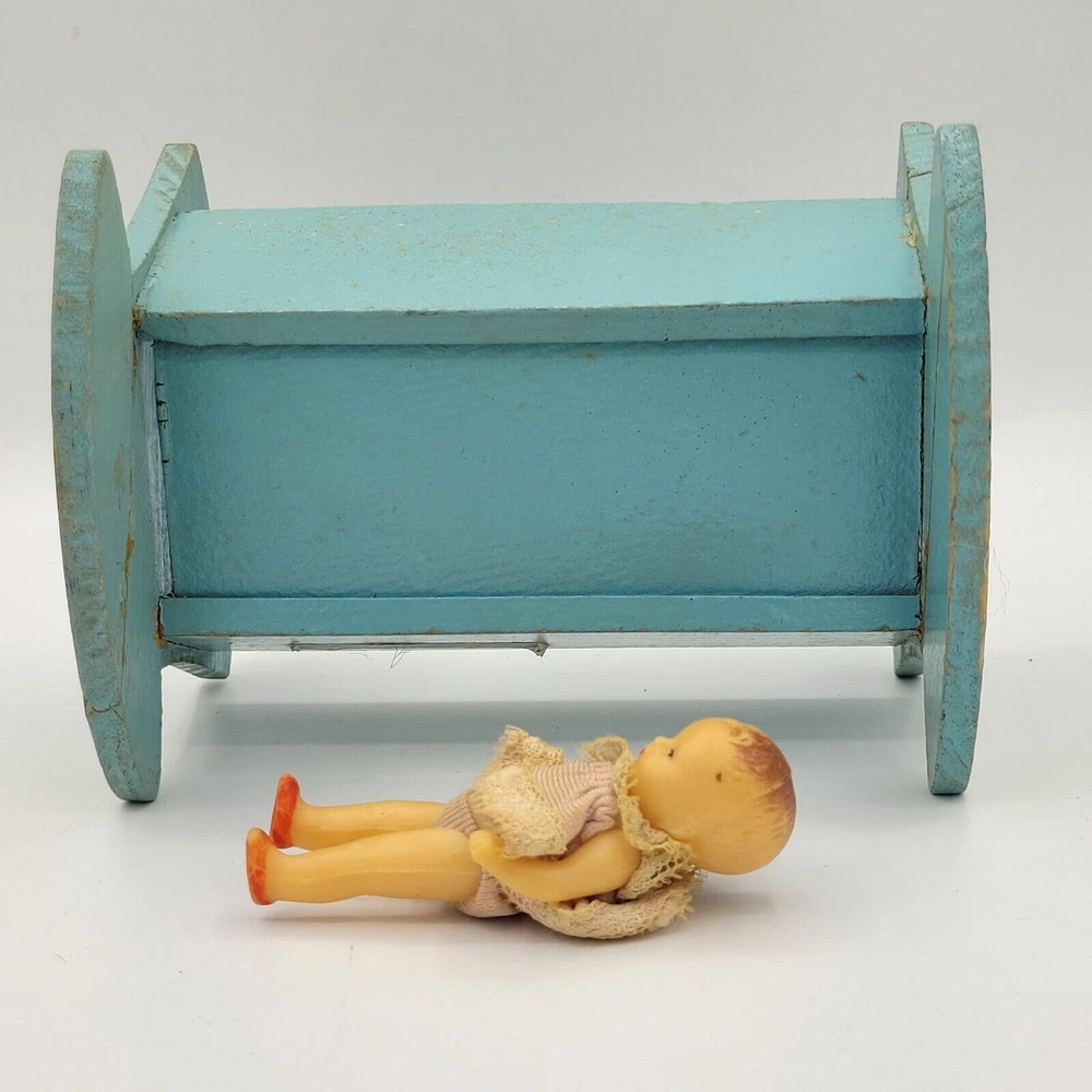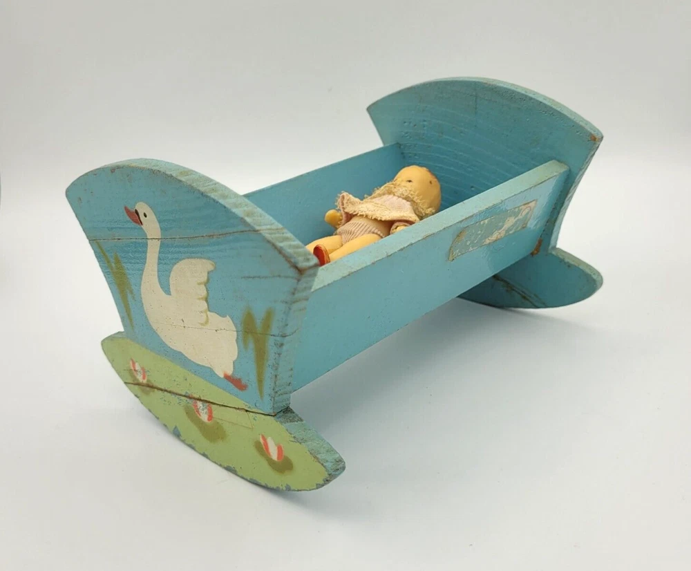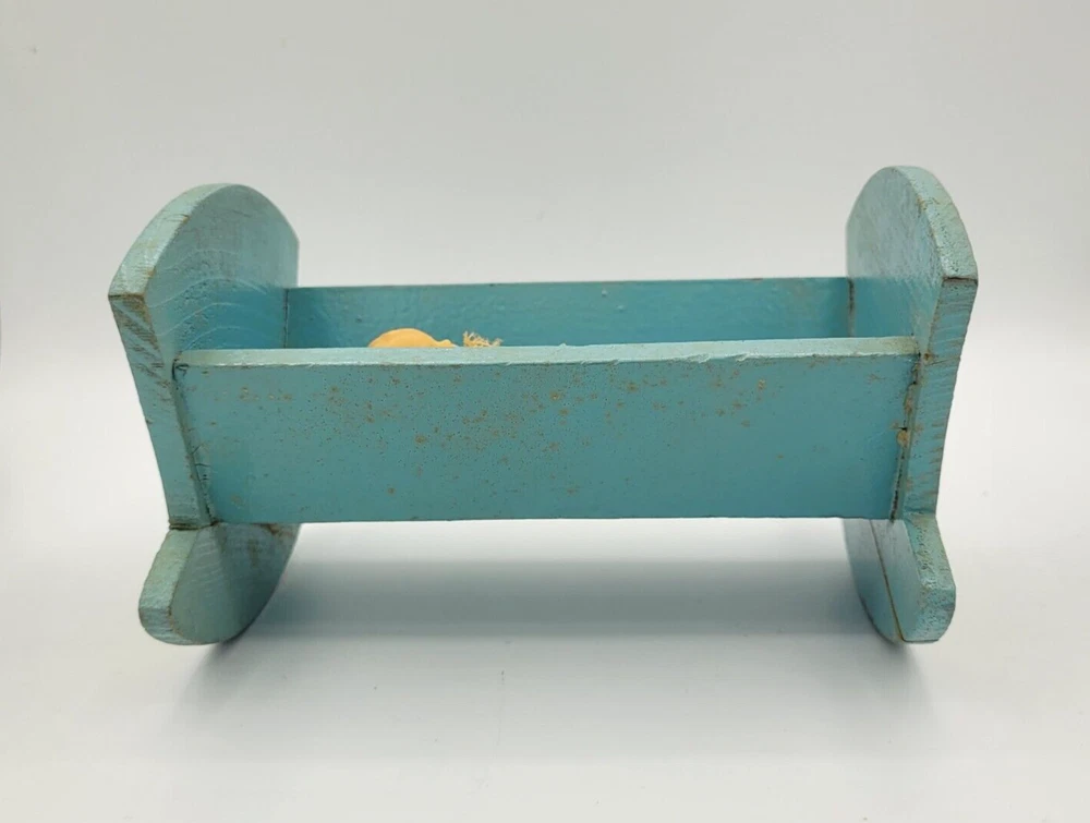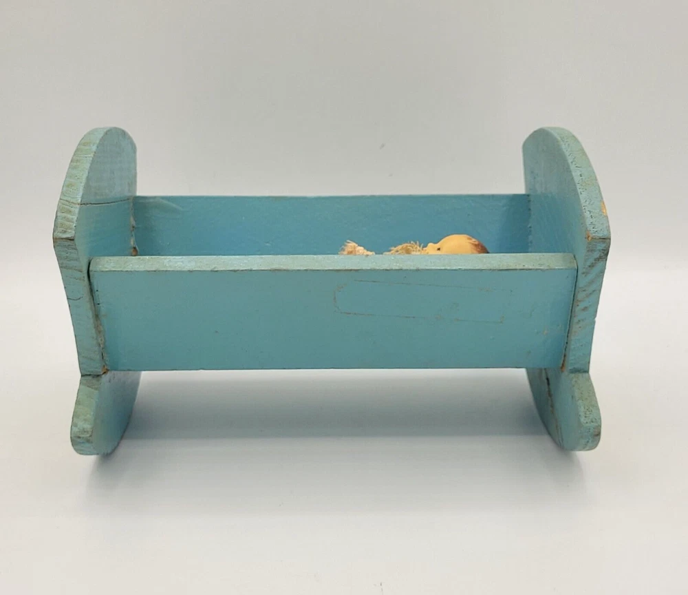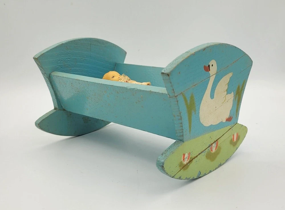 Vintage Small Wooden Doll Cradle With Doll Features: Hand painted cradle featuring folk design Baby doll with hand painted features. Vintage items show wear consistent with age. Cradle has an area of repair on end, see pictures. Baby doll shows some hair and shoe, etc. color loss and fading, discoloration of clothing. See pictures for more details. Approximate cradle measurements are: 4" H x 6" L x 4.5" W Approximate baby doll measurements are: 3.25" L x 1.25" W Packaged securely for shipping.