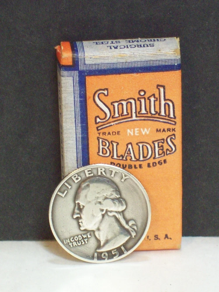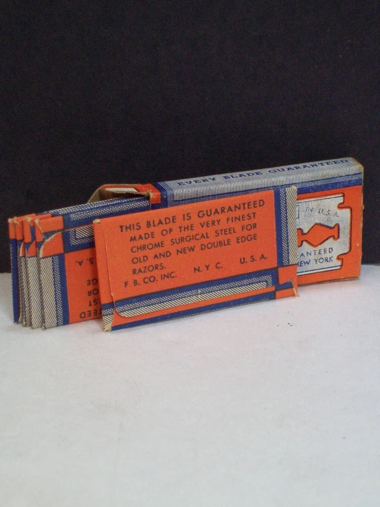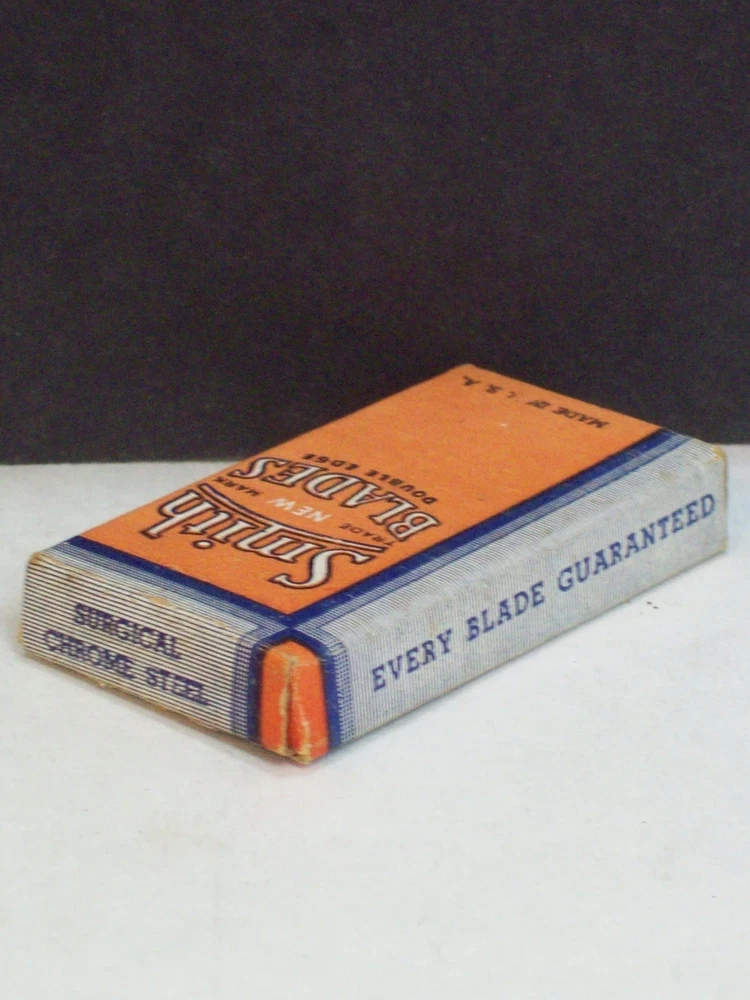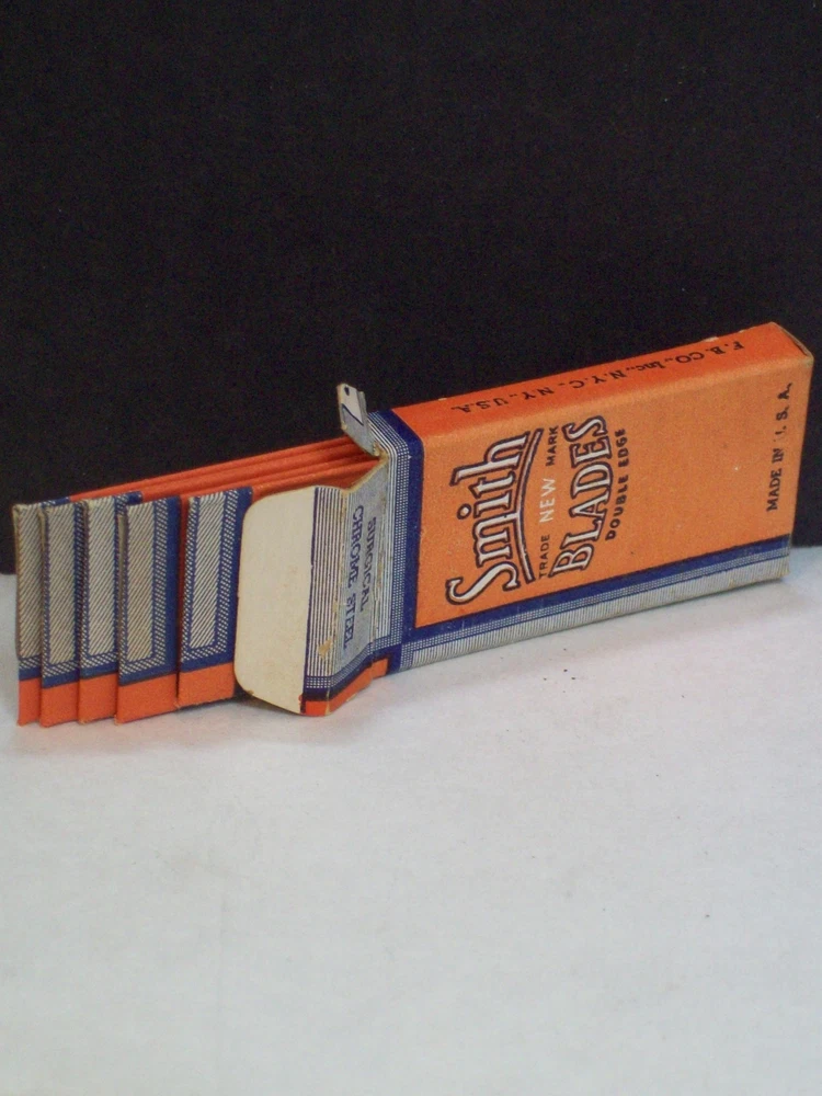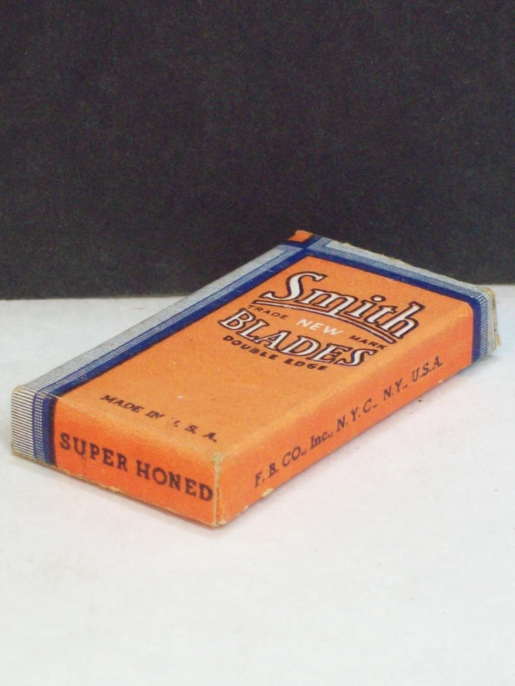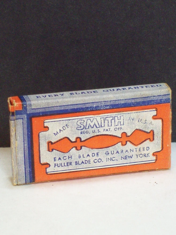 Please check the pictures to examine the detail, checking the pictures and item description for condition. New as in unopened wrapped blades. If you like pins, jewelry, postcards, matches, matchbook covers, patches please check my other listings. See my other listings for more great items! Description: Old Vintage Smith Double Edge Razor Blades Chrome Steel 5 Wrapped blades in Fuller Blade Box Co NY Box Safety Razor Blades Advertising Shaving collectible pictured only. This cardboard box contains five unopened wrapped razor blades. The printing, colors, graphics, are clear on the box but a little faded. The front states, Smith Blades Double Edge New Trade Mark. On the back there is a representation of a Smith razor blade. I did not open the wrapped blades to check the condition of each blade. These vintage razor blades are not recommended for use. Caption: Smith Blades Manufacturer: Fuller Blade Co F&B Type: Safety Razor Blades Box Size: Approximately 2" by 1 1/8" by 5/16" CONDITION & TERMS By bidding / purchasing buyers understand & accept that: items are represented to the best of my ability, are used or aged, and may contain unseen faults the buyer will take full responsibility for. All items are as found and I do not sell reproductions. Due to age, history, there is light surface wear with few spots and fading. This item is preowned and contains imperfections. Due to variations between computers, color may vary. Please contact me prior to bidding to clarify any questions or concerns. SHIPPING Shipments start at First Class Package Rate. This rate is higher than First Class Envelope but it allows me to use extra packing material and safely ship your item quickly. Items that are 250.00 or more will require signature confirmation. Free shipping when you choose USPS First Class Package when shipped within the USA. Delivery time is a estimate that does not consider weather delays, holidays, or unexpected events. Note to Florida Residents State Sales Tax will be added to purchases. This item is not available for International purchasers. I AM HAPPY TO COMBINE LISTINGS! USA SHIPMENTS ARE POSTED WITH A TRACKING NUMBER! COMMUNICATION If you have any questions, please contact me early before the listing nears its end. Thank you for looking! inkfrog terapeak Listing and template services provided by inkFrog
