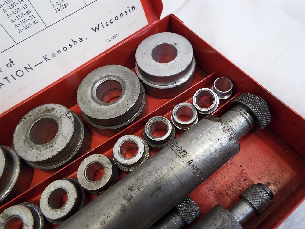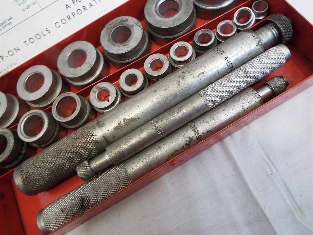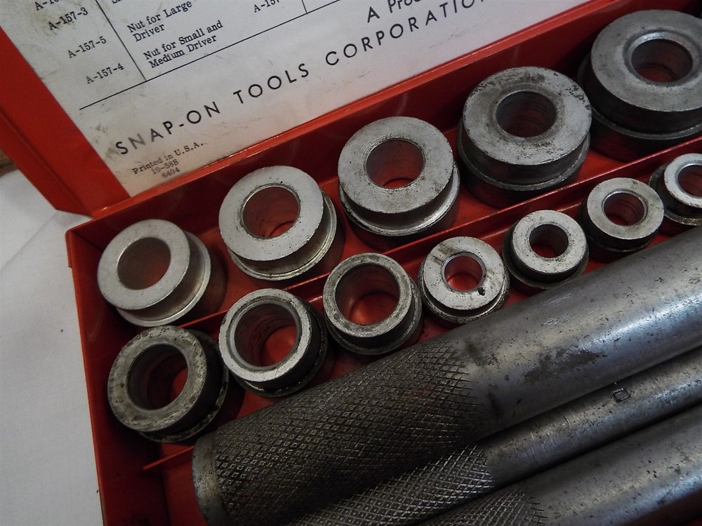 Item Description A bushing driver set. THe inner label reads Blue Point, but the handles and case read Snap-On. Looks to be complete, comes as shown. Looks to be sizes 3/8" to 1-3/8", not sure. Some mild soiling from use, some mild oxidation spots. Offered as-is. 020425 - FO We sell mostly USED and UNIQUE items. Expect minor evidence of use or imperfections, dings etc. from age. We take many photos of our items to assist with the description. Please use the photos to help judge content and condition. BUY WITH CONFIDENCE : We have sold over 25,000 antiques on-line since 1997 with over 15,000 positive customer feedback. We have been giving quality service to the on-line collector community for over 19 years. Our selling history speaks for itself so that you can buy with confidence. RETURNS : Accepted, full purchase price refunded upon return. Buyer to pay return shipping. Please inspect your item, and notify us of a return within 3 days of receiving it. SHIPPING : 99% of items shipped within three business days. Powered by SixBit's eCommerce Solution