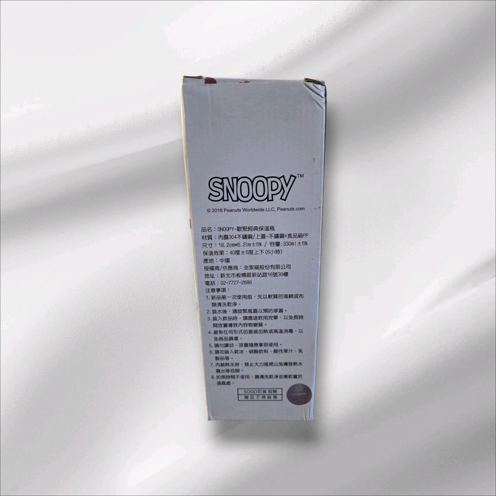 This unique Snoopy 2018 Gathering Time Thermos is a rare find. This metal thermos is brand new in the box and and has a stainless steel inner tank. Size: 18.2cm × 6.2cm ±5% / Capacity: 330ml ±5%