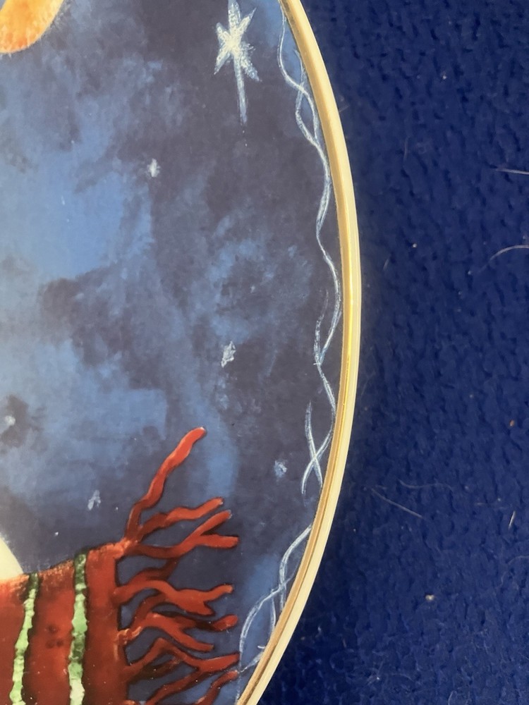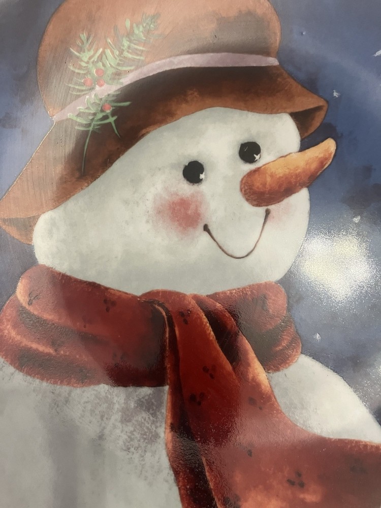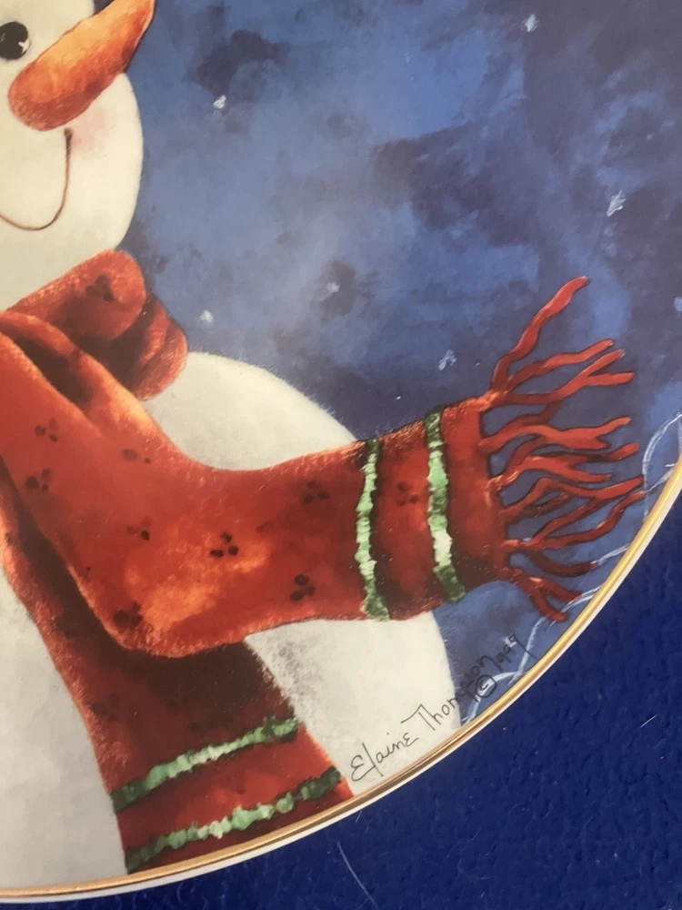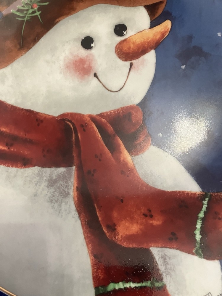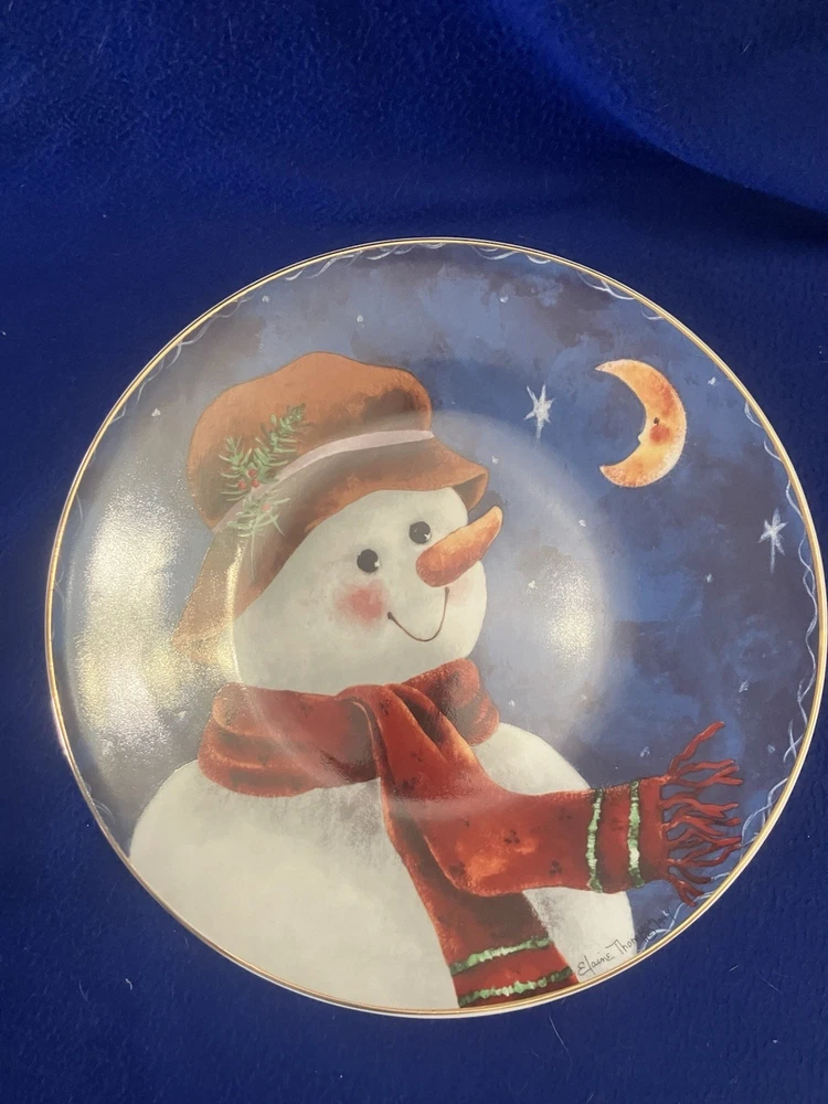 🎄Vintage Ceramic hand painted serving plate “Snowman under a Night Sky” designed by artist Elaine Thompson in 1997. Heavy ceramic plate, weighing 3 lbs, made in China and imported to the United States where it was designed by Artist Elaine Thompson and handpainted. Platter is round and a substantial 12.5” in diameter featuring a gold rim. Without a doubt a show stopping display piece! This is destined to become a cherished and memorable part of your holiday celebrations!