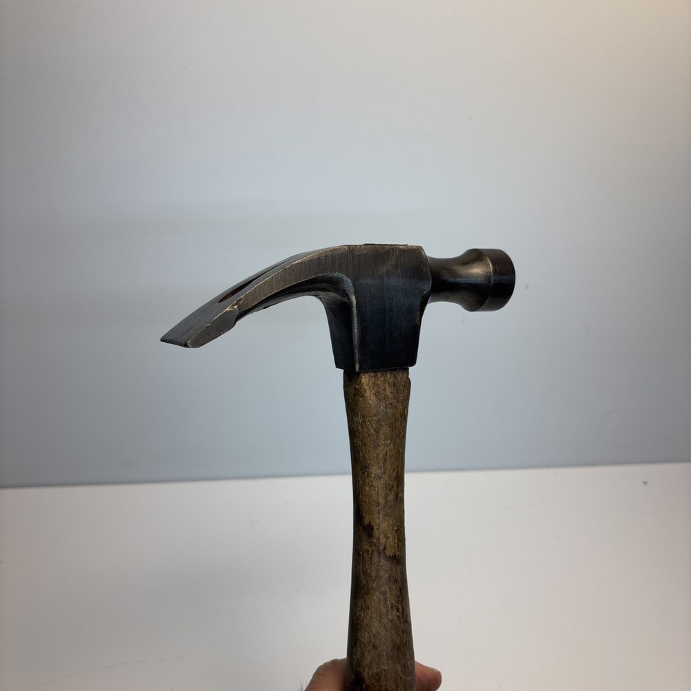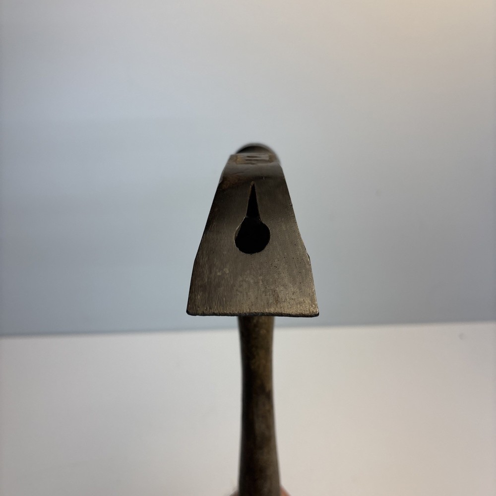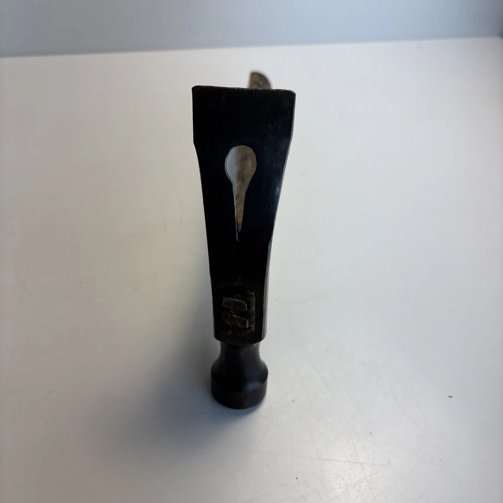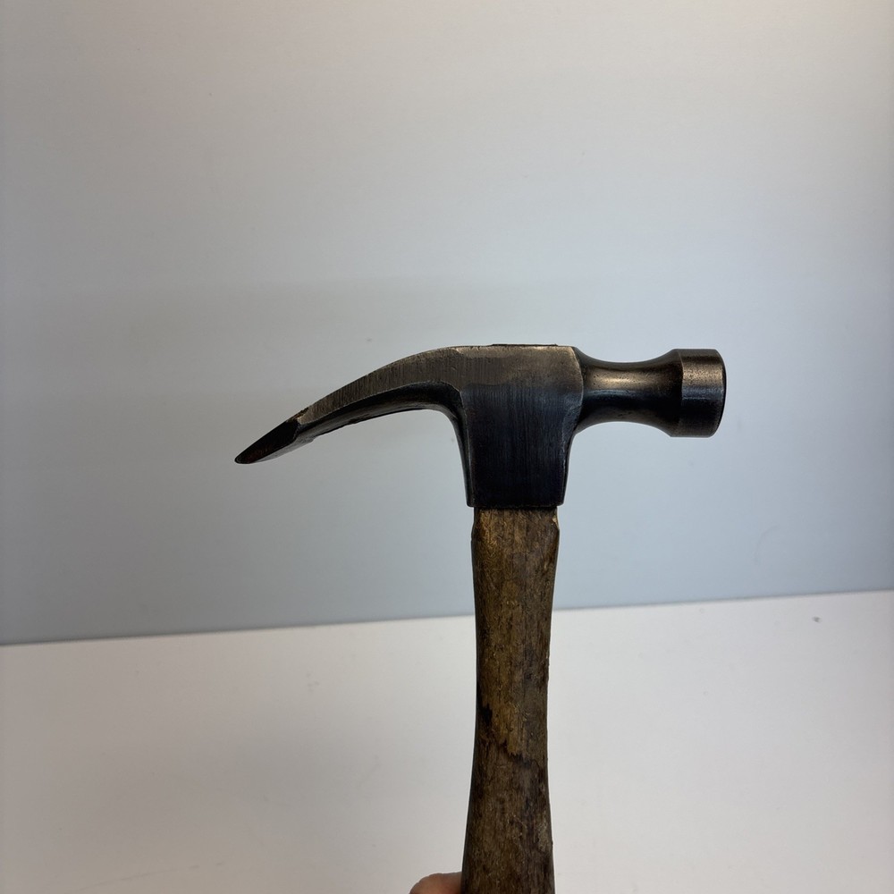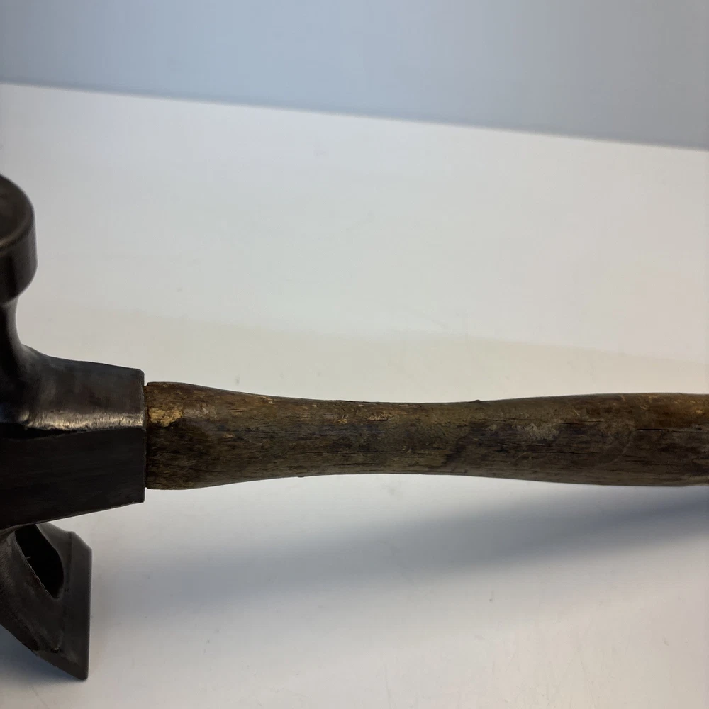 Vintage unmarked mason / bricklayer hammer with slotted nail puller claw. Forged steel head with smooth round striking face and wide blade-style claw featuring keyhole nail slot. Traditional wood handle. No visible maker’s marks. See photos for complete details. Condition Pre-owned vintage condition. Head is slightly loose on the handle. Bottom of the wood handle is cracked and missing a section. Normal surface wear from age and use. See photos for complete details.