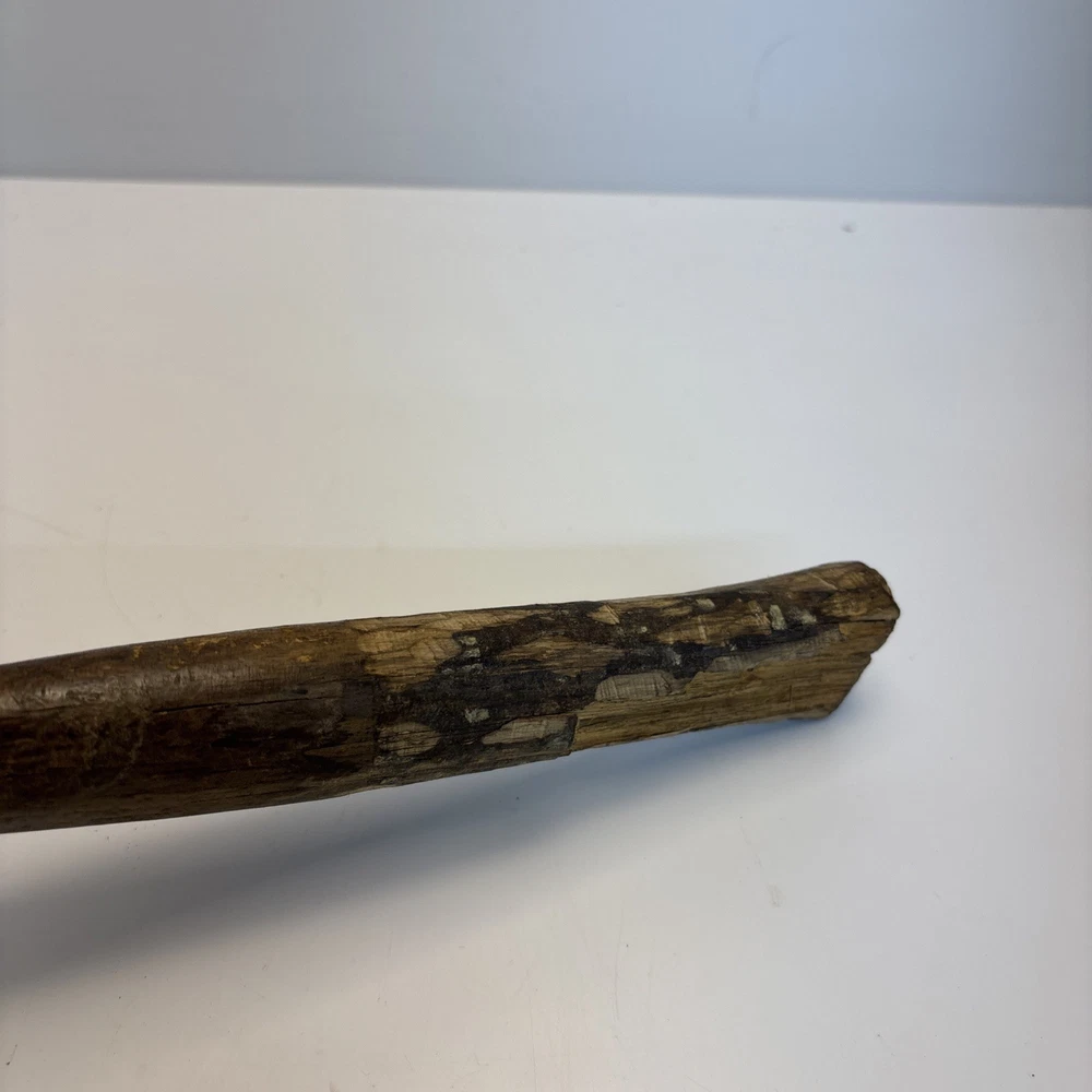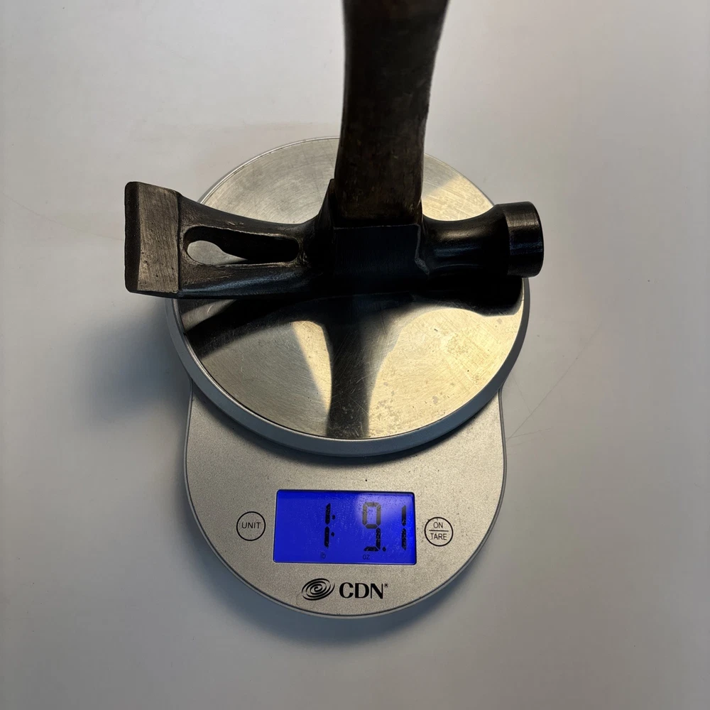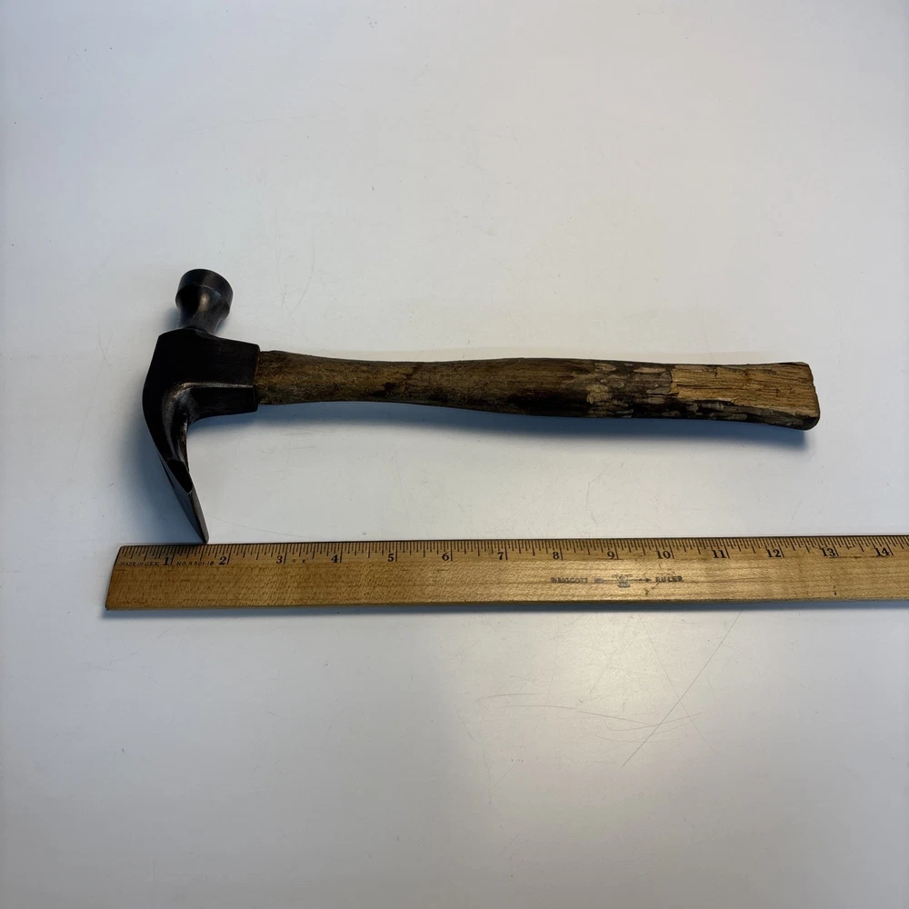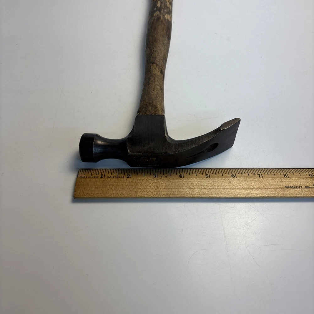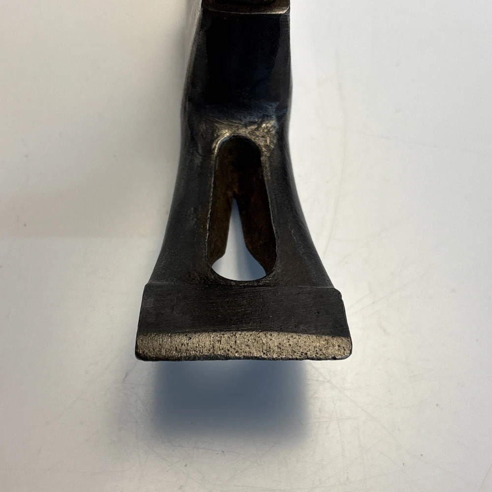 Vintage unmarked mason / bricklayer hammer with slotted nail puller claw. Forged steel head with smooth round striking face and wide blade-style claw featuring keyhole nail slot. Traditional wood handle. No visible maker’s marks. See photos for complete details. Condition Pre-owned vintage condition. Head is slightly loose on the handle. Bottom of the wood handle is cracked and missing a section. Normal surface wear from age and use. See photos for complete details.
