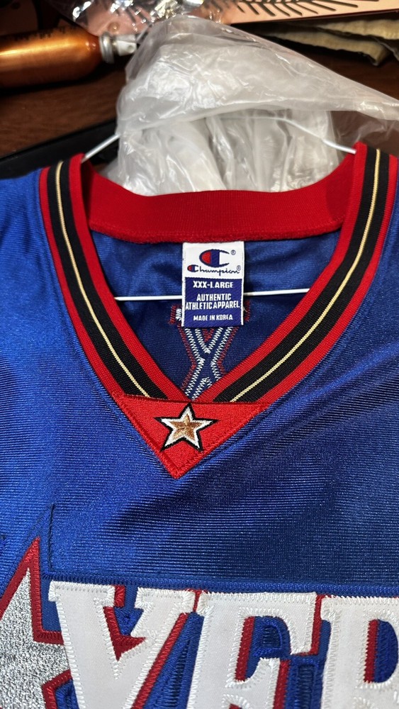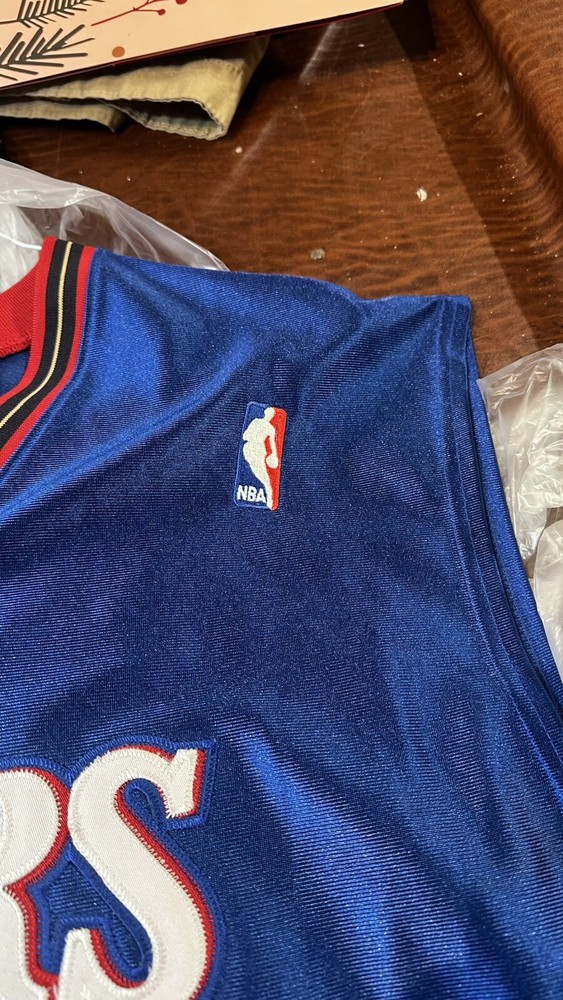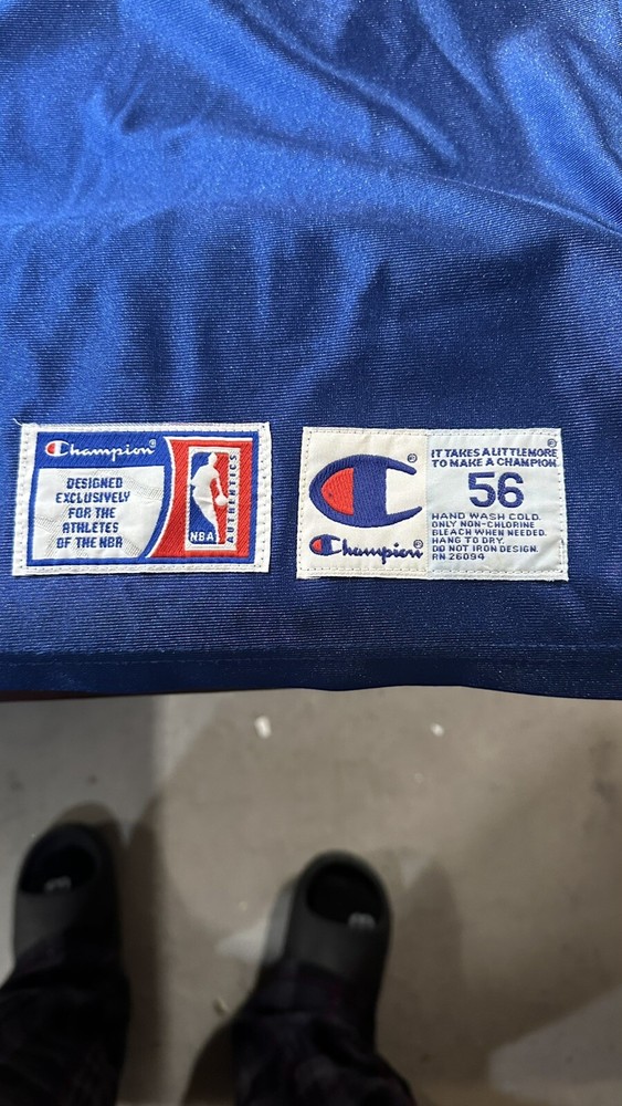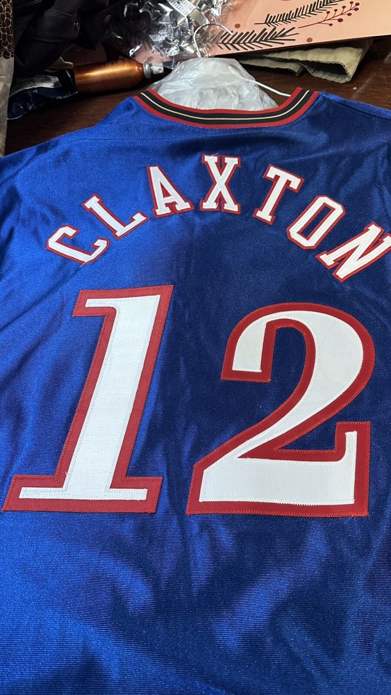 The product is an Authentic Speedy Claxton Philadelphia 76ers Champion Jersey in a vintage size 56. This very rare blue jersey is associated with the National Basketball Association (NBA) and is designed for basketball fans and collectors alike. The jersey features the Champion brand logo and is a unique piece for fans of the Philadelphia 76ers or those looking to add a rare item to their sports memorabilia collection.