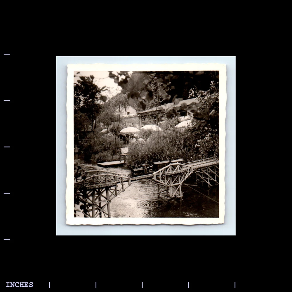 Vintage Square Photo MINIATURE MODEL TRAIN CROSSING RIVER RESTAURANT LANDSCAPE