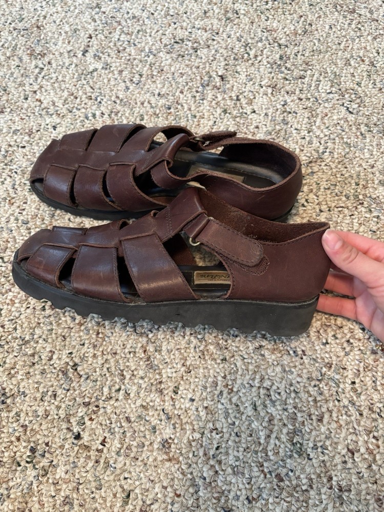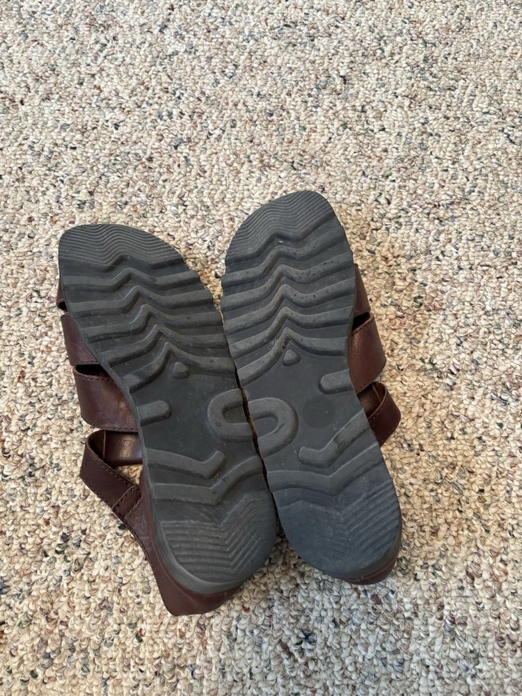 These Vintage St. John’s Bay Brown Leather Fisherman Sandals for women in size 7.5 are the perfect casual footwear for summer and spring. With a solid brown color and low heel height, these leather sandals offer both style and comfort. The fisherman style adds a touch of nostalgia to your outfit, making them a unique choice for everyday wear. The leather lining, upper material, and outsole provide durability and quality, ensuring you can wear these sandals for years to come. Perfect for pairing with shorts, skirts, or dresses, these sandals are a versatile addition to any wardrobe.