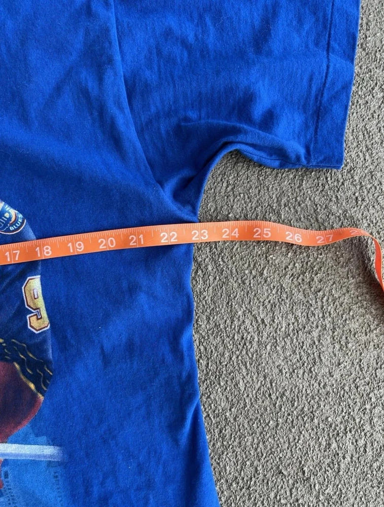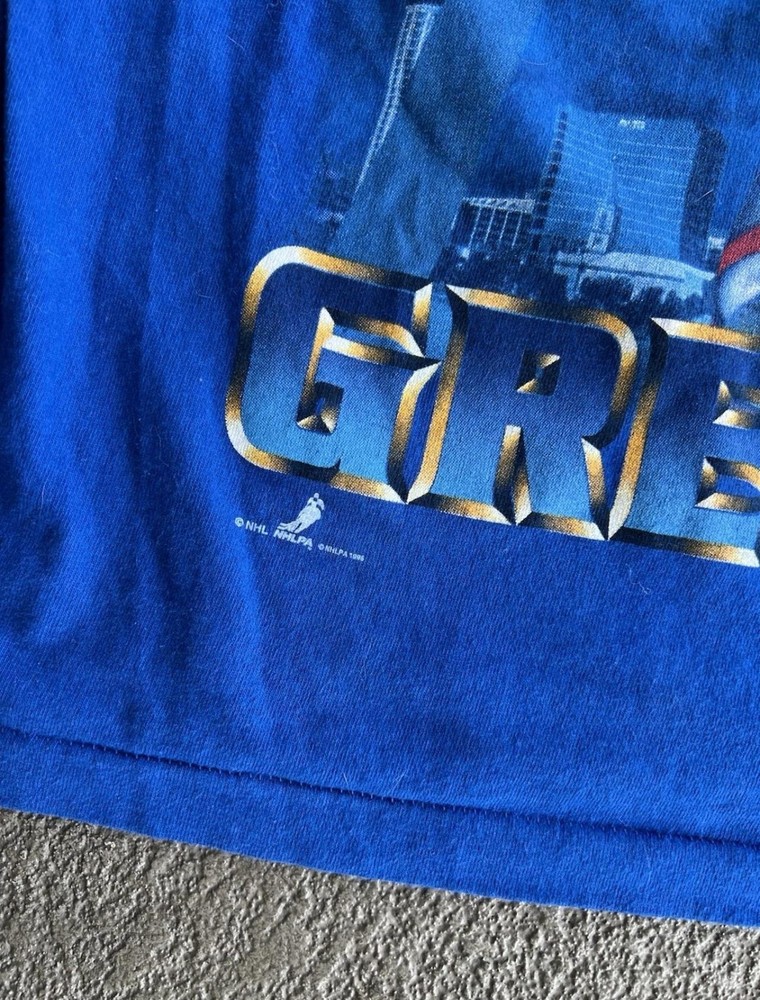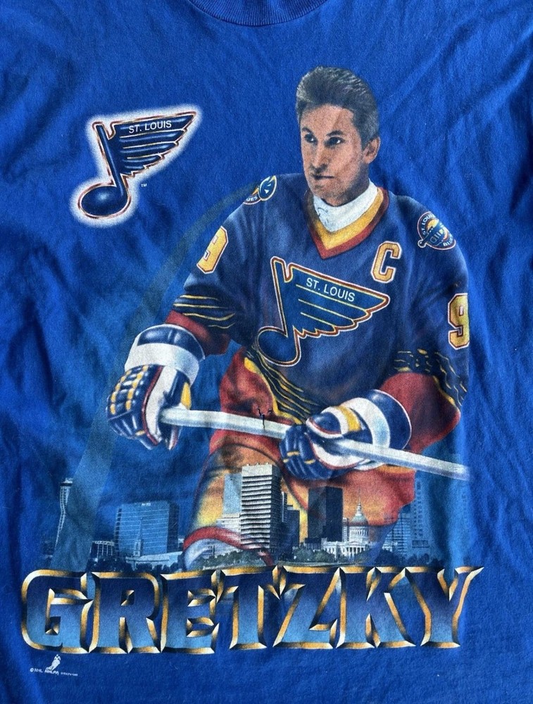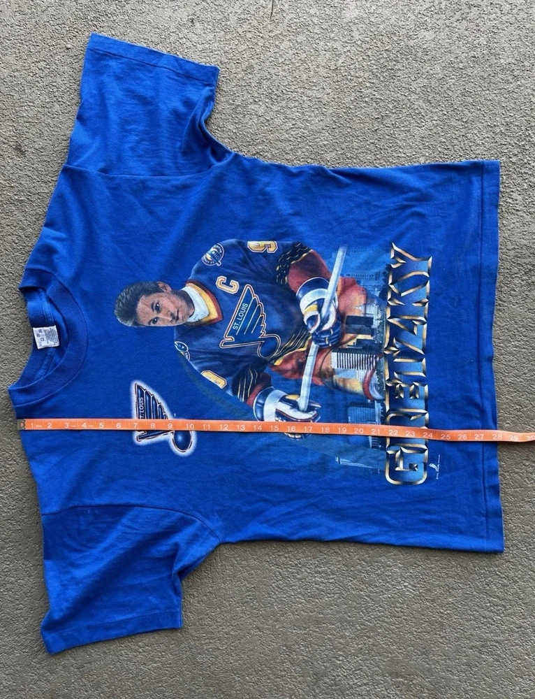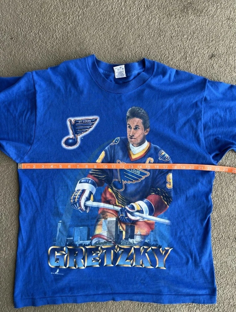 Vintage St Louis Blues Shirt Mens Large Blue NHL Hockey Wayne Gretzky Salem 90s Condition: Good vintage condition, some light wear consistent with age. Notable flaws include a small faint mark on the back and a small spot on one sleeve (see photos). Made in USA by Salem Sportswear. Tag size Large. 100% cotton. Features: Bold graphic of Wayne Gretzky in his St. Louis Blues uniform on the front, with cityscape background and 'Gretzky' in large font. St. Louis Blues logo printed on graphic. Officially licensed NHLPA graphic dated 1996. Measurements (approx.): - Pit to Pit: 23 inches - Length (top of collar to hem): 27 inches Color: Blue with multi-color print Short sleeve crew neck, single stitch hems, classic 90s boxy fit Era: 1990s, guaranteed original vintage Hard-to-find Wayne Gretzky St Louis Blues graphic, perfect for collectors and hockey fans