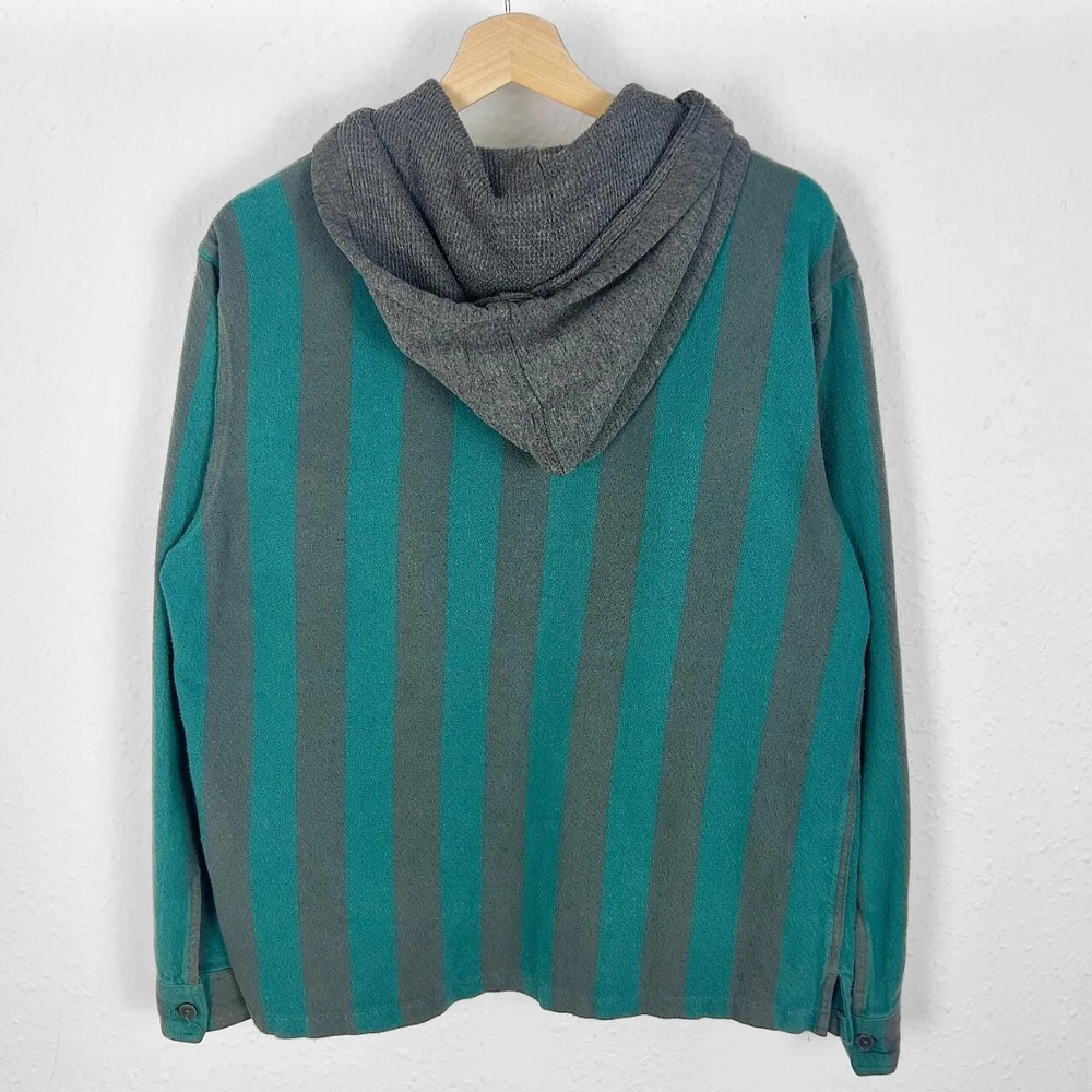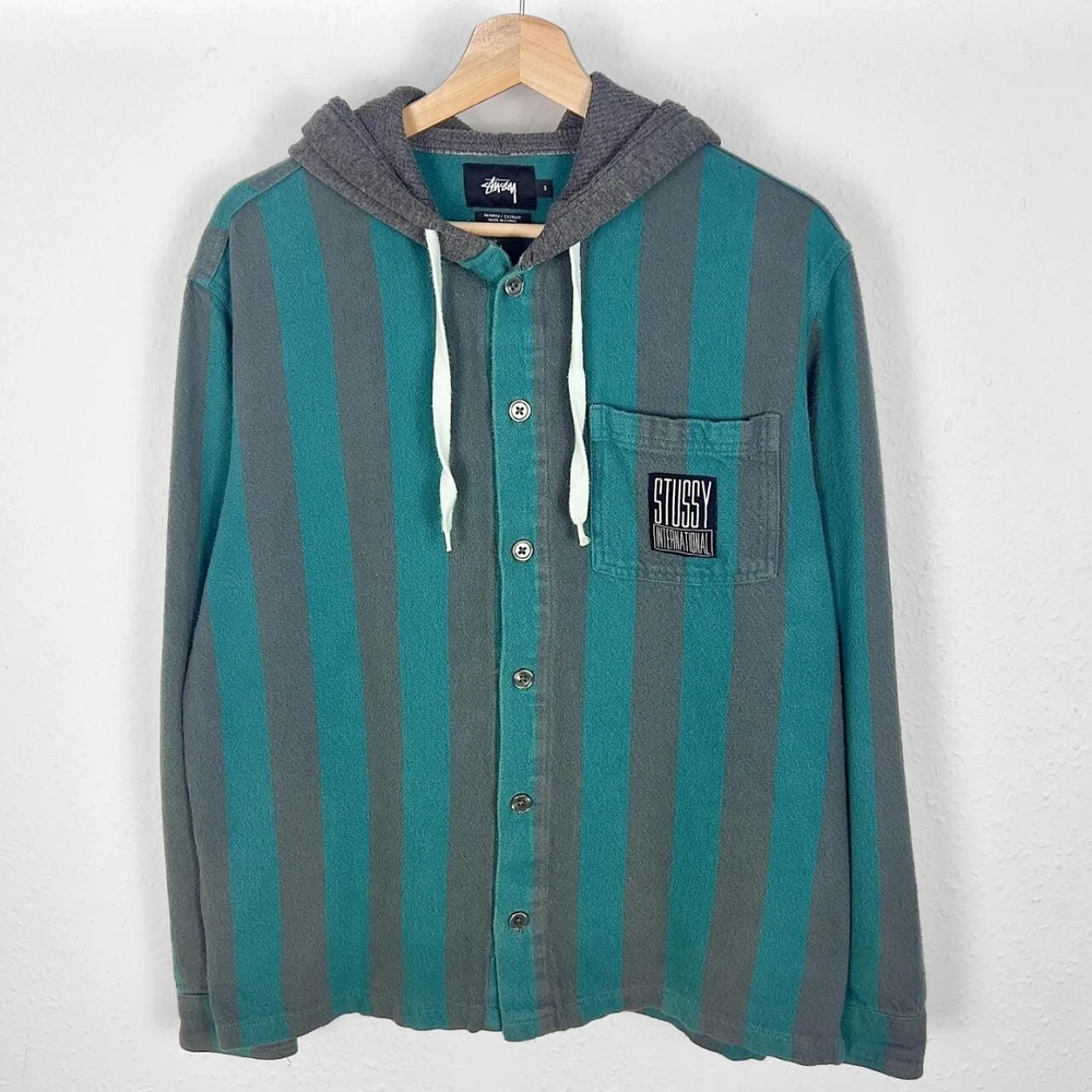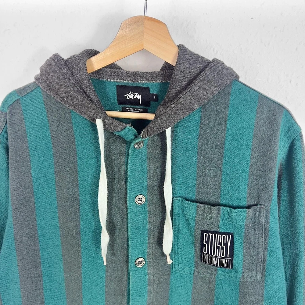 Theme: 90s Size Type: Regular Brand: Stussy Fit: Regular Colour: Green Pattern: Striped Type: Button-Up Department: Unisex Adults Size: S Features: Hooded Neckline: Collared