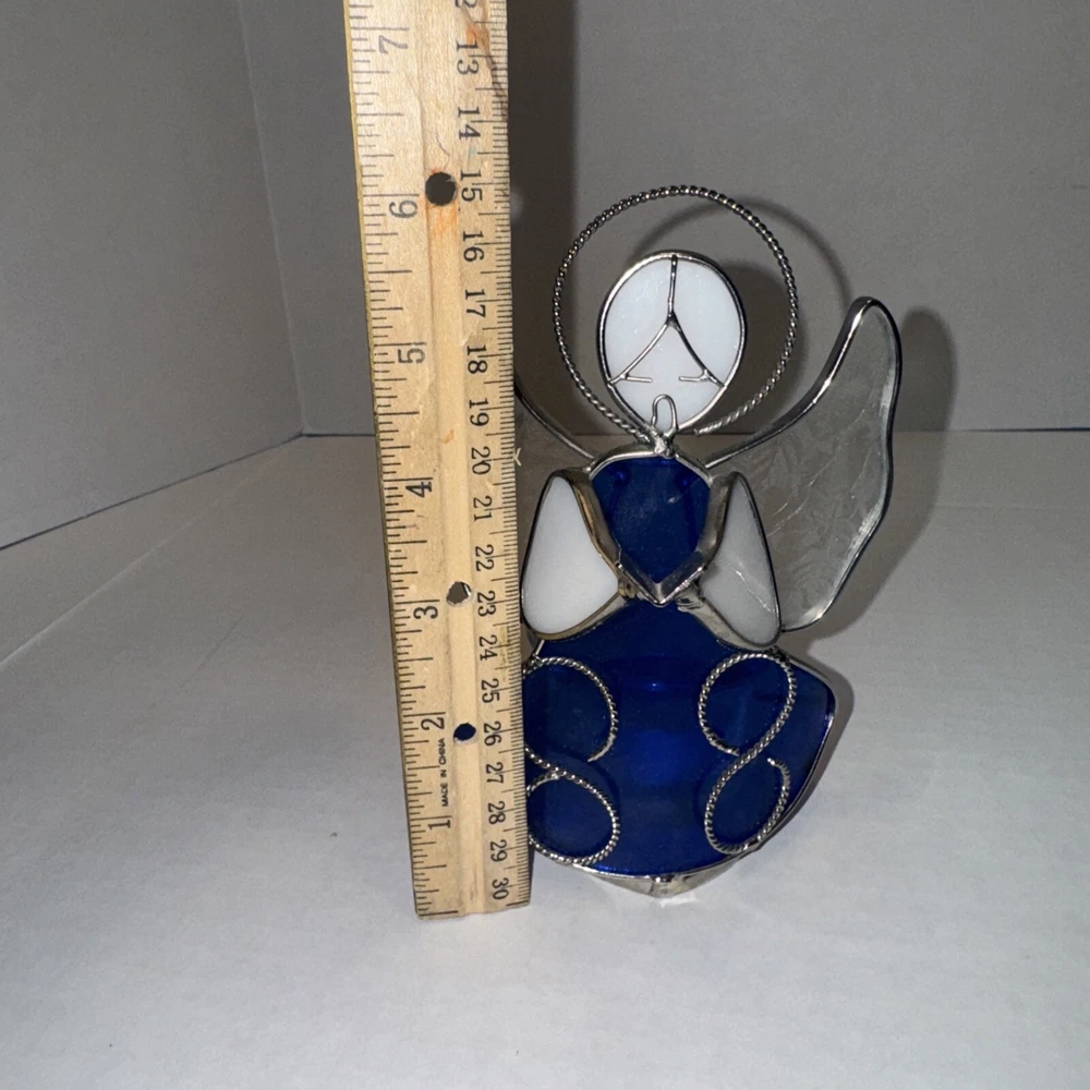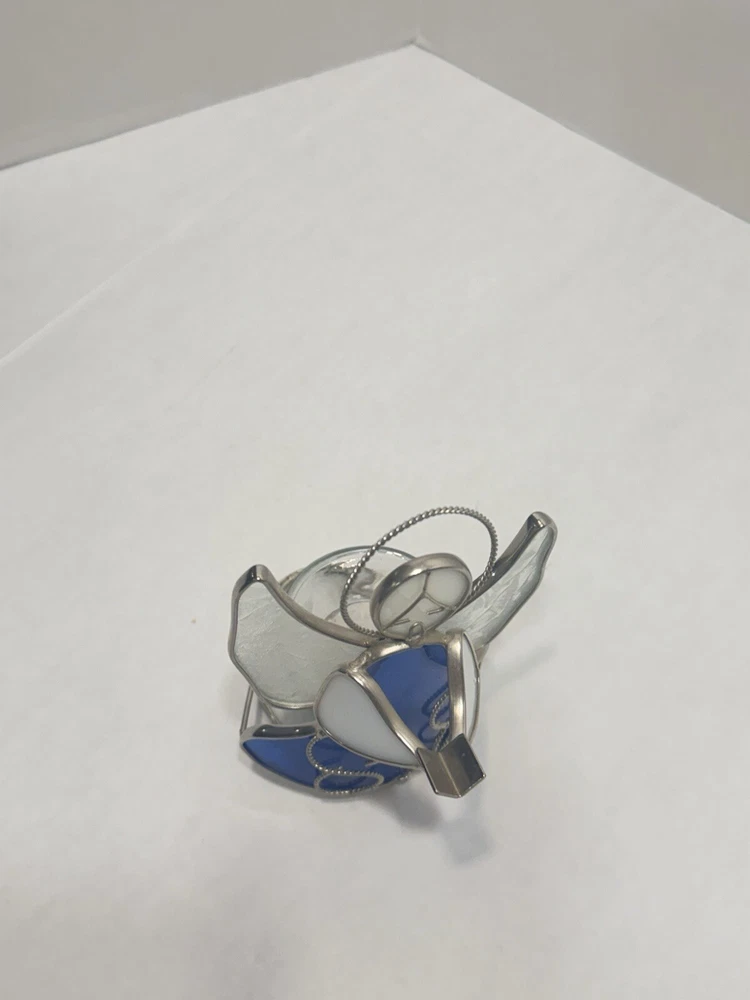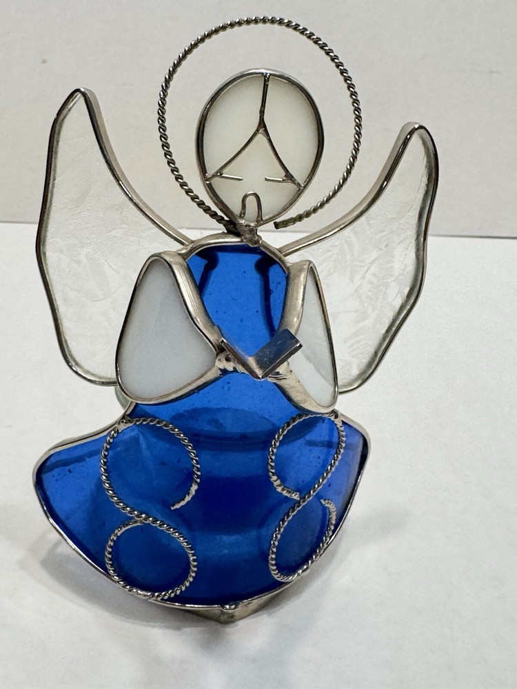 This Vintage Stained Glass & silver metal Choir Angel Candle Holder features a unique design of a choir angel holding a songbook and wearing a halo. The tealight holder is made of silver metal material with stained glass accents in blue, white, and frosted clear colors, adding a touch of elegance to any space. Standing approximately 6" in height Please feel free to call me with any questions you have