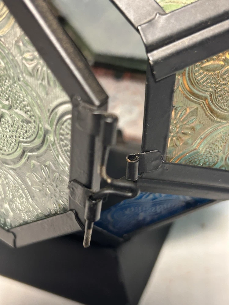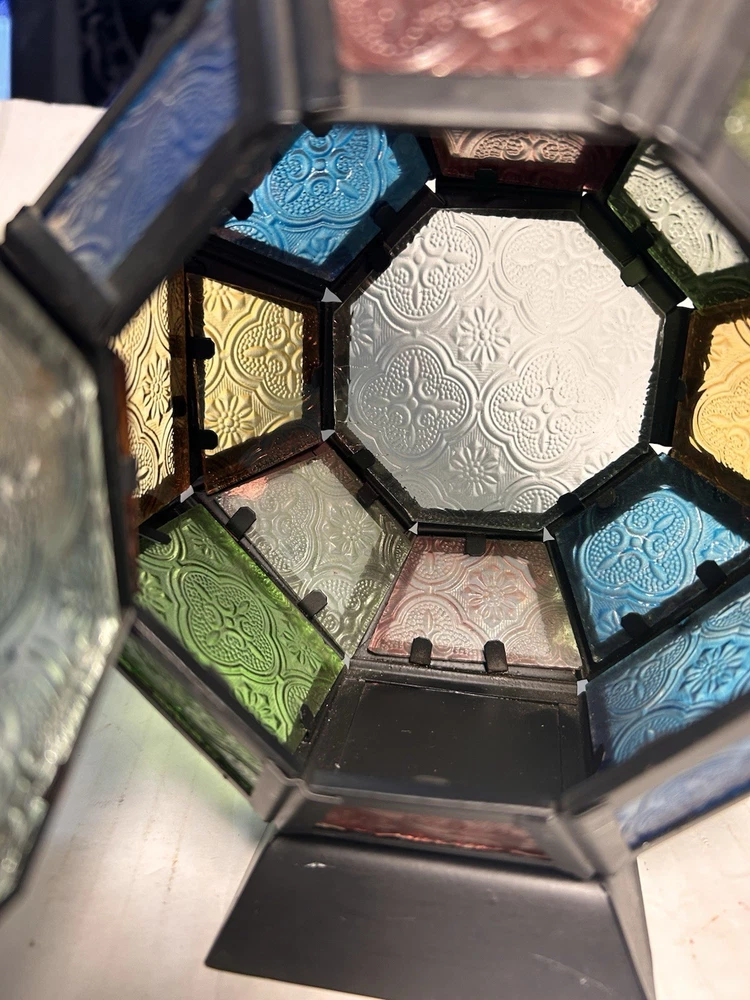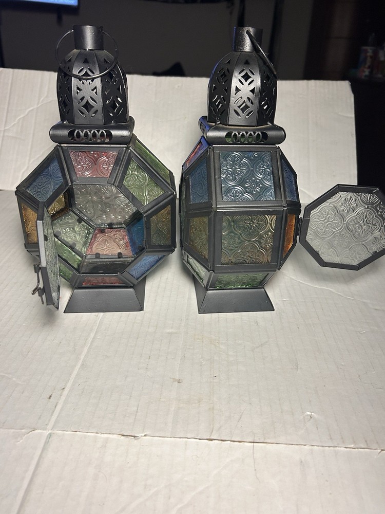 (Lot of 2) vintage stained glass candle holder. They are absolutely beautiful when lit up in the dark ! Features stained glass and swinging door with latch. The door swings outward to the left. I’ve cleaned them the best I can, but the glass could be taken out and cleaned a little better, perhaps I was being a little too careful . But They would look even better if one word to do that . There is nothing broke and the only thing missing is one chain .. They’re both in excellent condition. I do have the one chain that I will include, cannot find the other. I do not know the brand of these because there is no markings or engraving stating so. They do have a vintage rustic look, perfect for any holiday you choose, including Halloween! Ps, If one wanted to they can go to a department store, like Home Depot or Lowe’s or som ewhere similar to get matching chains, ideally black . But whatever color you prefer. Add a touch of vintage charm to your home decor with these two beautiful stained glass candle lanterns. The hexagon shape and abstract pattern make them an ideal choice for adding a mystical and festive touch to your indoor and outdoor spaces. These lanterns are perfect for holding flameless/LED lights, candles, tea lights, and mini candles. ⭐️ Will ship within 2-3 business days! ⭐️ I will only accept return shipping if you do not receive the item listed in the ad or as described !